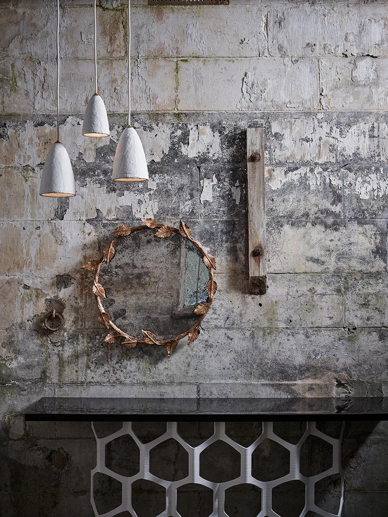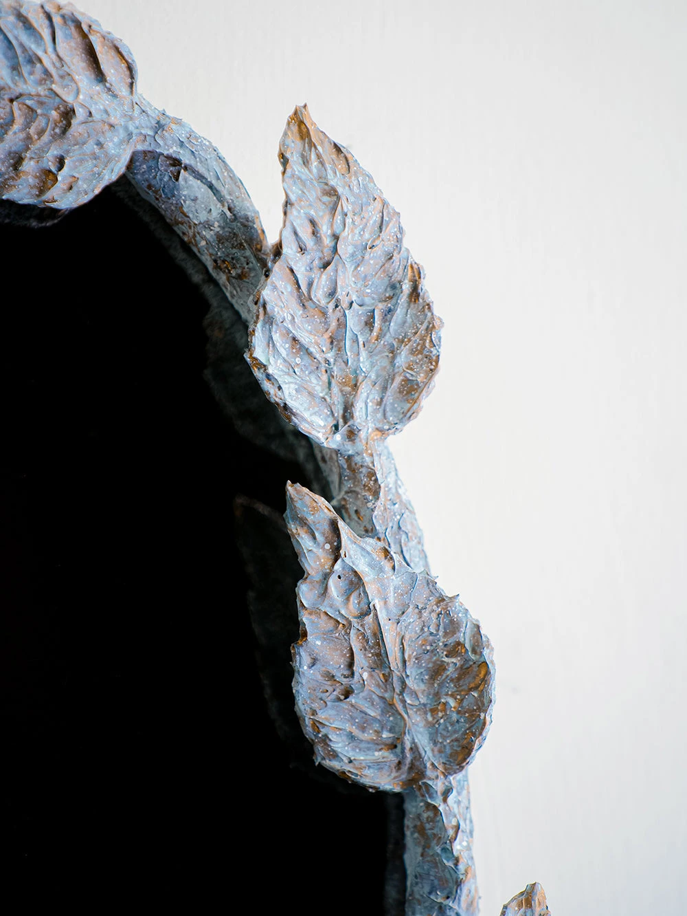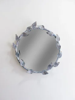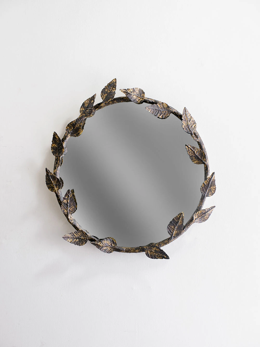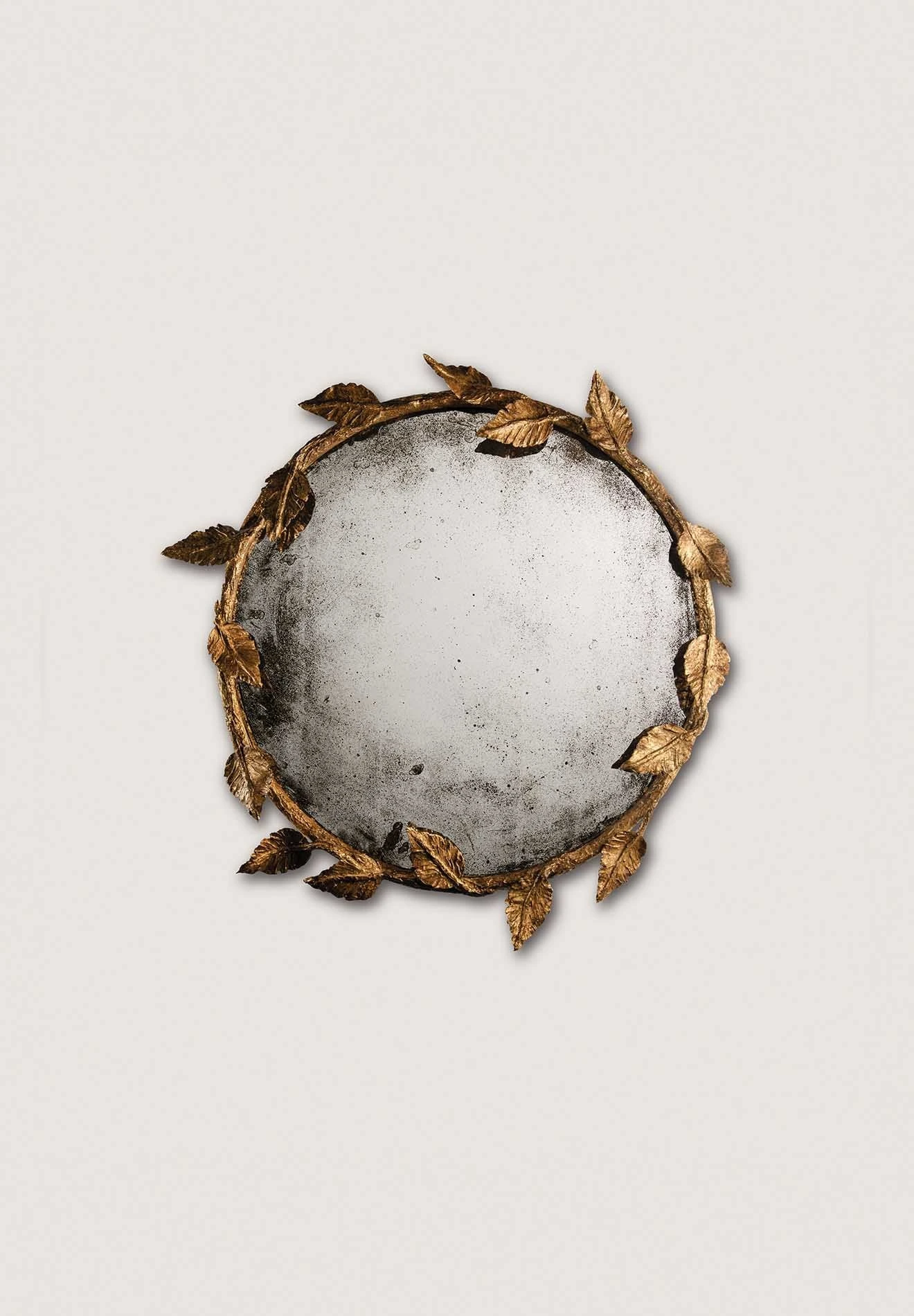 With its hand-cut metal leaves and textured circular frame, the Aurelia Mirror is based on a Roman metal garland. Each metal leaf has been covered in a thick layer of impasto to create a sculptural effect. The Aurelia is also available in large.