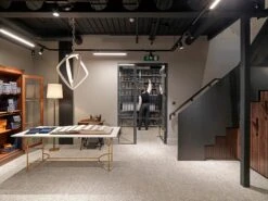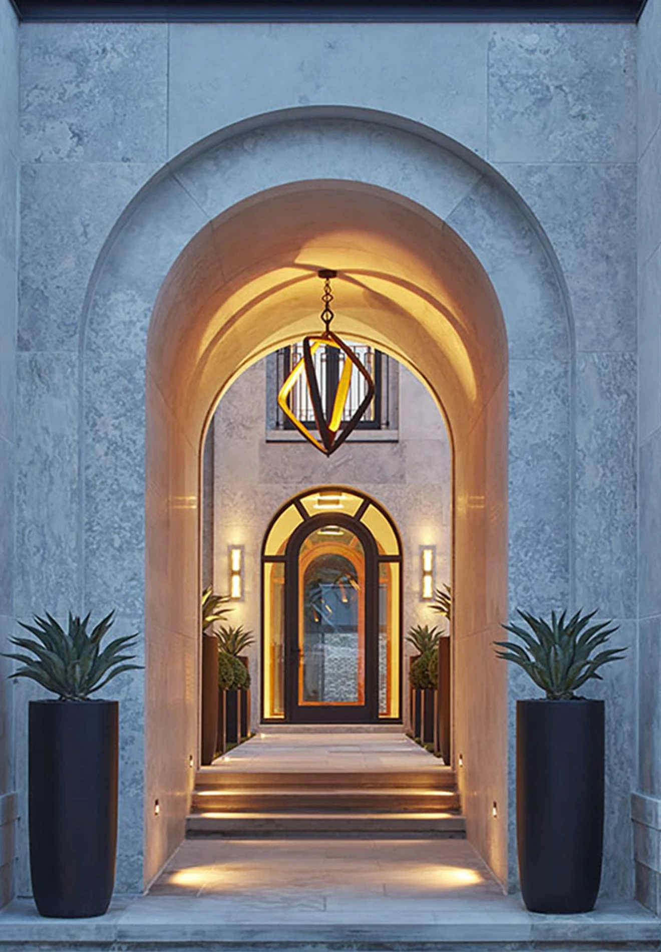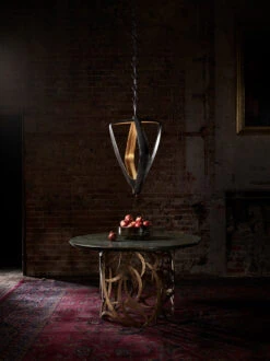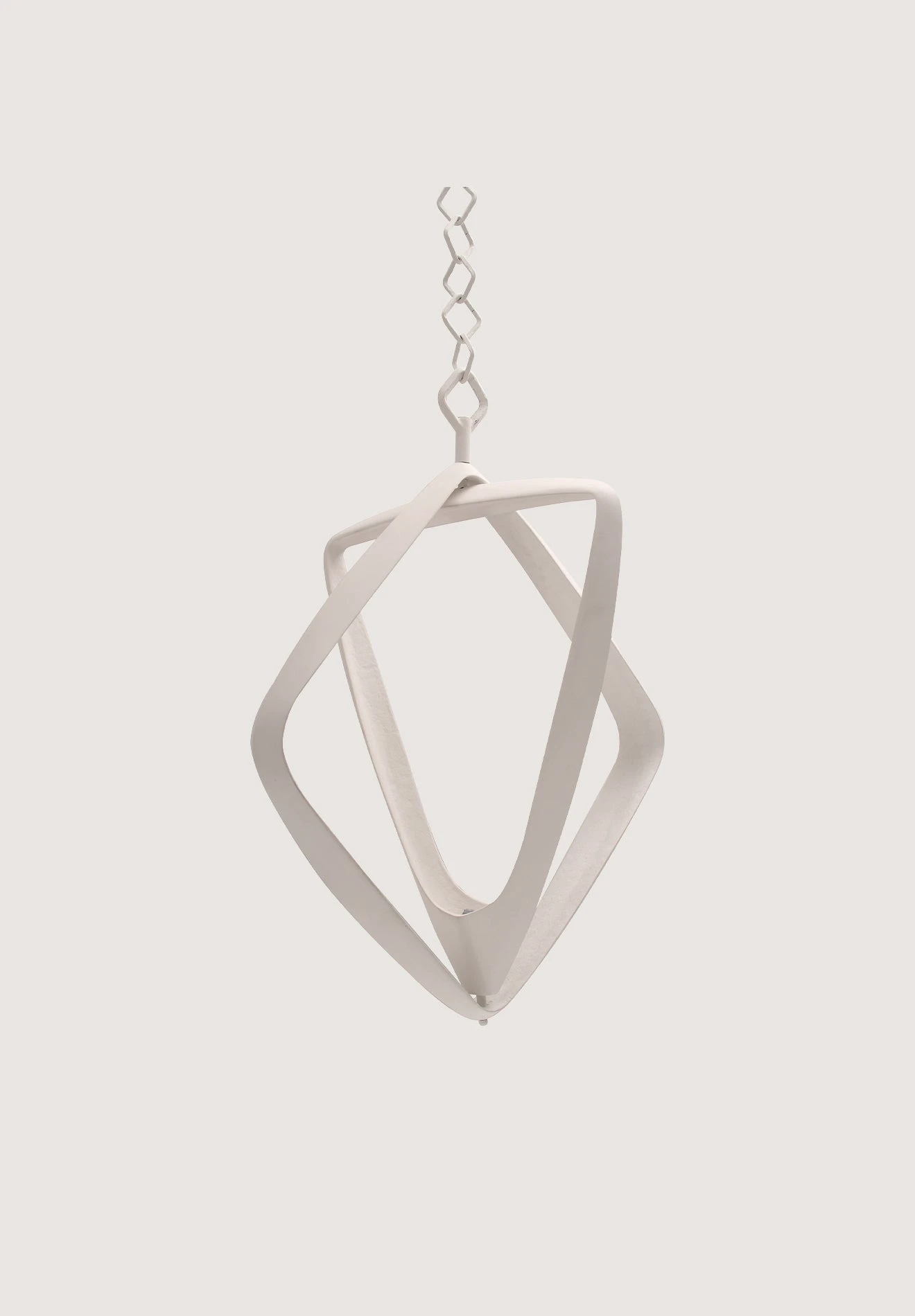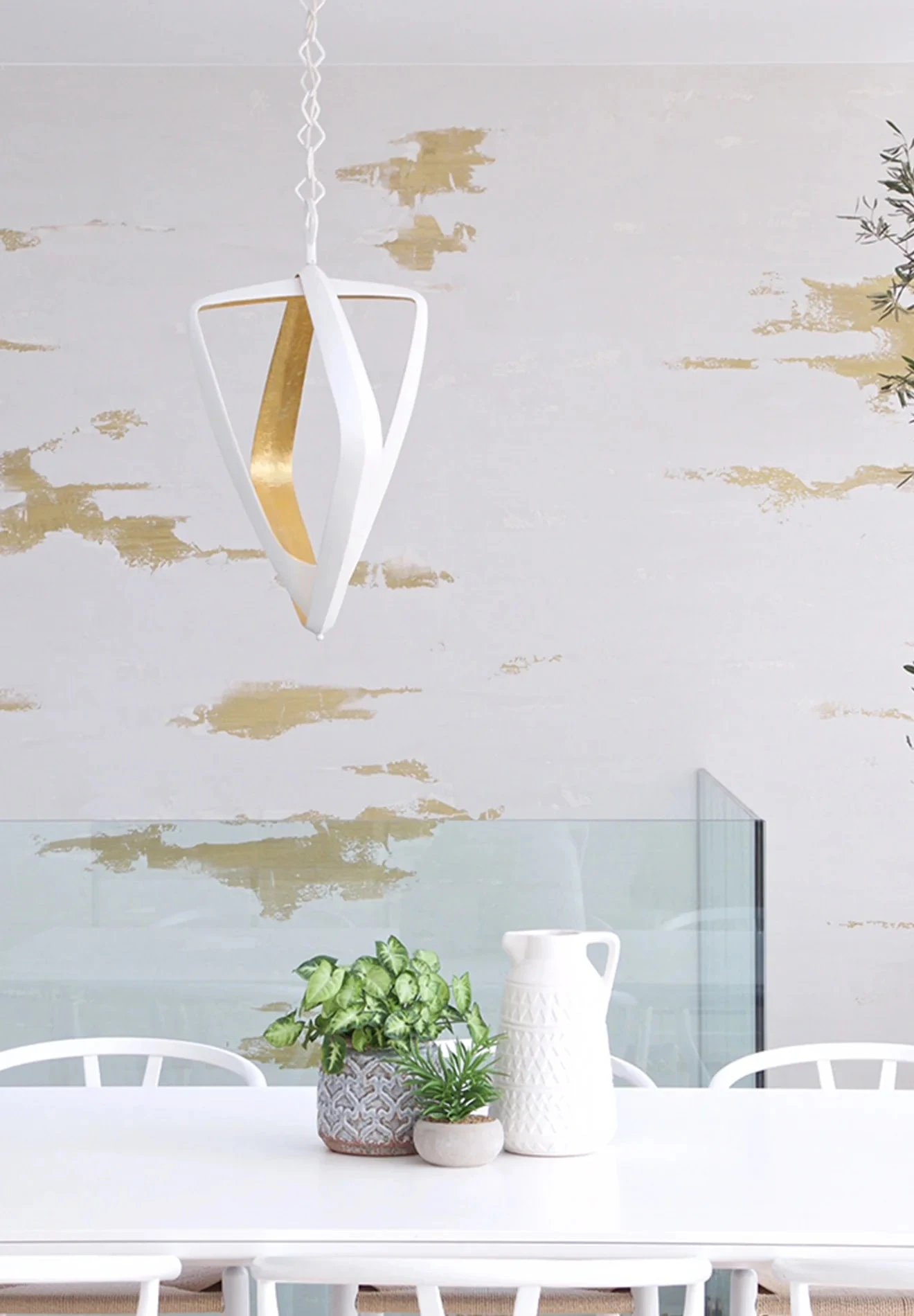 Formed of two interlocking triangular shapes, The Bianca Chandelier is characterised by its gently textured surface and contrast of finishes. The Bianca houses an LED light source that accentuates its dramatic shape.