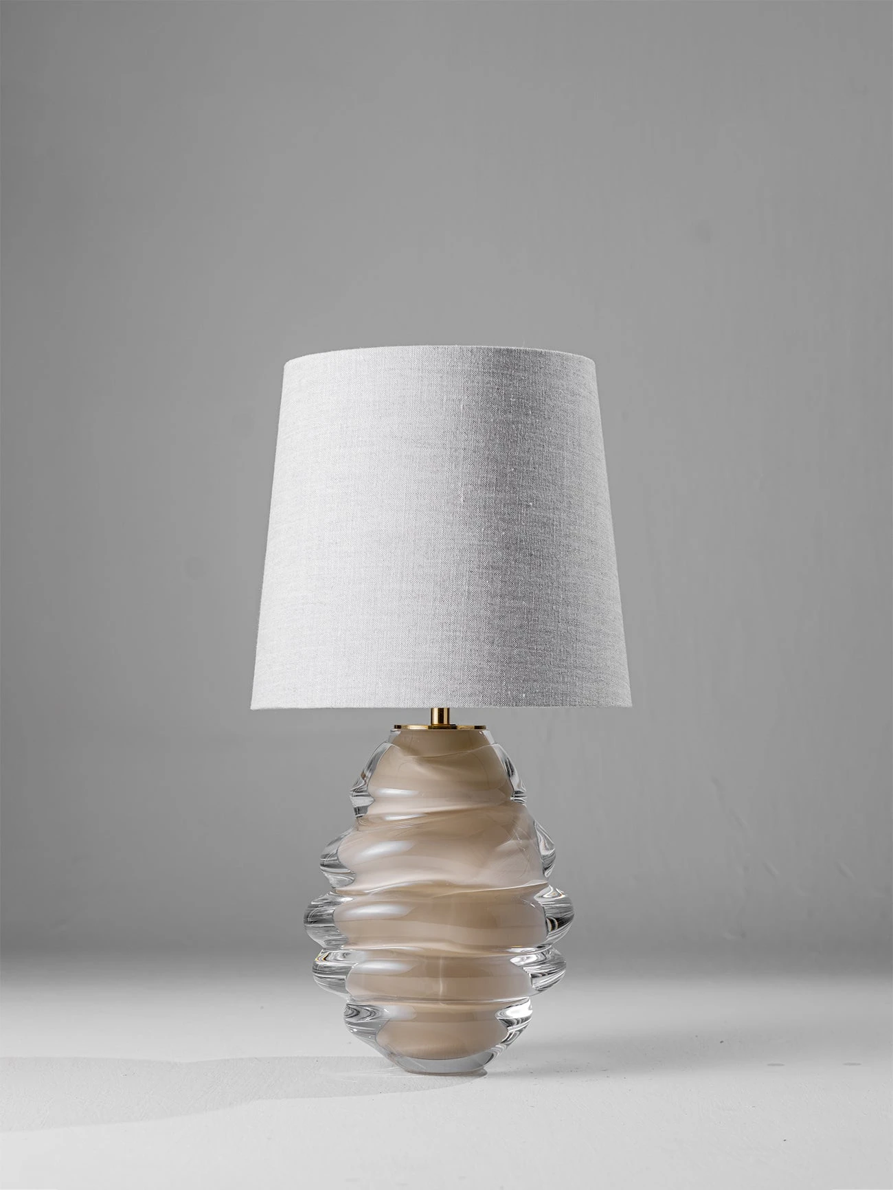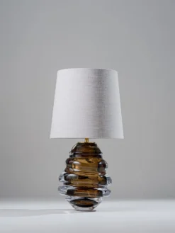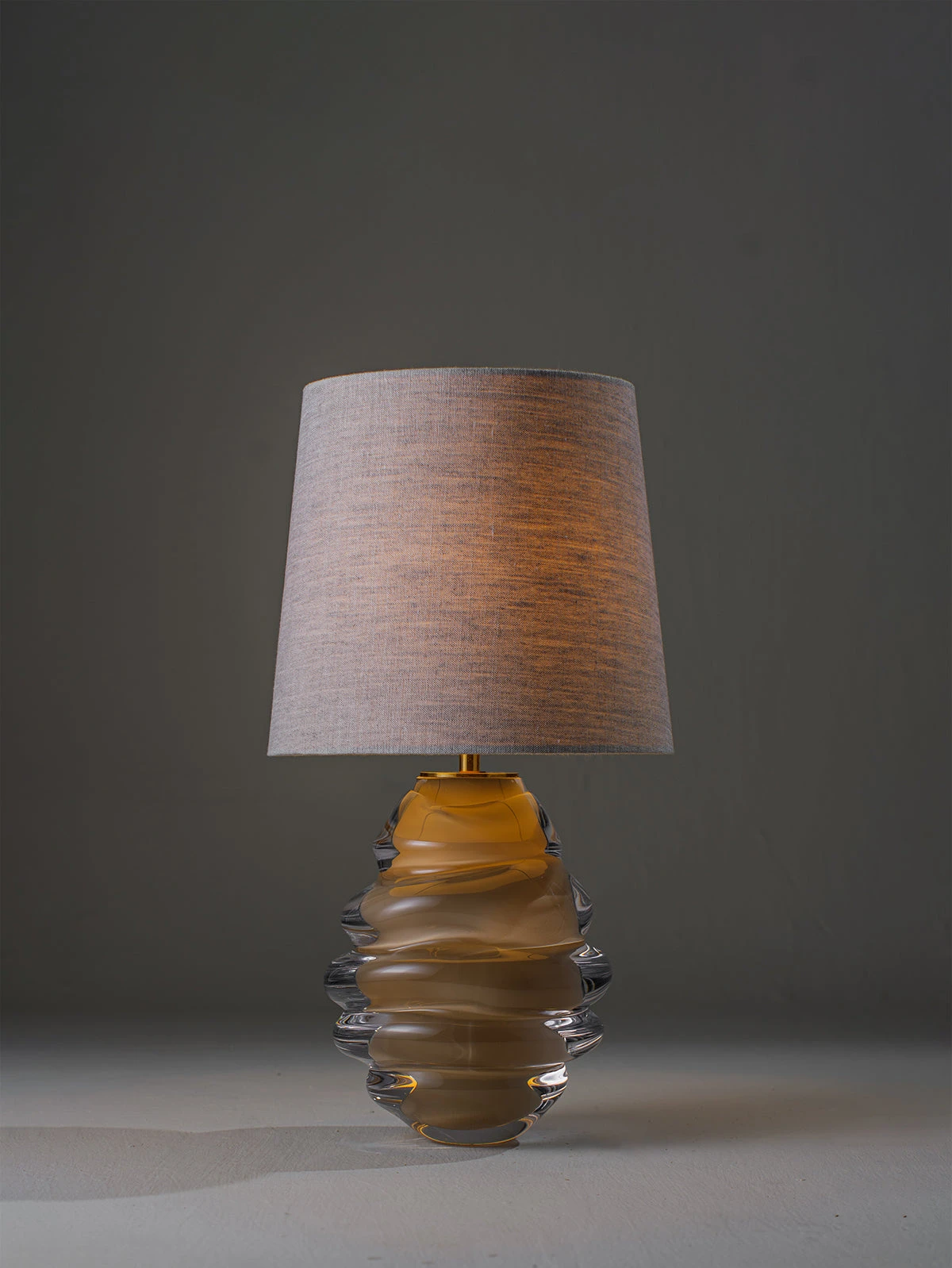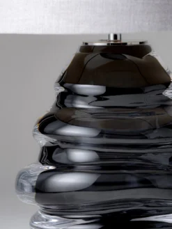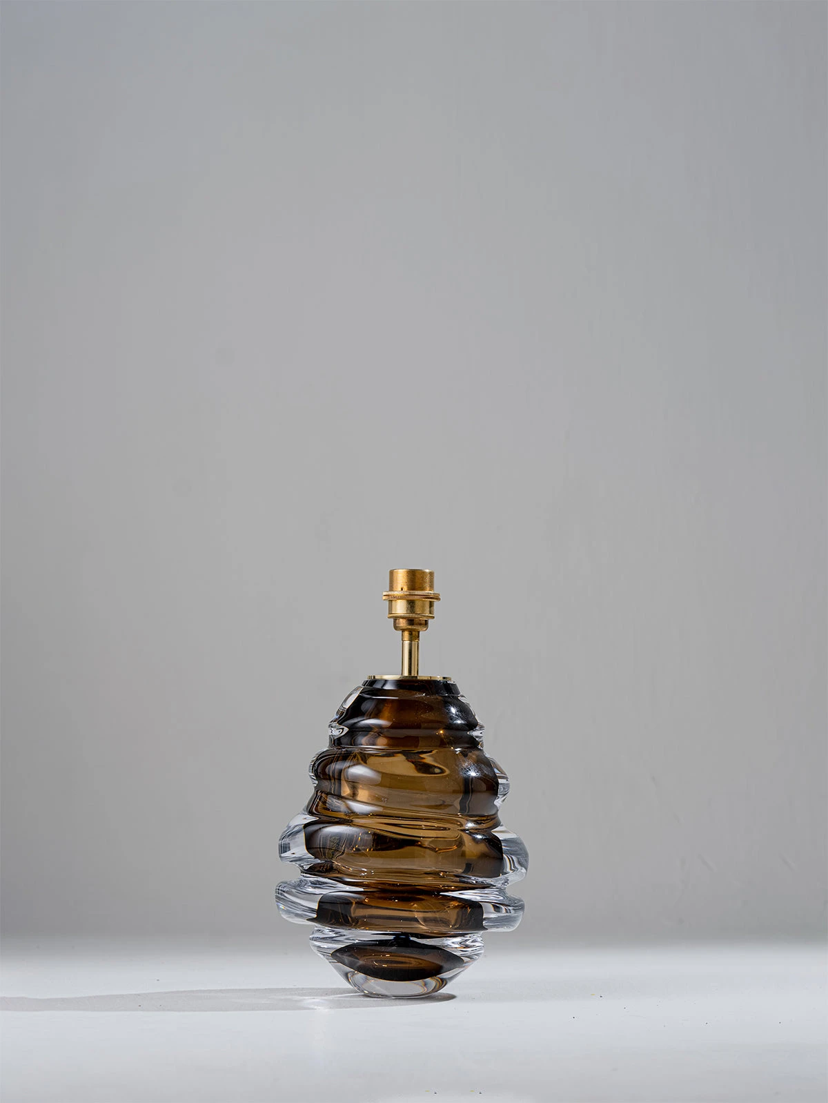 The Briony lamp is made from handblown glass. The centre, coloured in either Charcoal, Cedar, Moth or Clear is then encapsulated in thickly layered rich folds of clear glass, to create an even greater sense of depth.