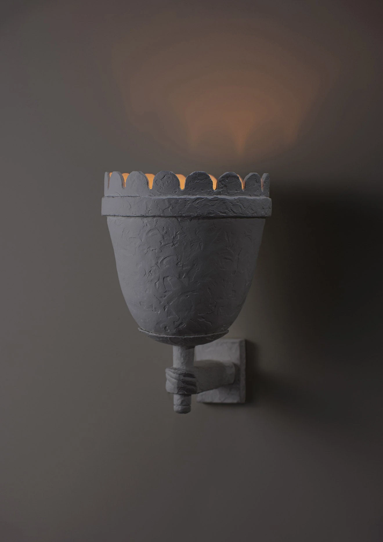 The Connie wall light, shaped like a bell, and in the style of a campaign tent, is hand-cast and then textured and hand-painted. Available in two orientations. Also available as a pendant light and in any custom painted finish.