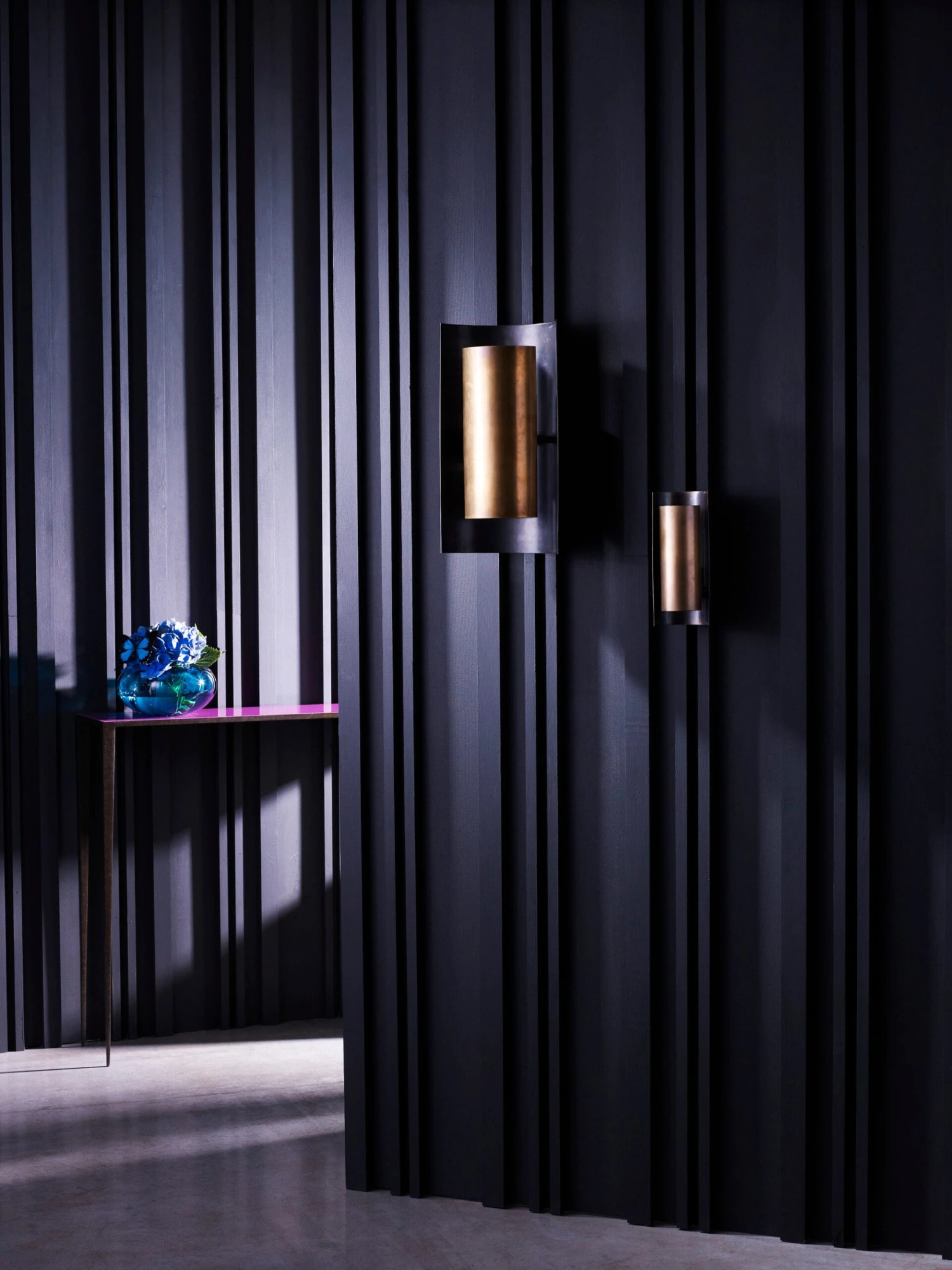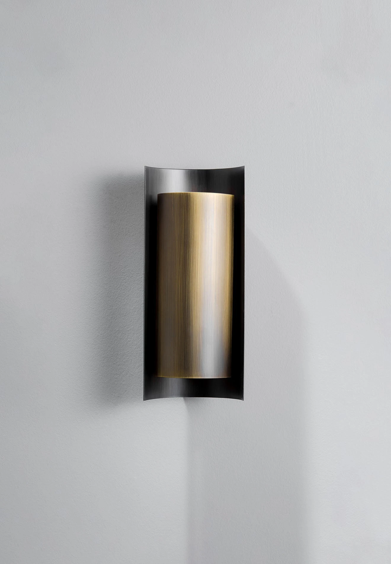 The contrasting concave and convex sheets of metal that form the Small Covex Wall Light houses a G9 lamp inside a frosted glass dome, lighting the piece from its centre.