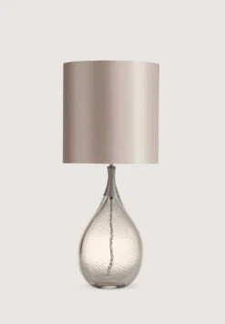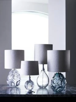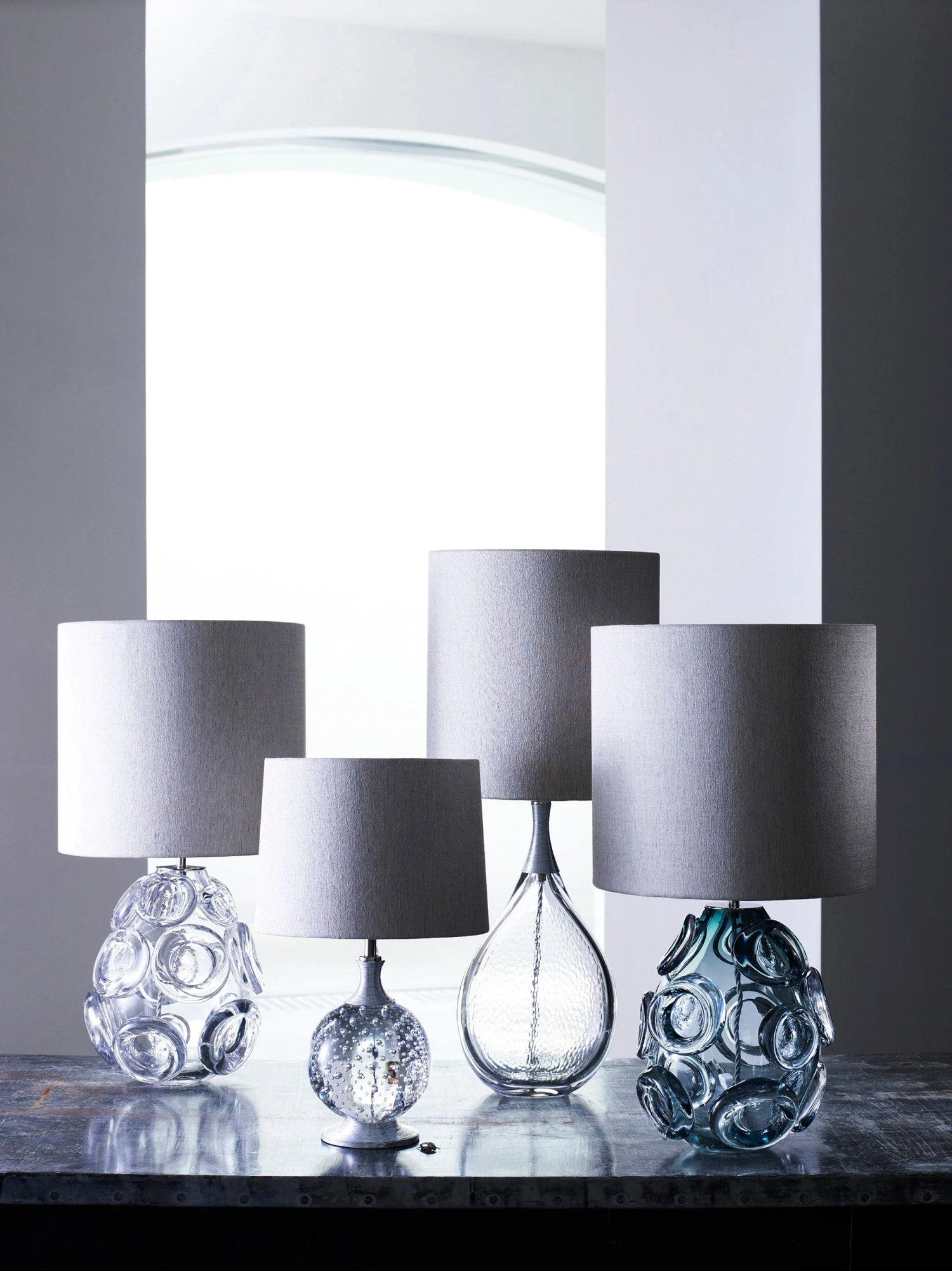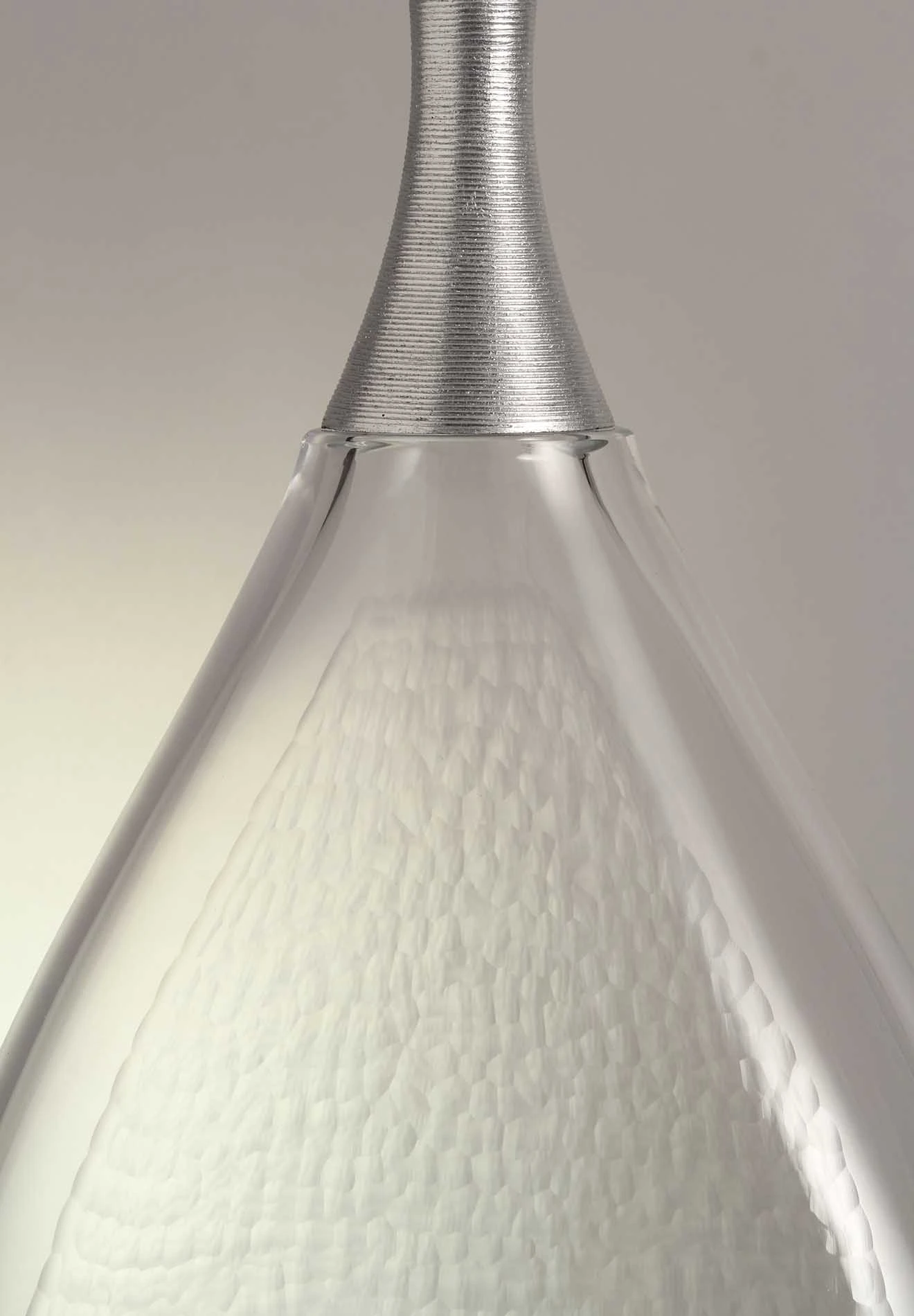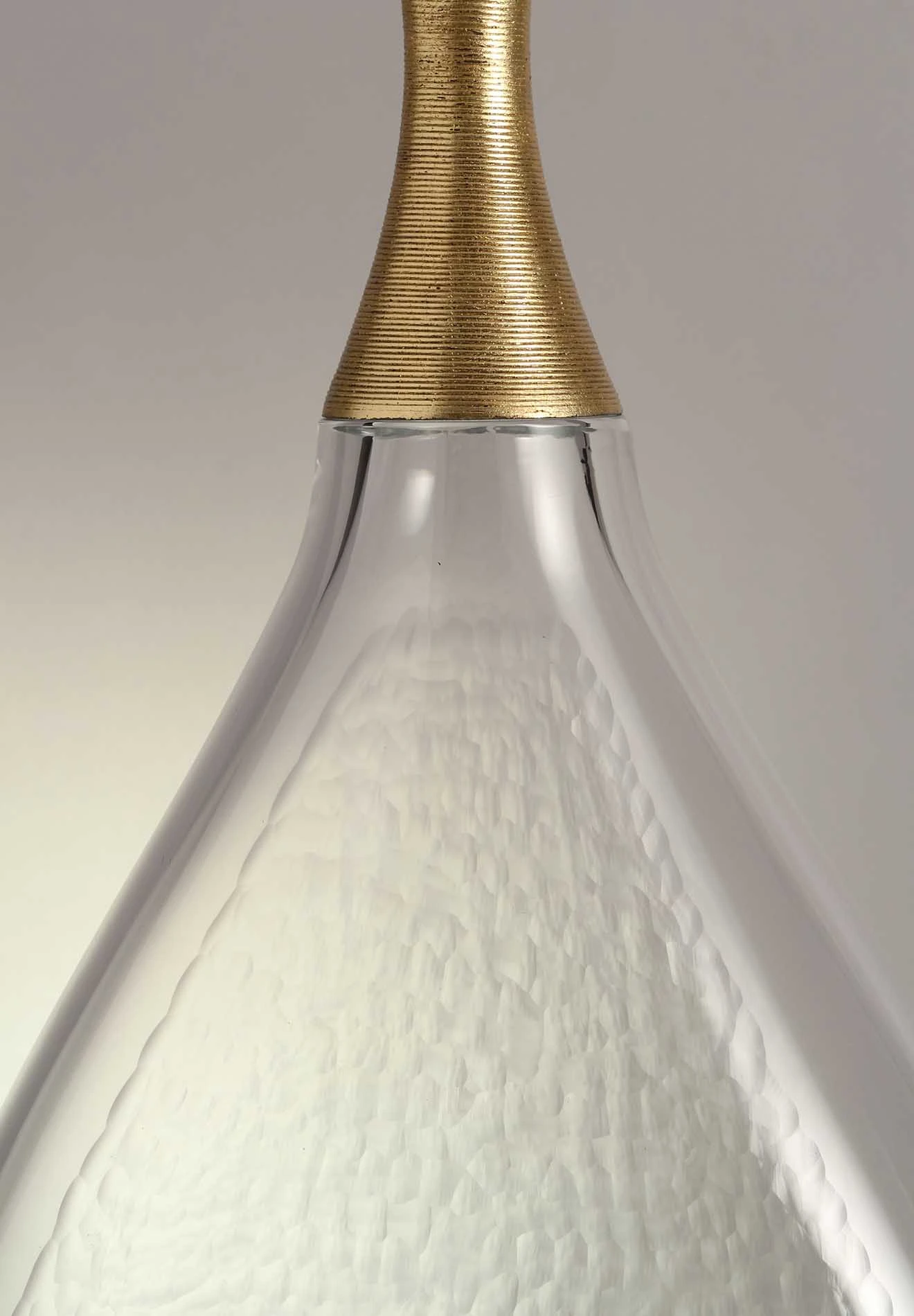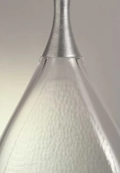 The Droplet lamp exemplifies the artistry of the glass blowing and texturing process, where smooth glass evolves into hand cut soft scallops. The slender neck of the piece is fitted with a spun textured collar.