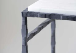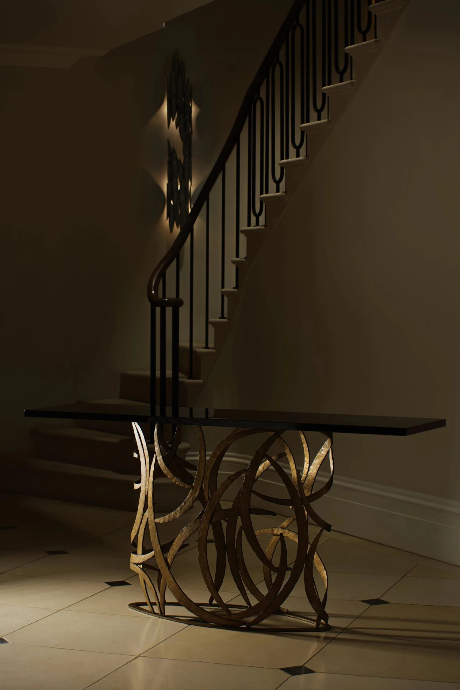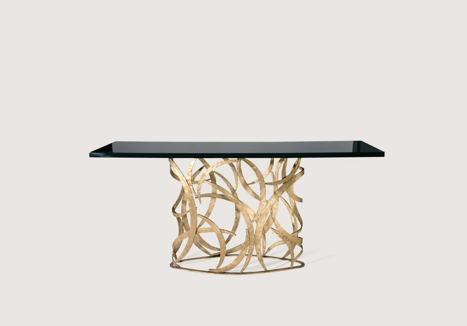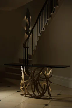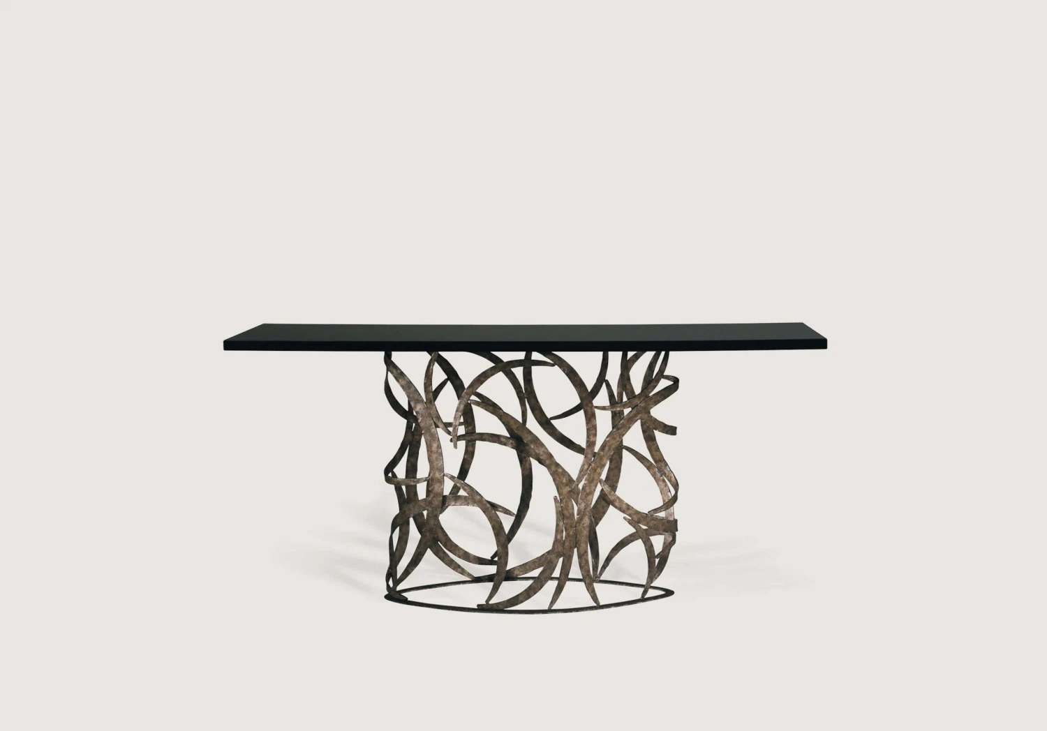 The Elliptical Miro Console Table was designed to complement the Miro pieces. The framework is a tour de force of metalwork, which delicately supports a far-reaching tabletop. Available with any wooden, marble top or lacquered top and can be custom sized.