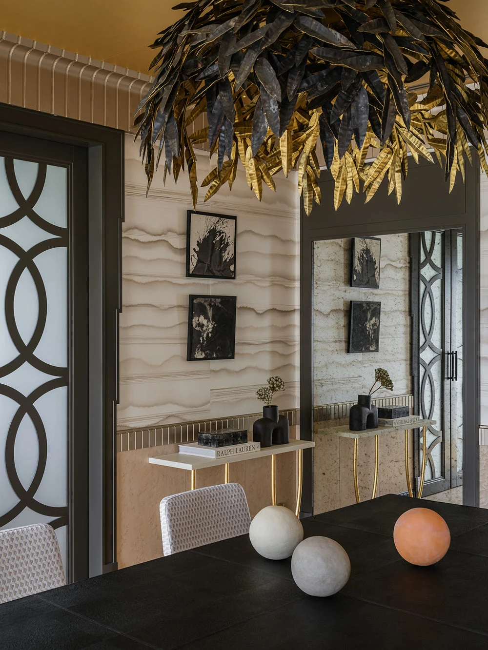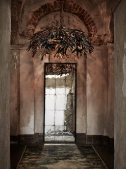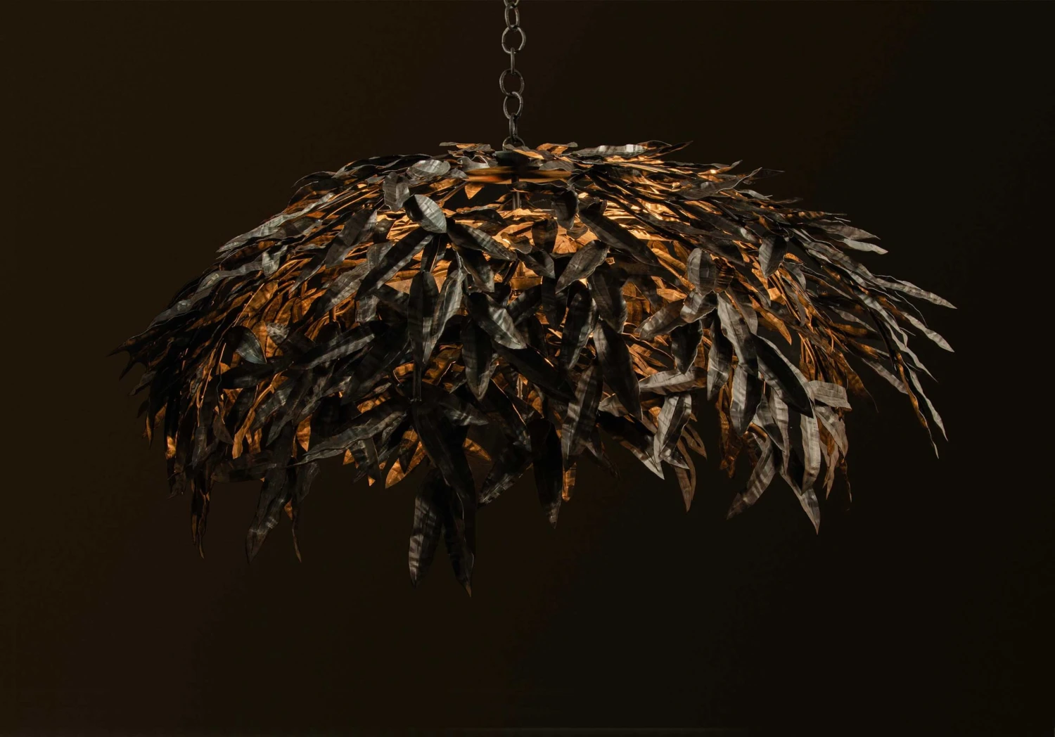 The Florence Chandelier takes its inspiration from a beautiful skirt designed in the West Indies. Hundreds of handmade and cut metal leaves hang down to form the asymmetric canopy. This design can be custom sized.