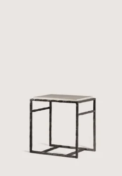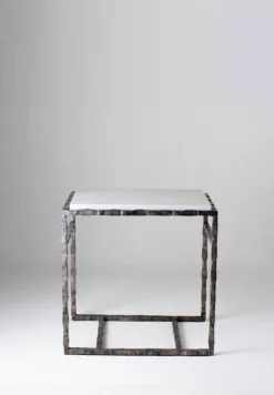 The Giacometti Side Table is constructed in a geometric square frame and hand-worked to create a textured metal bar and can be custom made to any size or finish.