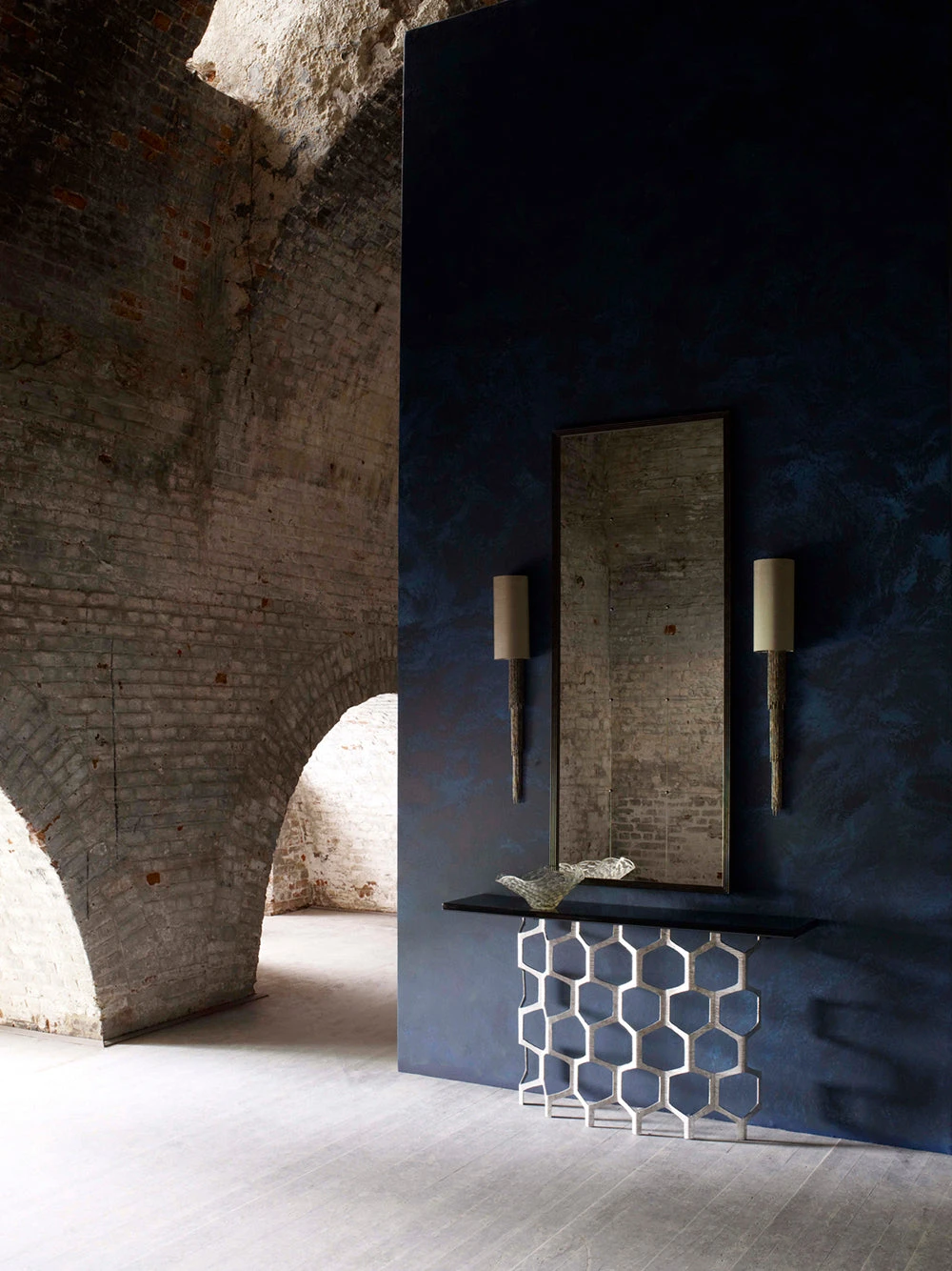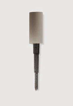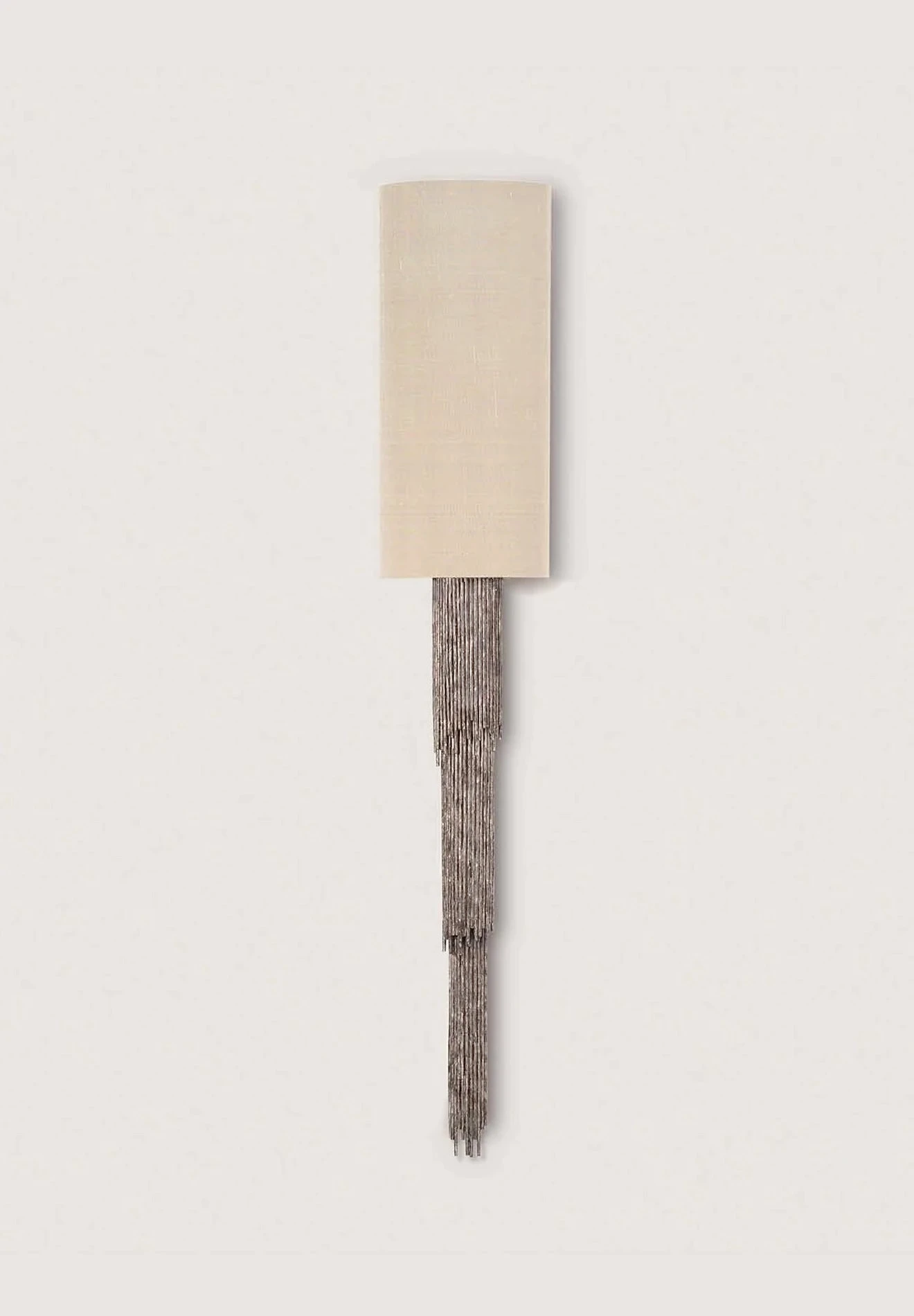 The Halley Wall Light is formed of thin shafts of hand cut and hammered metal that frames its shade.
