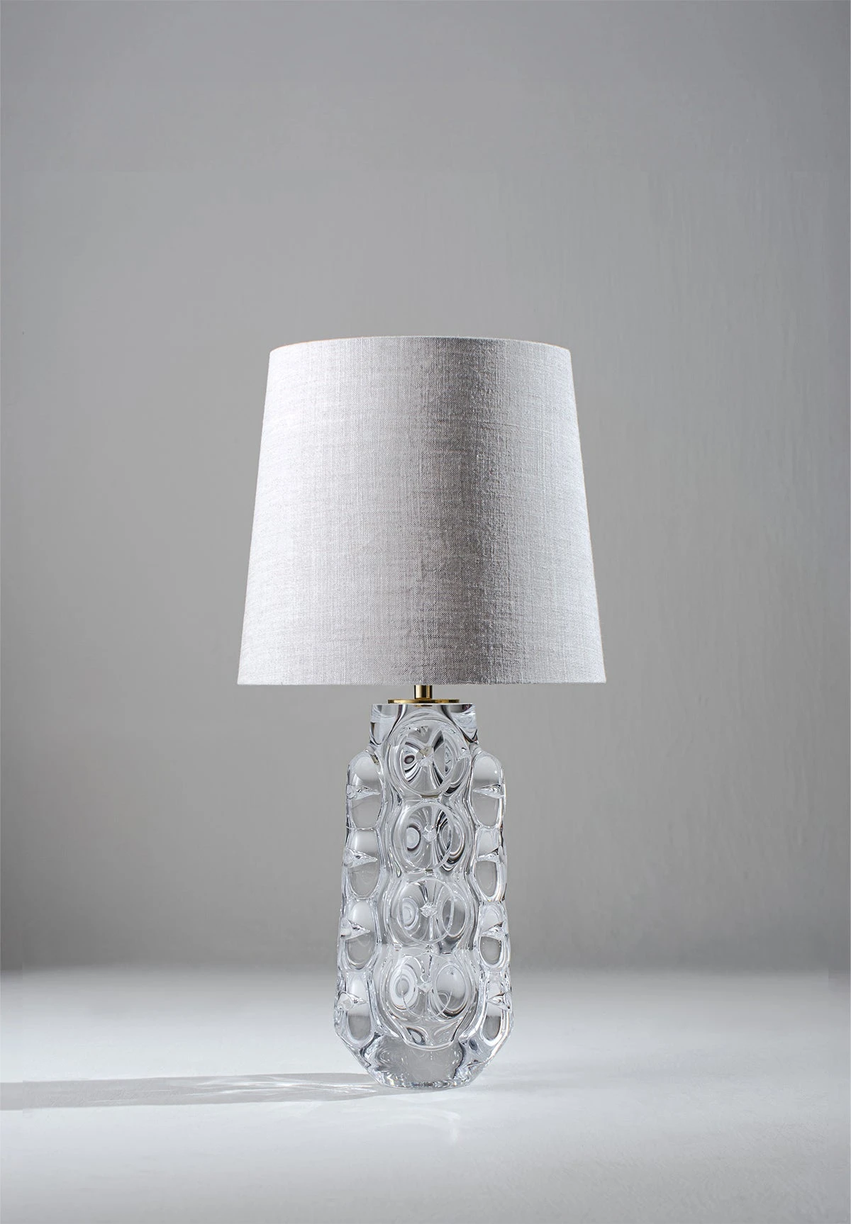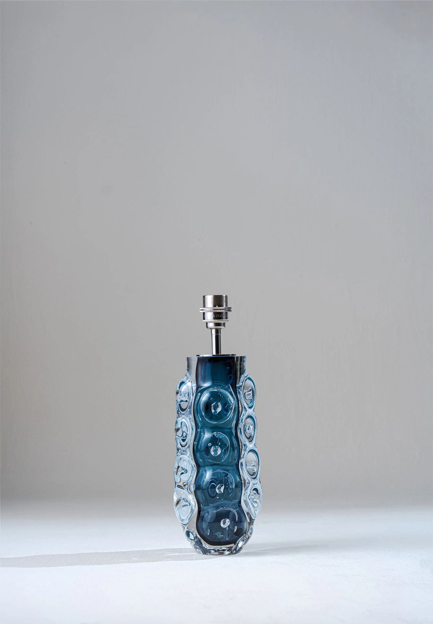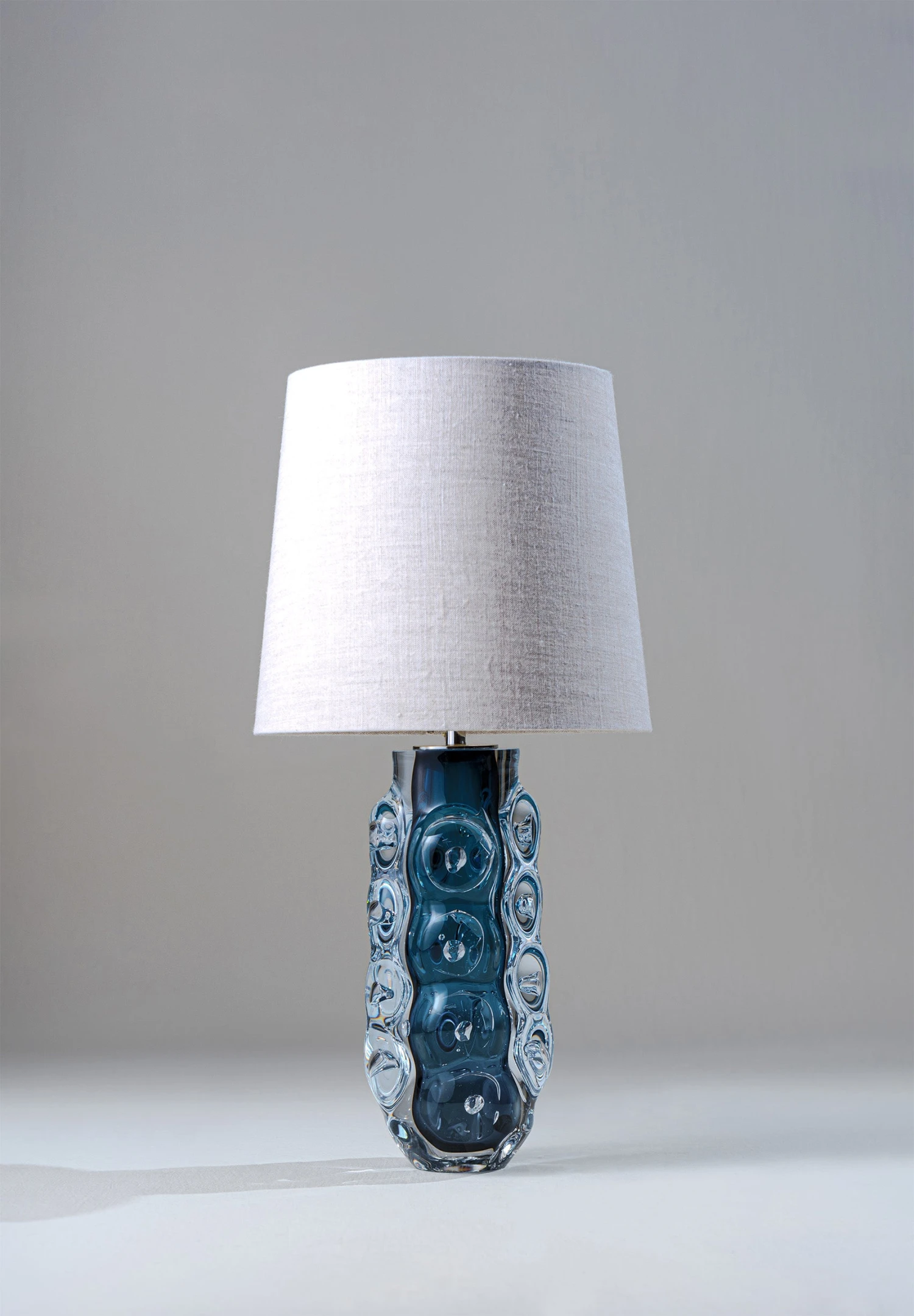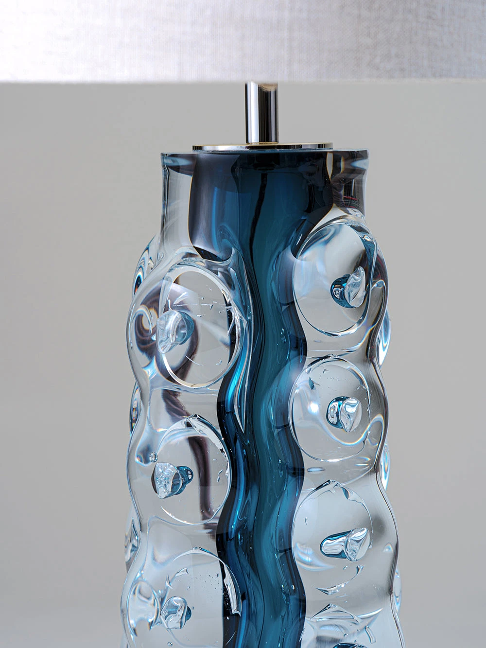Characterised by its distinctive rippled surface decoration to all four faces, the Hartley is a versatile, handblown glass lamp. Available in Clear or Cerulean.
