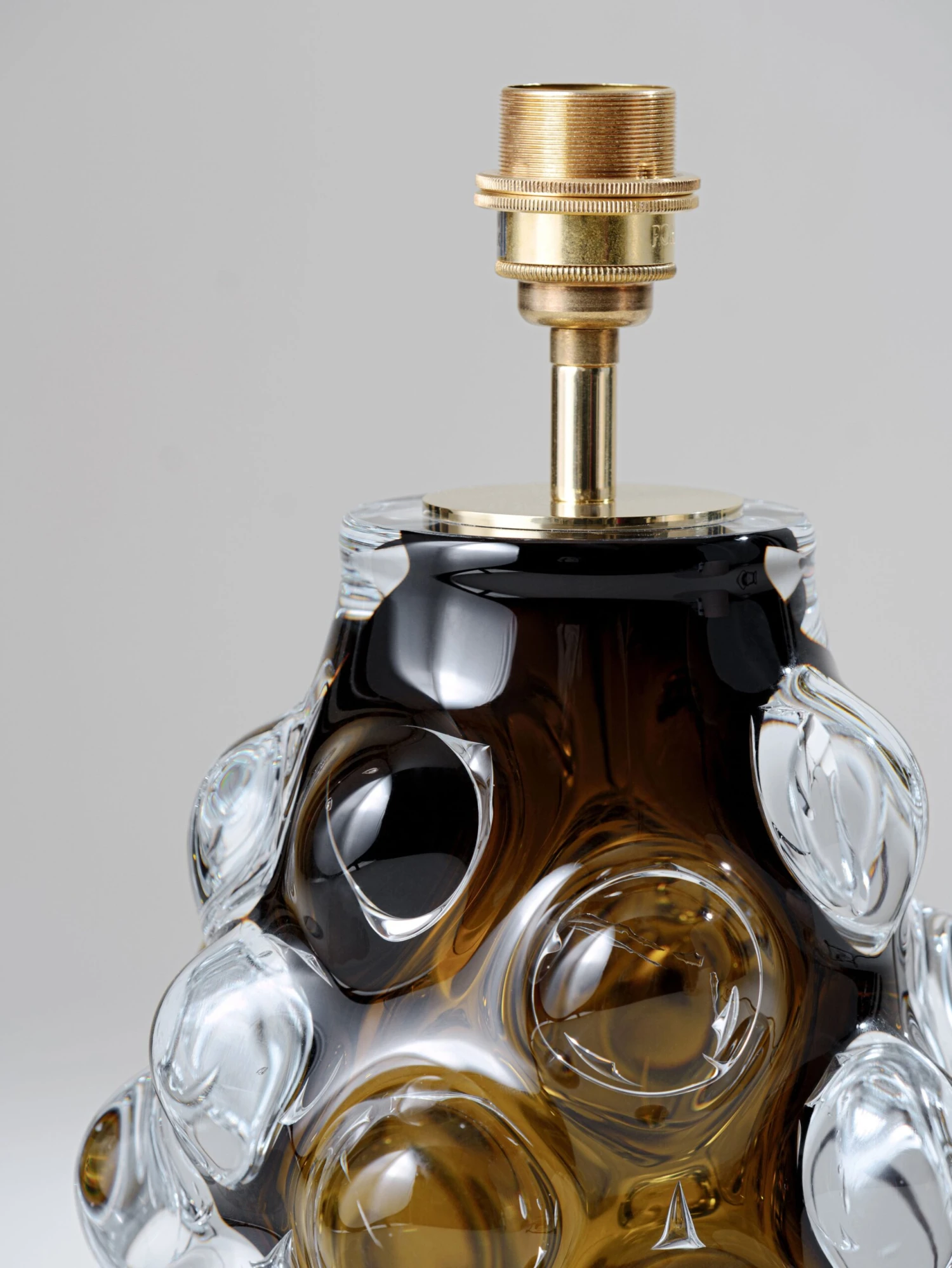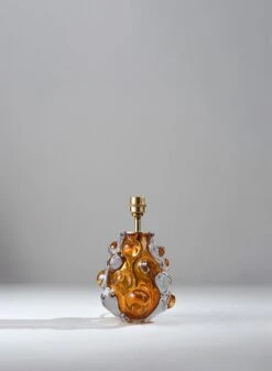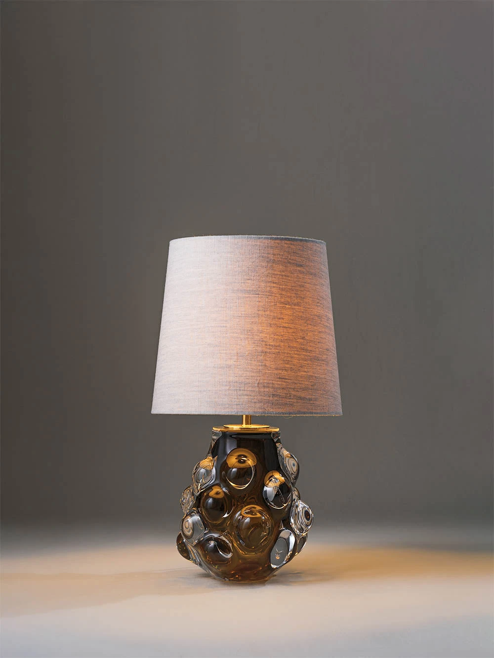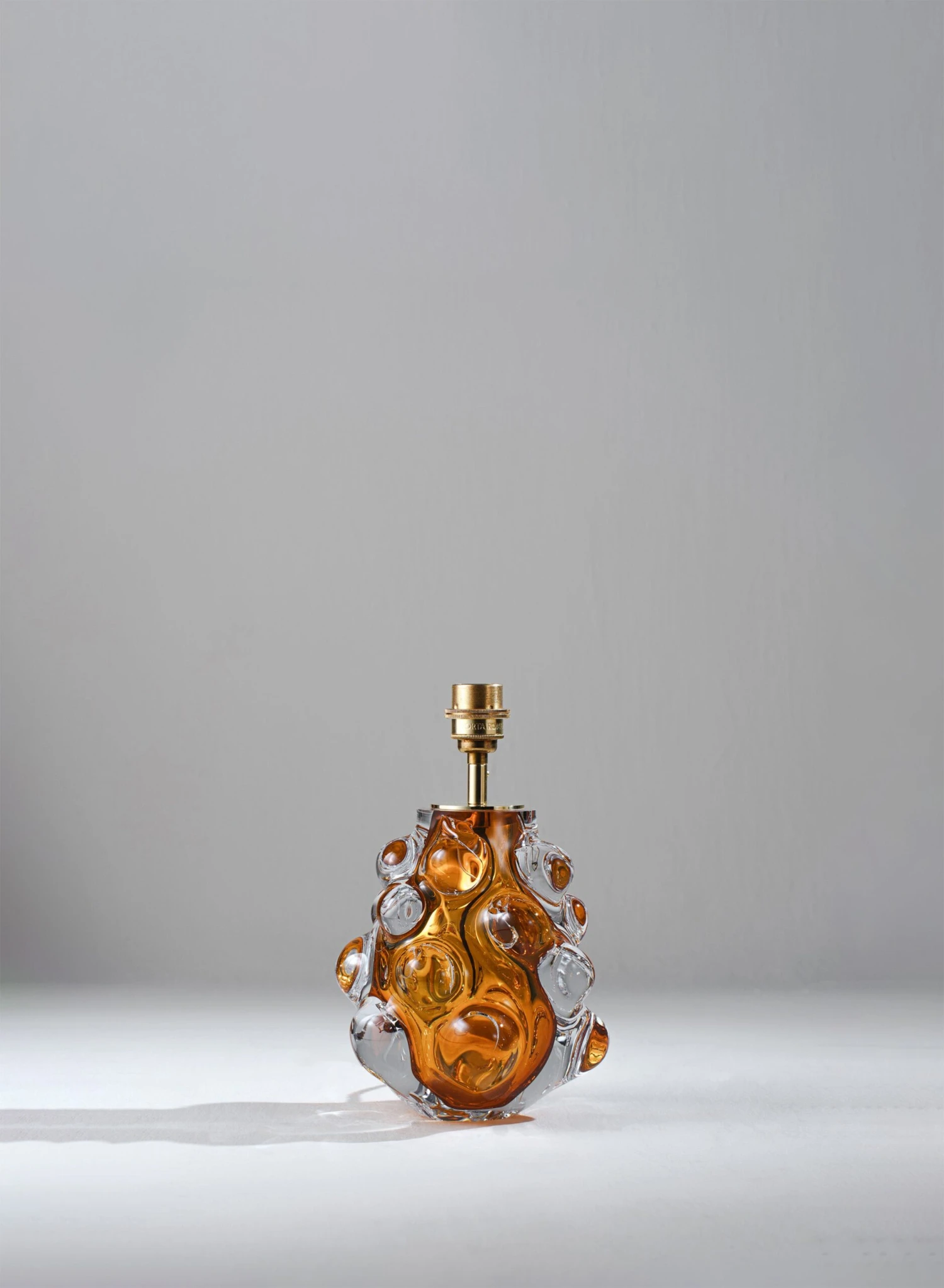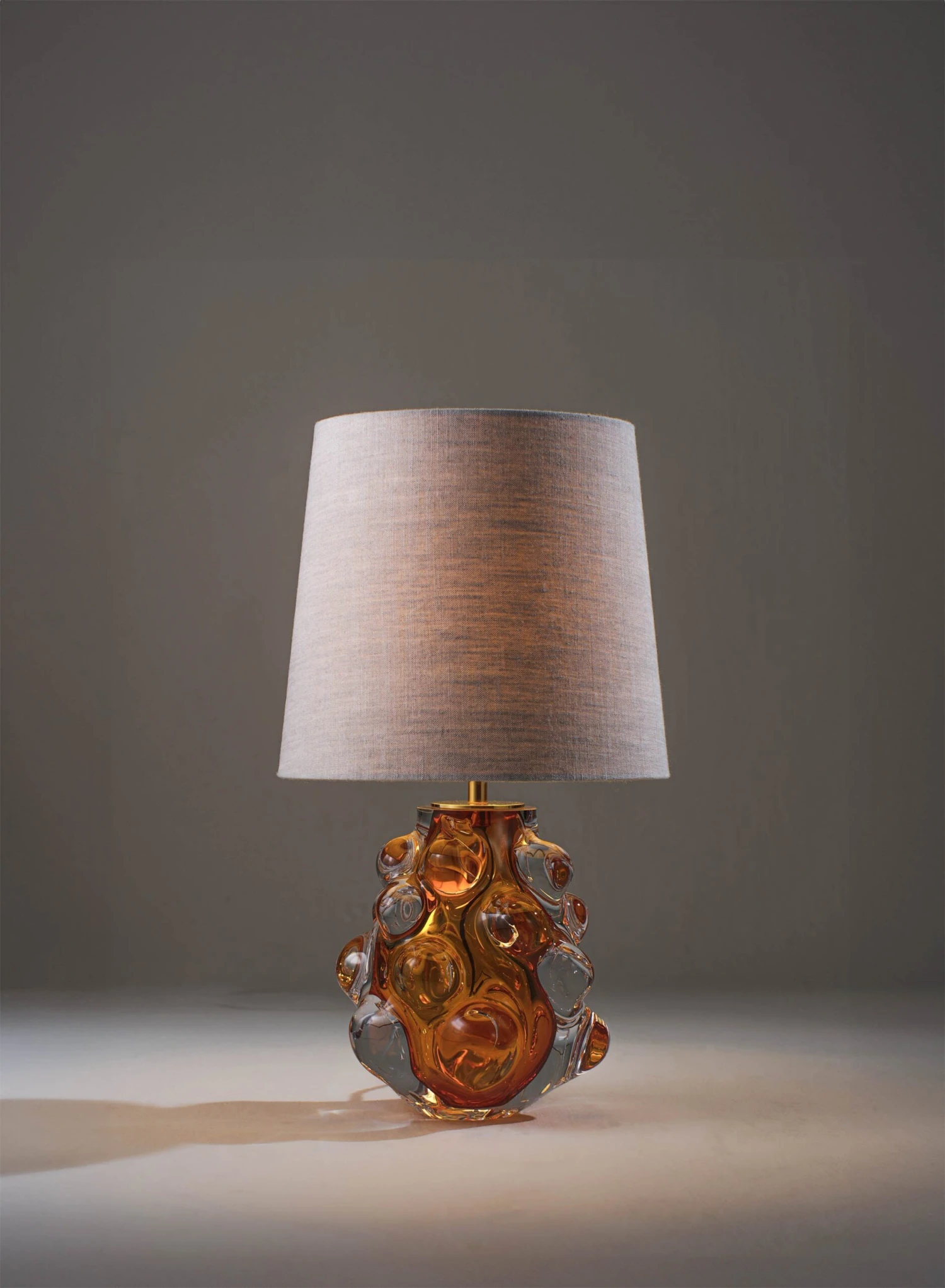 A handblown glass form weighing over 7kg, the Lucille lamp is characterised by its distinctive round surface bubbles which create beautiful reflections. Available in Amber, Lemongrass or Cerulean, fully encapsulated in clear molten glass during the complex making process.