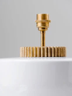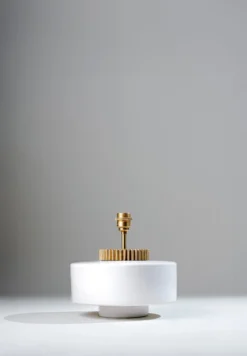 Now available on a smaller scale, the Marlowe Mini lamp is evocative of 1970s style squat lamp. The glazed ceramic base is finished with a grooved brass collar that resembles a cog wheel. Available in Stone. View the larger scale Marlowe here.