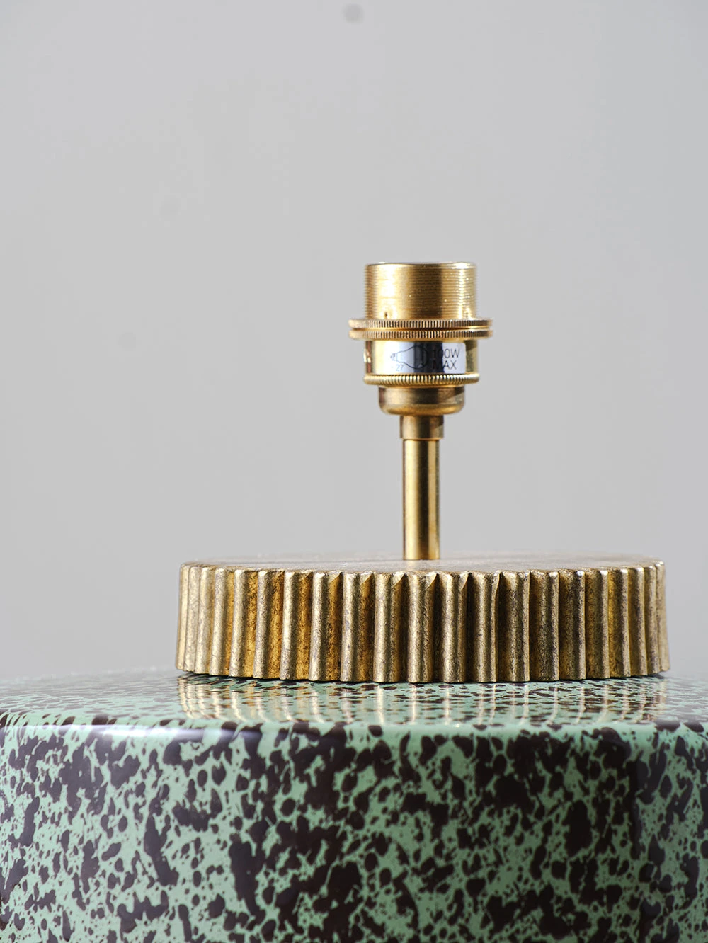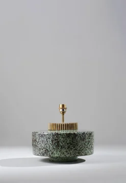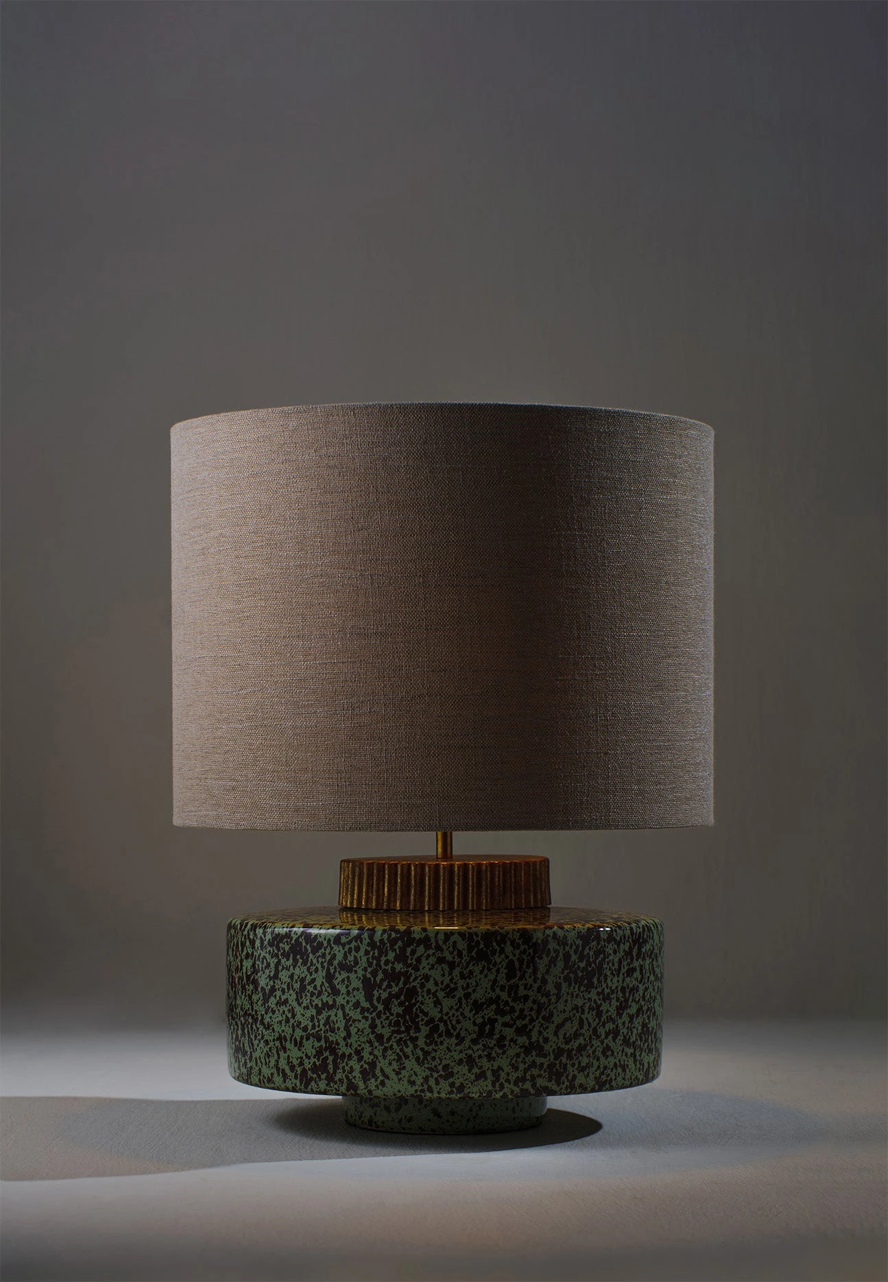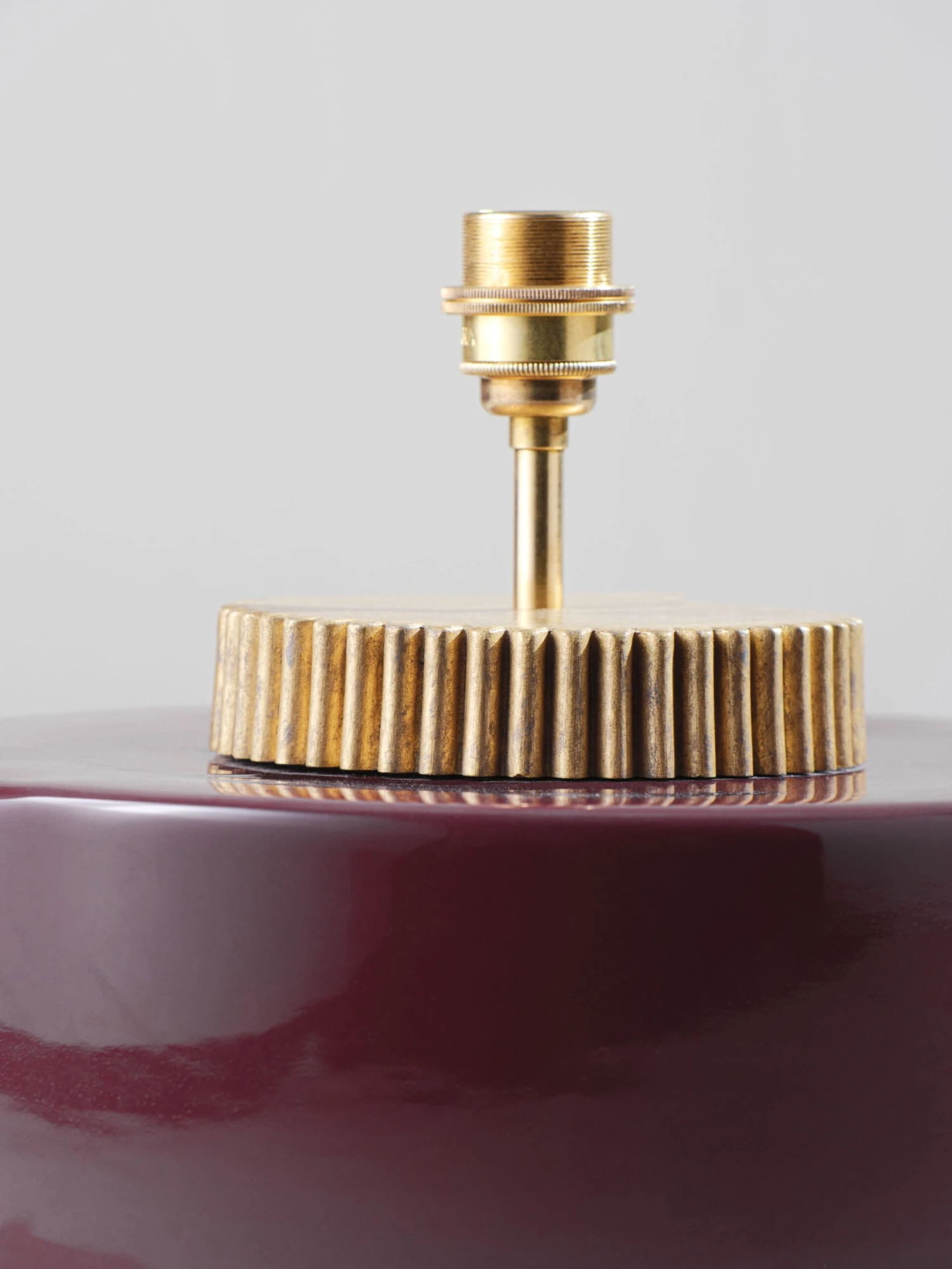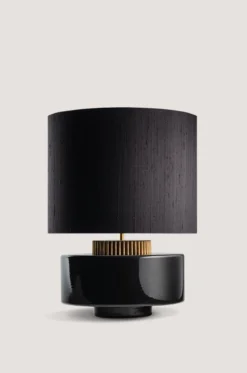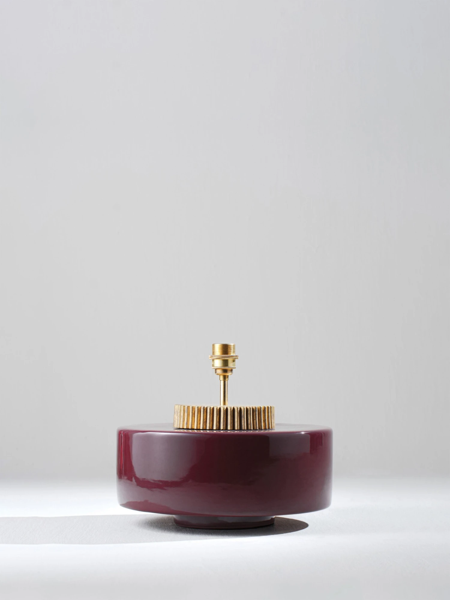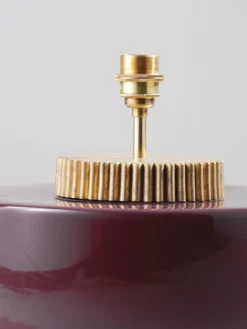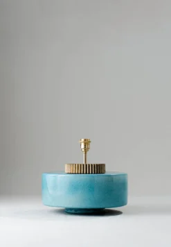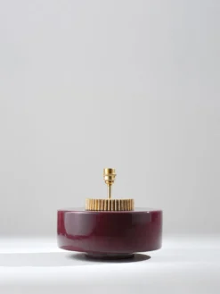 The design of the Marlowe lamp is evocative of a 1970s style squat lamp. The glazed ceramic base is finished with a grooved brass collar that resembles a cog wheel. Available in Cranberry, Stone, Black, Aqua, Sienna and Fennel.