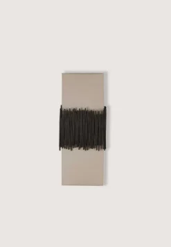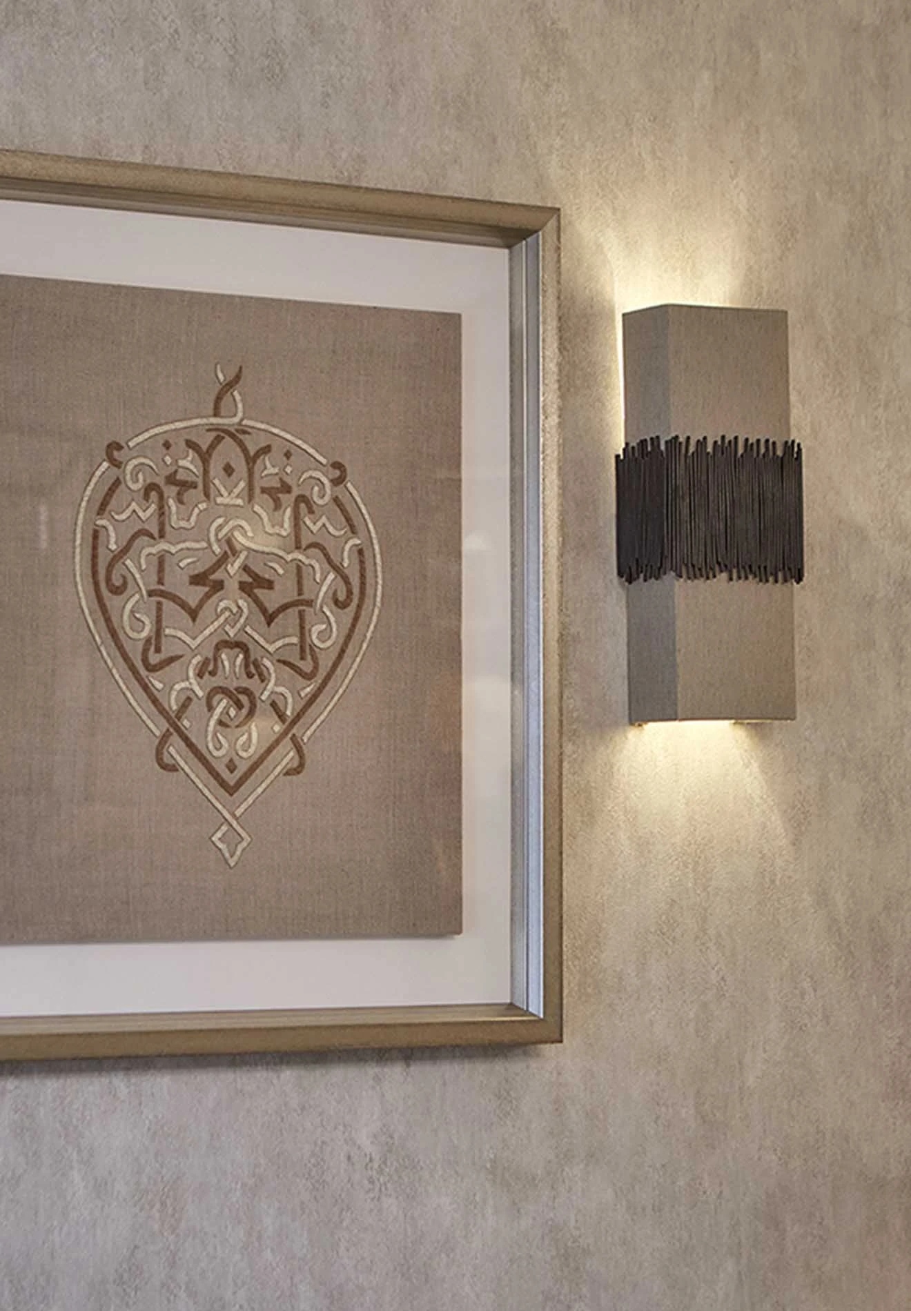 The Matchstick Wall Light consists of over seventy pieces of hand-cut and twisted metal bars, joined together to wrap around the rectangular shade.