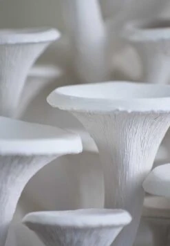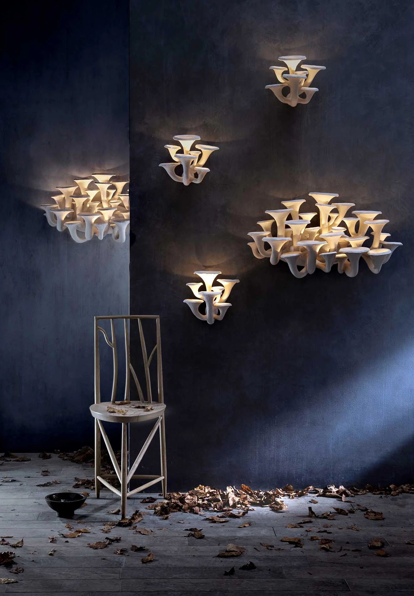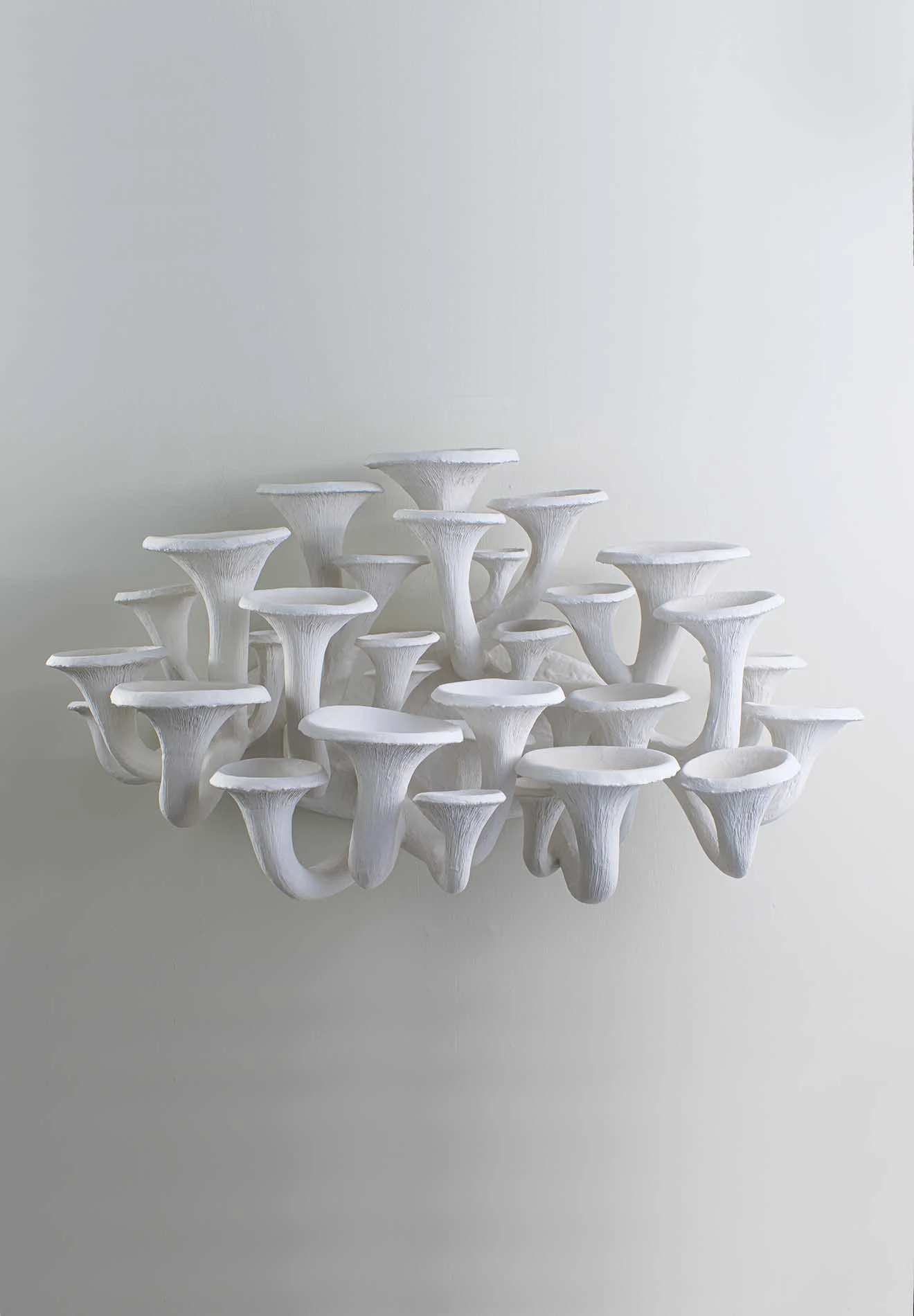 Organic and sculptural in its form, The Mushroom Wall Light uses the most up-to-date making techniques. The body of each mushroom, 32 in total, is 3D printed in a sustainable composite, layered with plaster, softly textured and painted, before being fitted with tiny LED bulbs.
