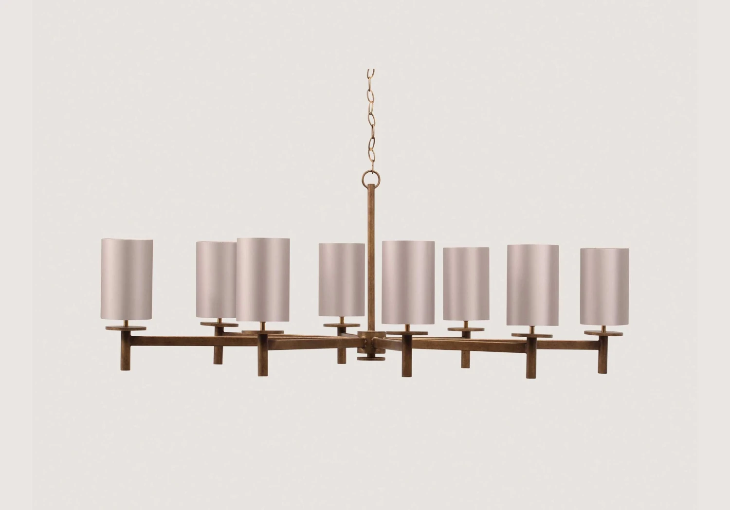 The Neptune Chandelier is a large scale oval piece which sits well over a dining table or in a hallway. Inspired by mid-century design, the 8 linear struts provide an even distribution of light. This design can be custom sized.