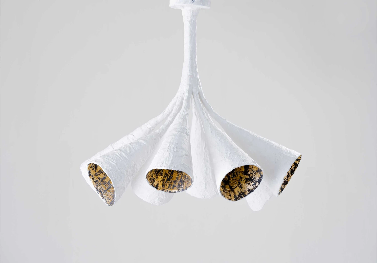 Each Ophelia ceiling light is individually hand sculpted by our artists in the paint workshop. Featuring beautifully twisting flutes that emit a golden light which is softened by its sculptural surface.