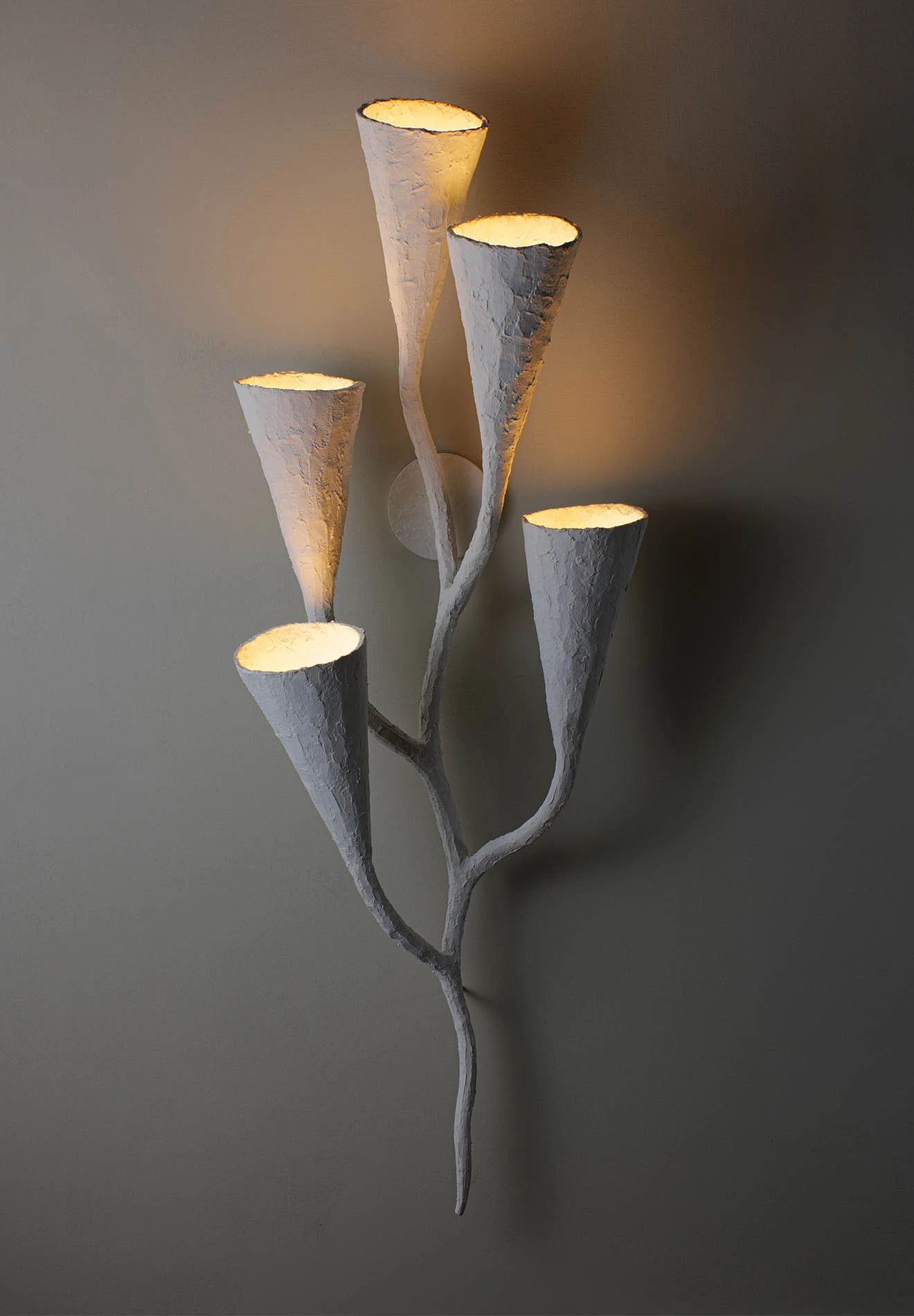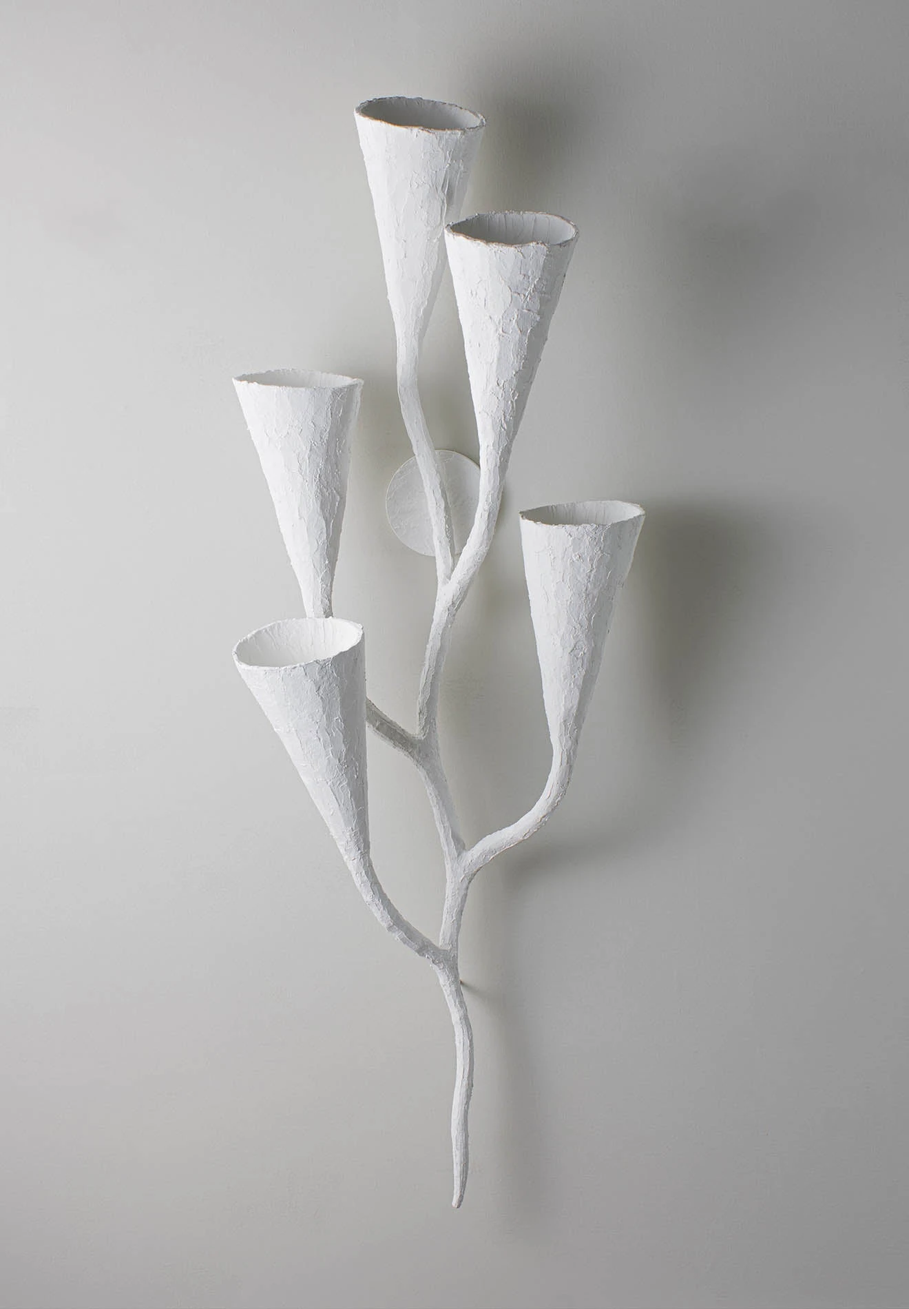 Each Ophelia Wall Light is individually handmade. Its twisting white flutes emit a golden light, which is diffused and softened by the sculptural surface and Plaster White finish.