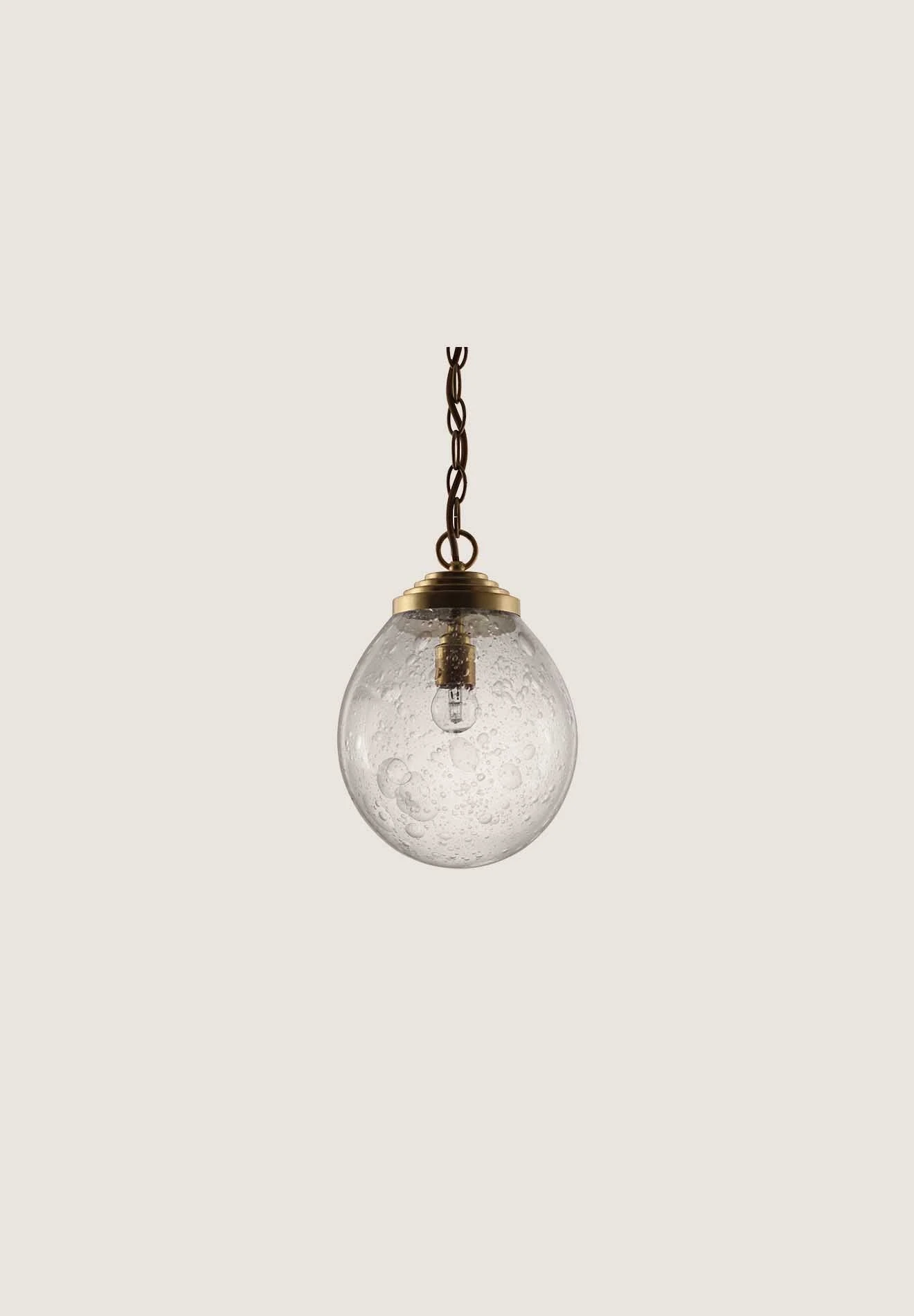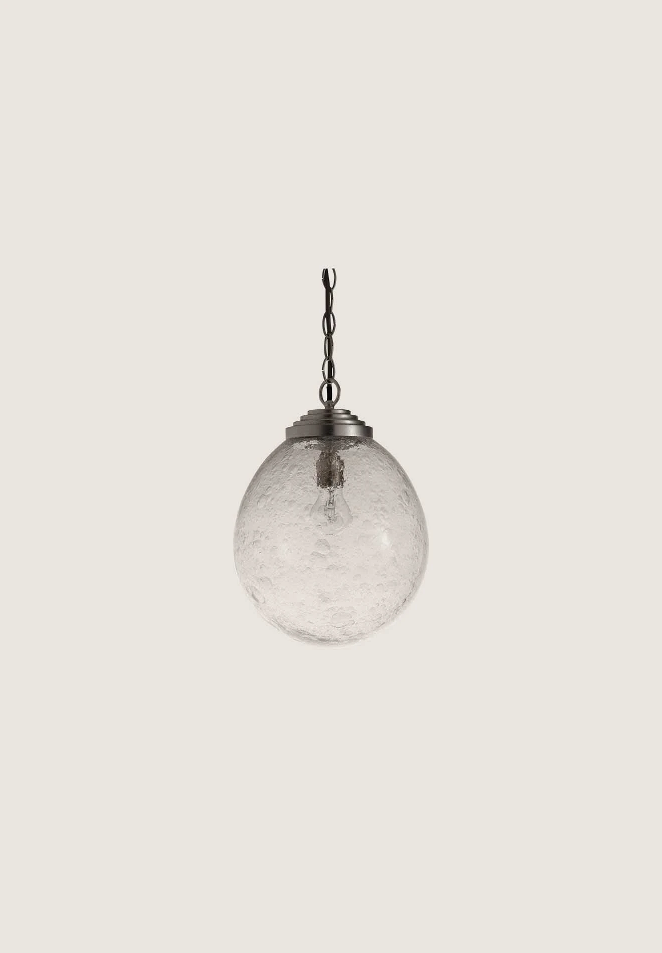 Each Orb Pendant is handmade to create its unique bubbled effect. A sleeve of clear blown glass is dipped in a solution that encourages bubbles to form, then it is covered with another layer of clear molten glass to give the piece its lustre.