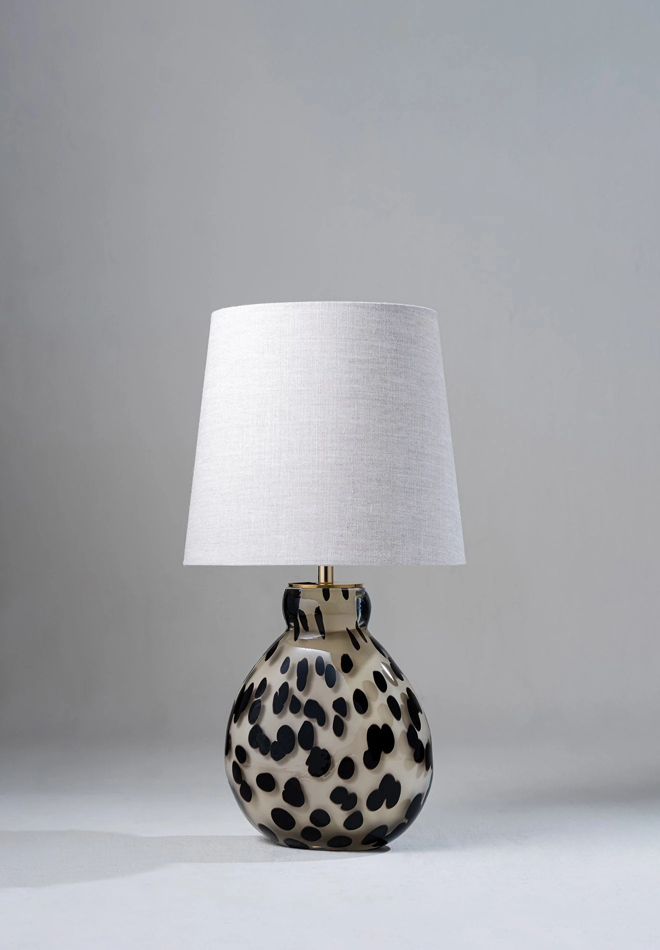 The Ottie table lamp is hand-blown in the Surrey Hills. The lamp’s spotted surface is both playful and decorative, whilst the coloured glass encapsulation lends a sense of weight and sophistication.