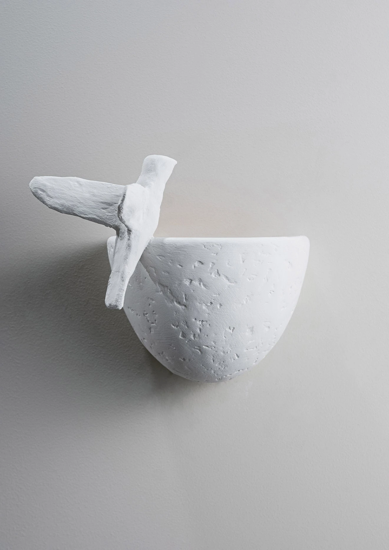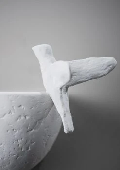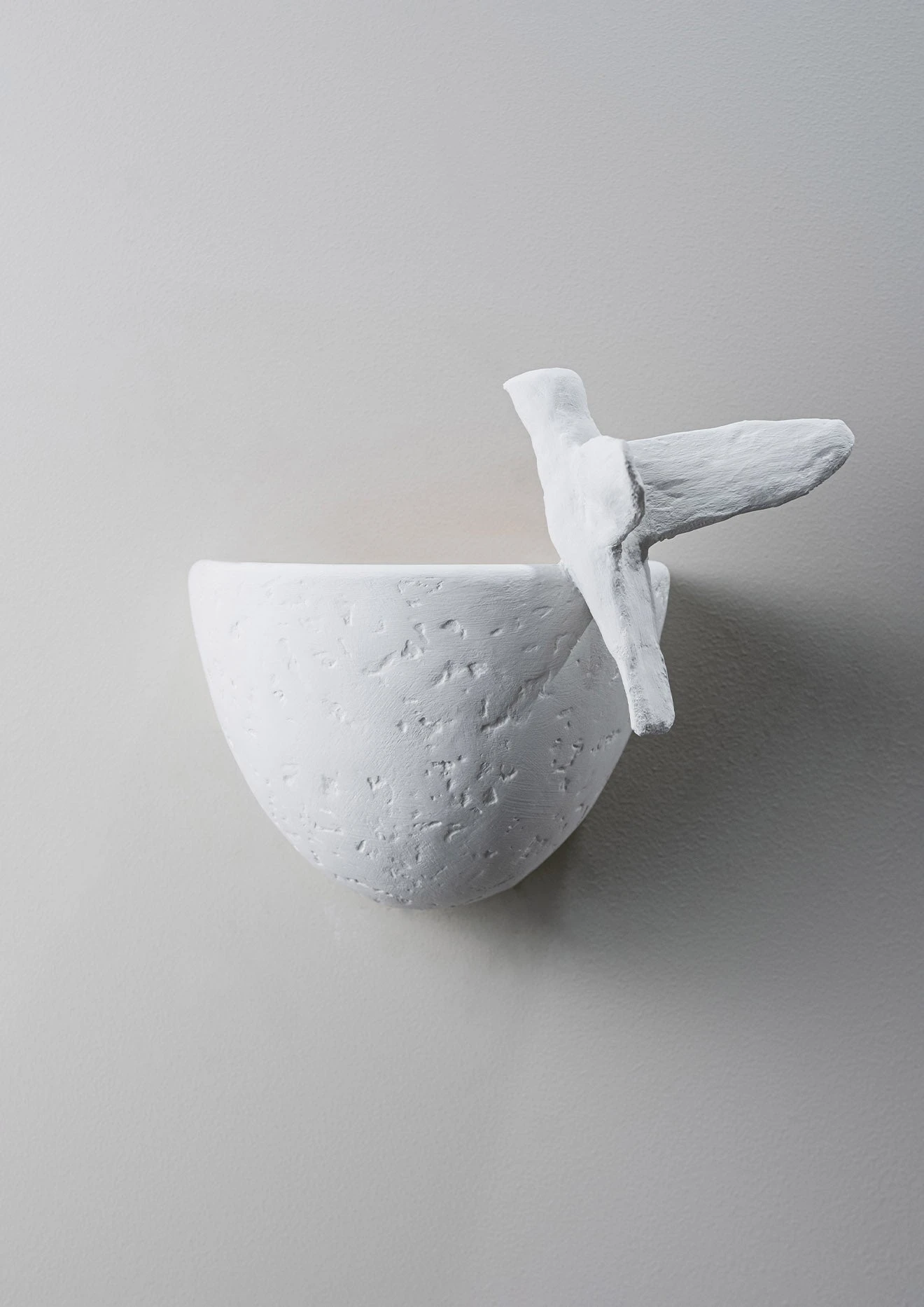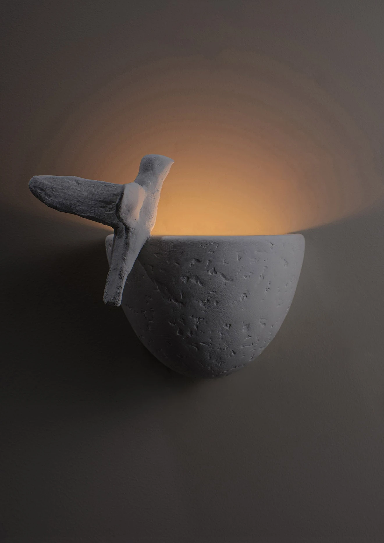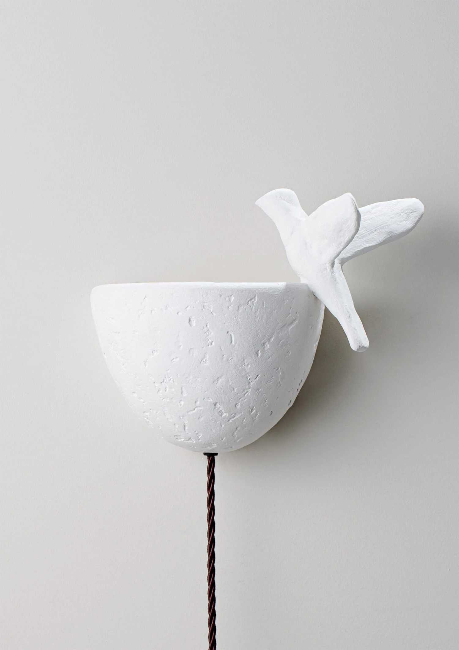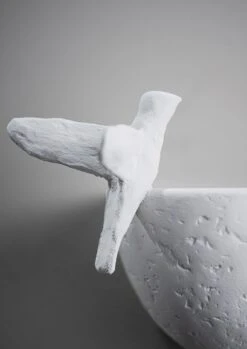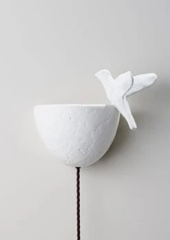 This small-scale wall light, hand-painted in Plaster White with Cream Etched Gold, echoes the animation and liveliness of the Paradiso ceiling light, with the light catching the bird as it lands on the edge of its bath. The position of the bird can be customised. Available in any custom painted finish.