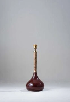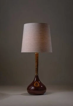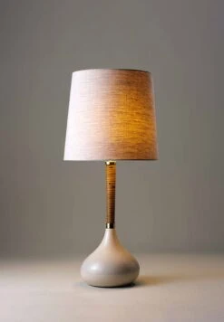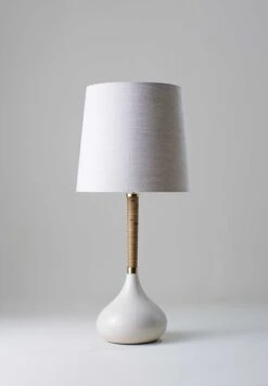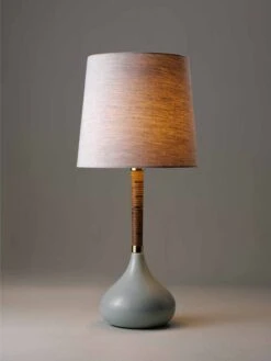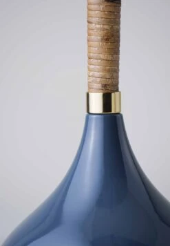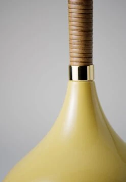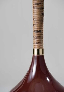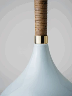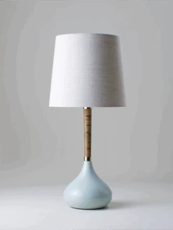 Combining a glazed ceramic base with a wrapped cane stem, the Phoebe Lamp references 1970s lighting design.