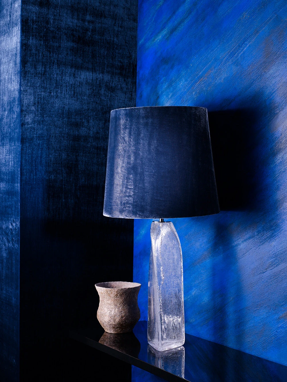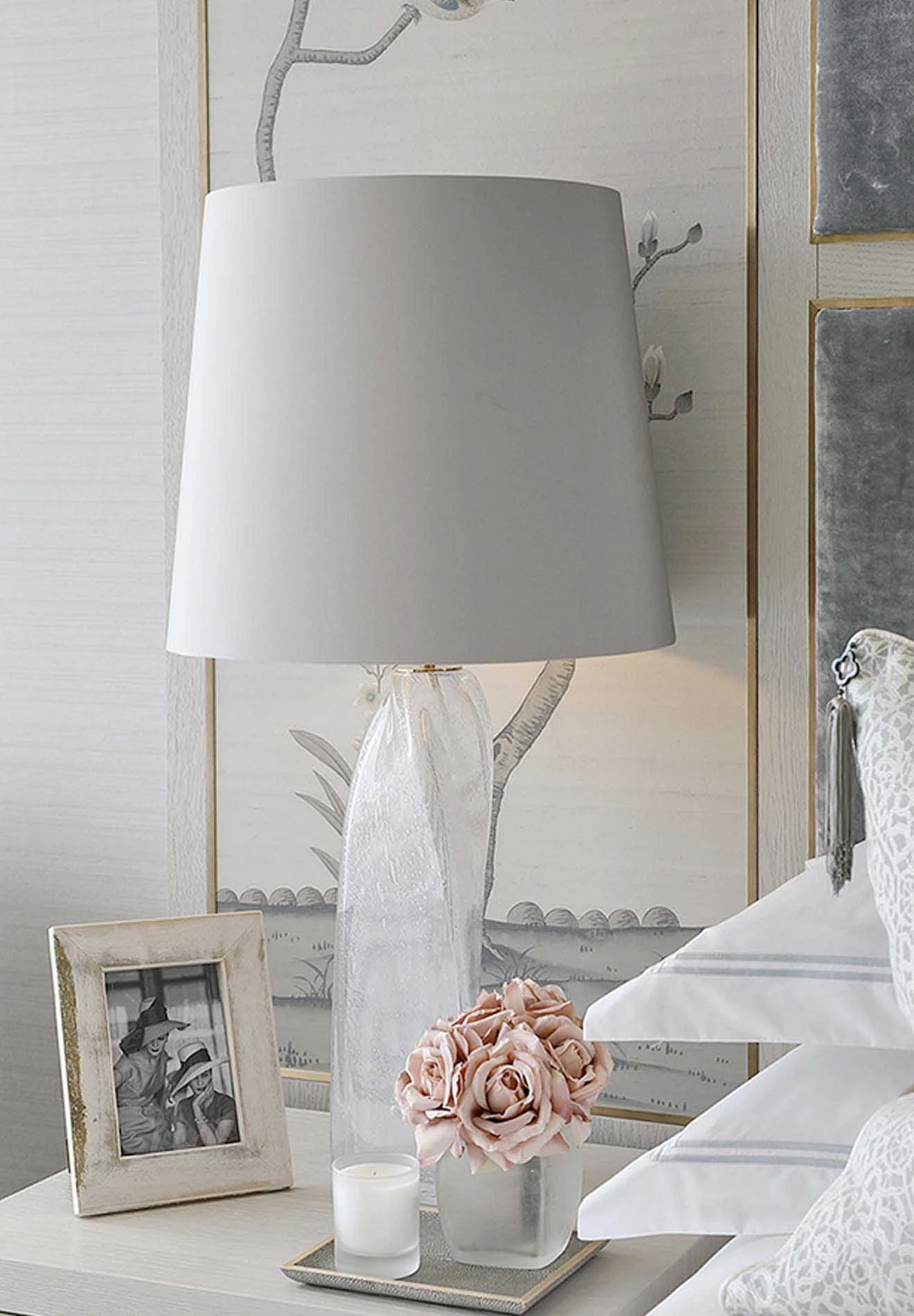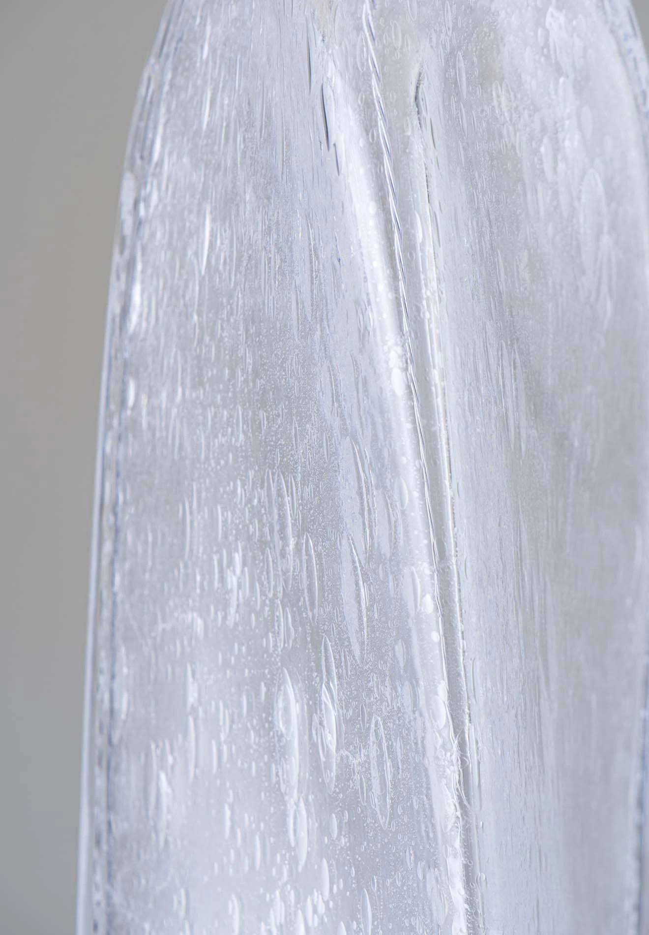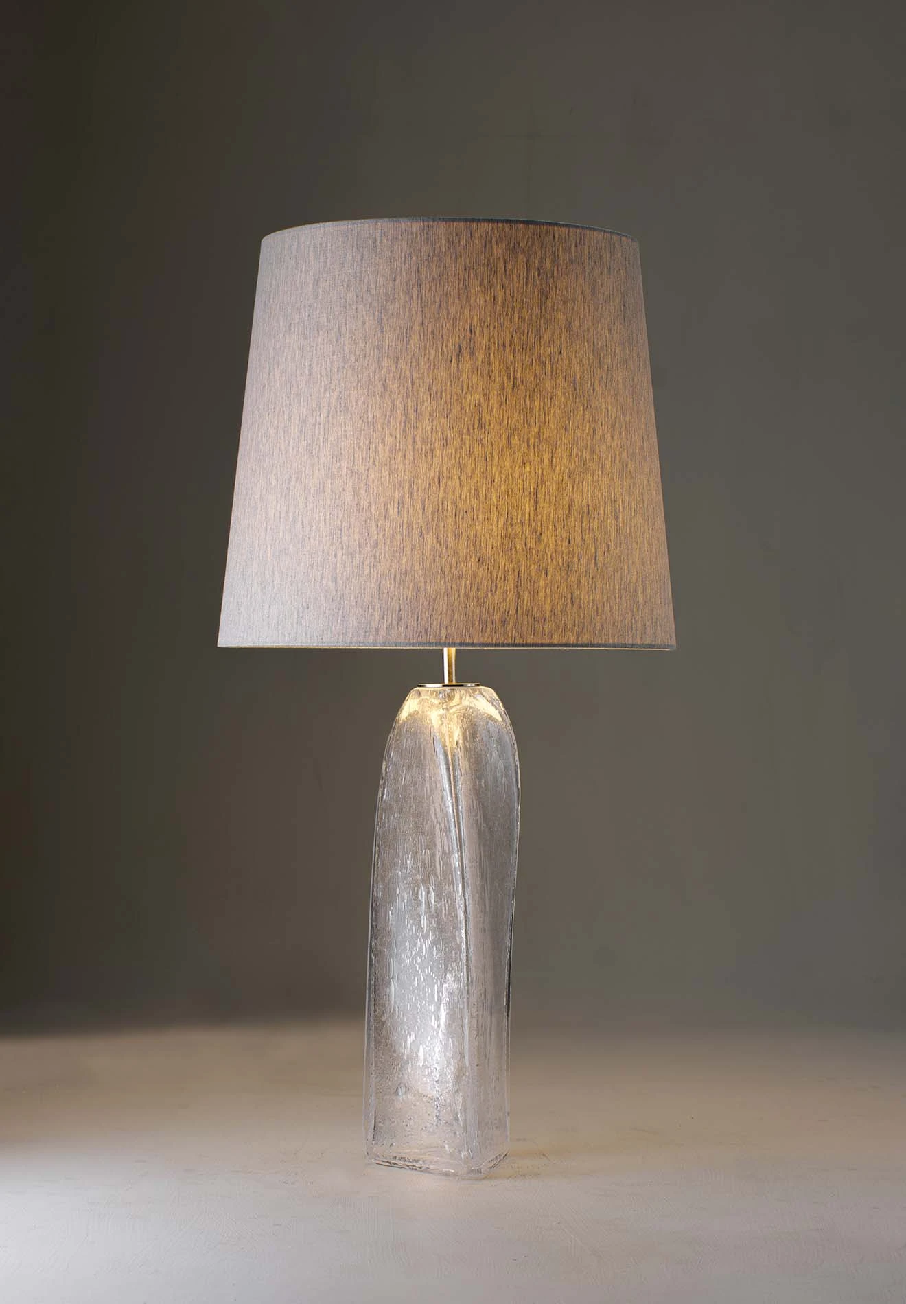 The Prism Lamp starts at its base as a triangle and grows to form a smooth elongated twist. It is formed of clear glass with a bubbled effect that comes to life when lit.