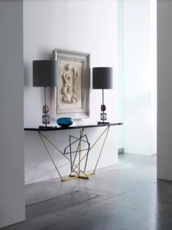 The Rhomboid Console Table was designed by Gareth Devonald Smith for Porta Romana. The scuptural framework of metal bars is decorated in three different finishes.