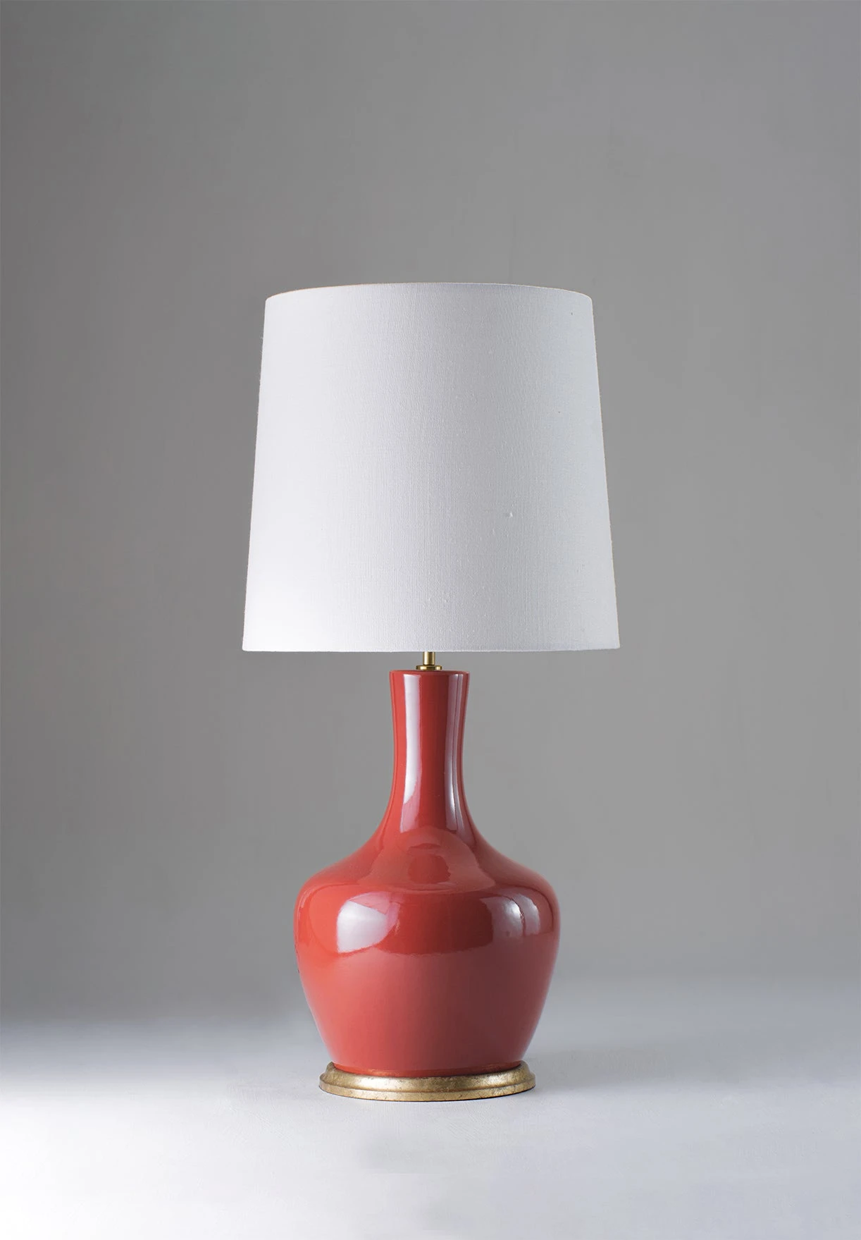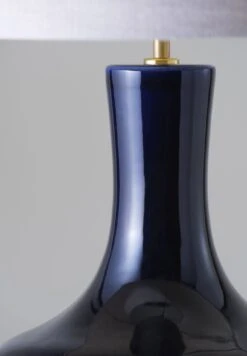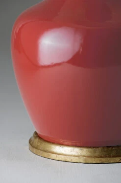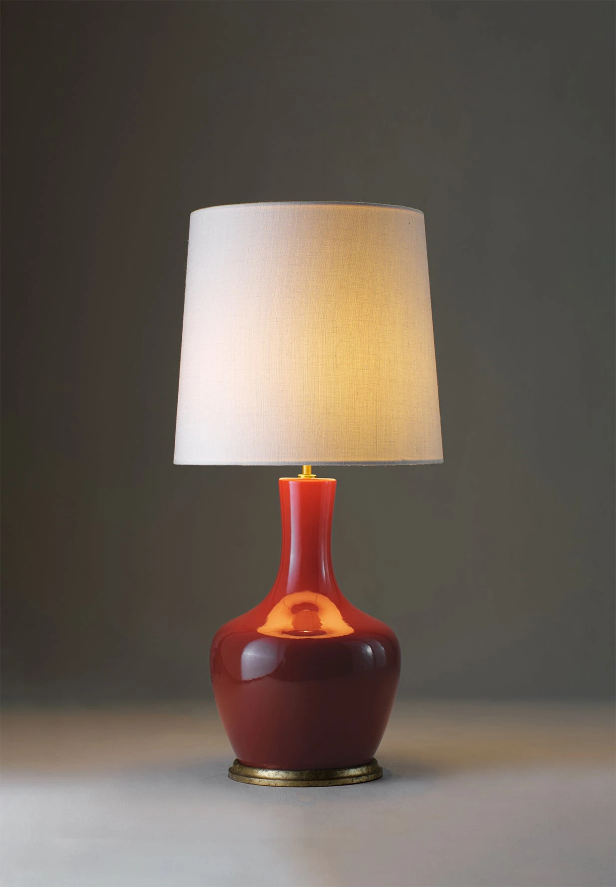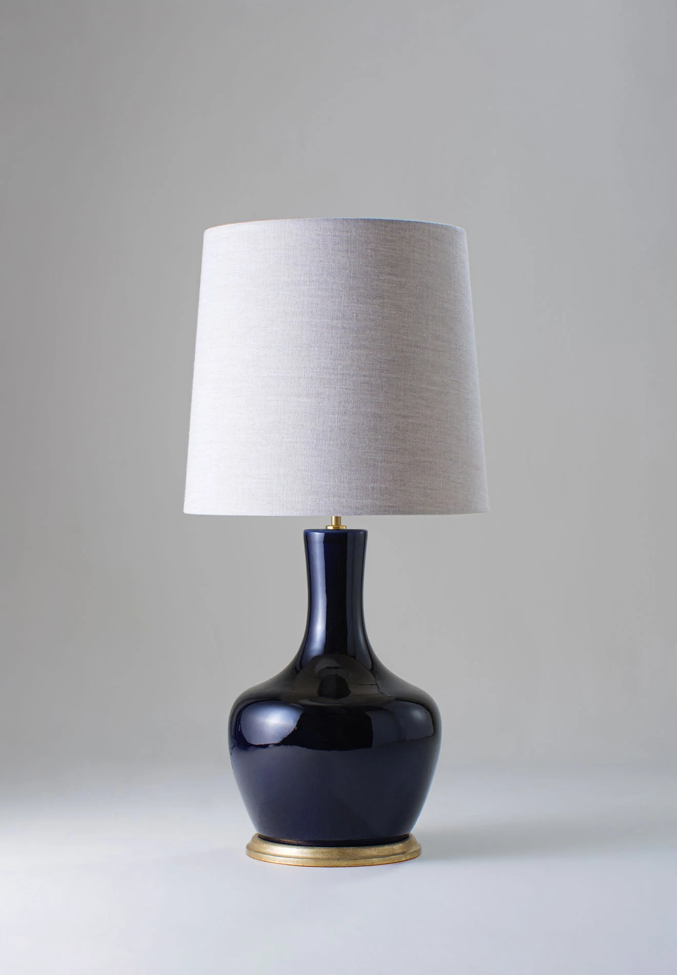 The Rigby Lamp was designed as a classic ceramic lamp with a short neck and a rounded body. Its gilded base provides a contrast to the brightly coloured glaze of the ceramic.