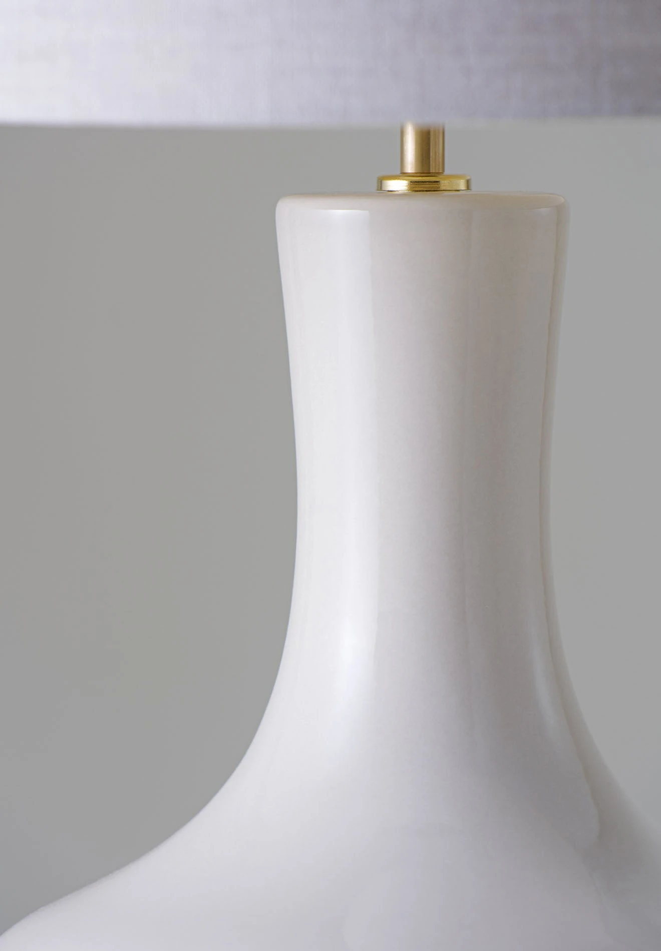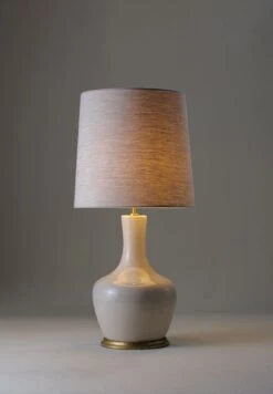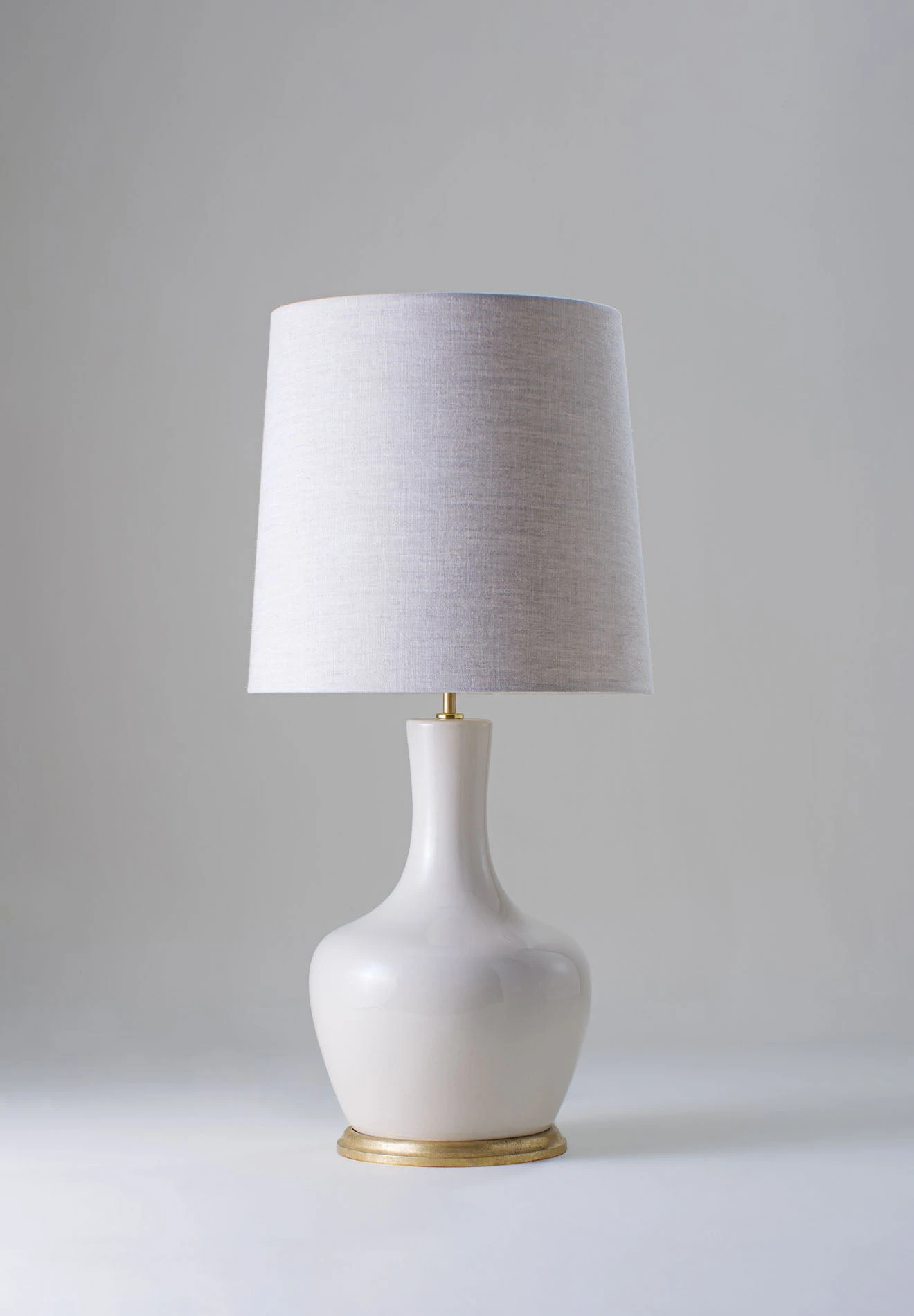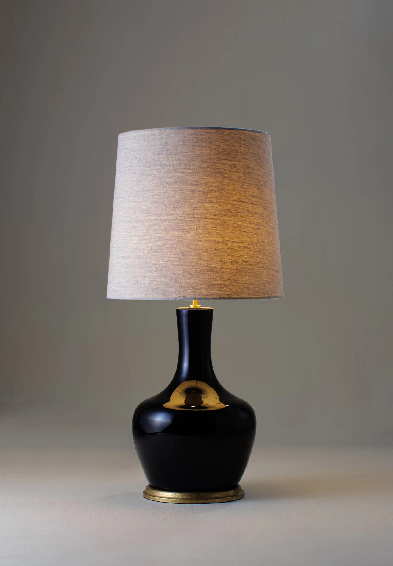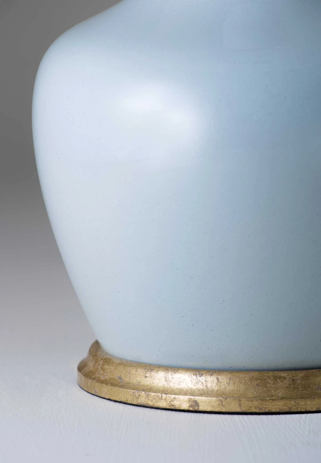 The Rigby Lamp was designed as a classic ceramic lamp with a short neck and a rounded body. Its gilded base provides a contrast to the brightly coloured glaze of the ceramic.