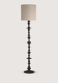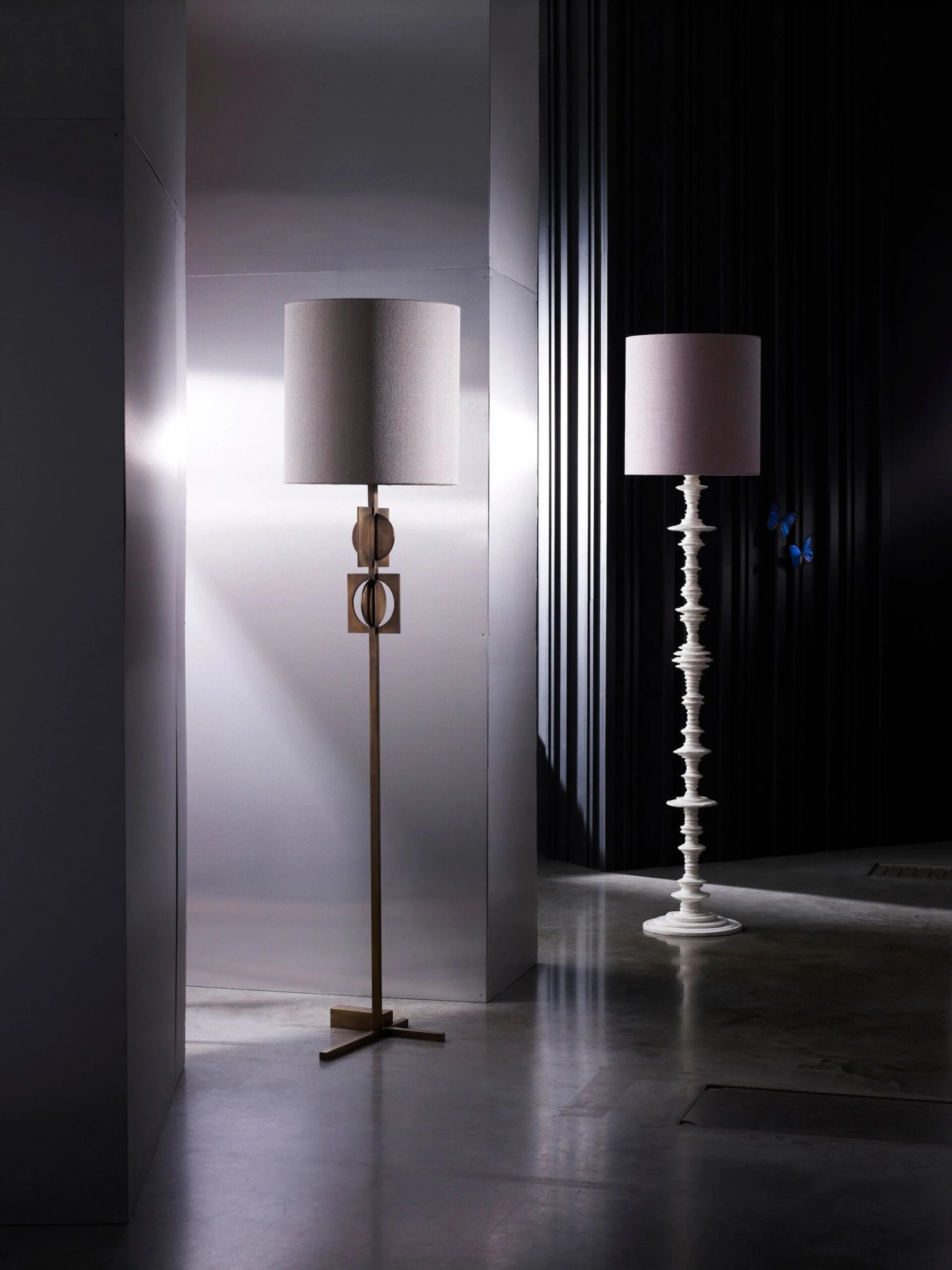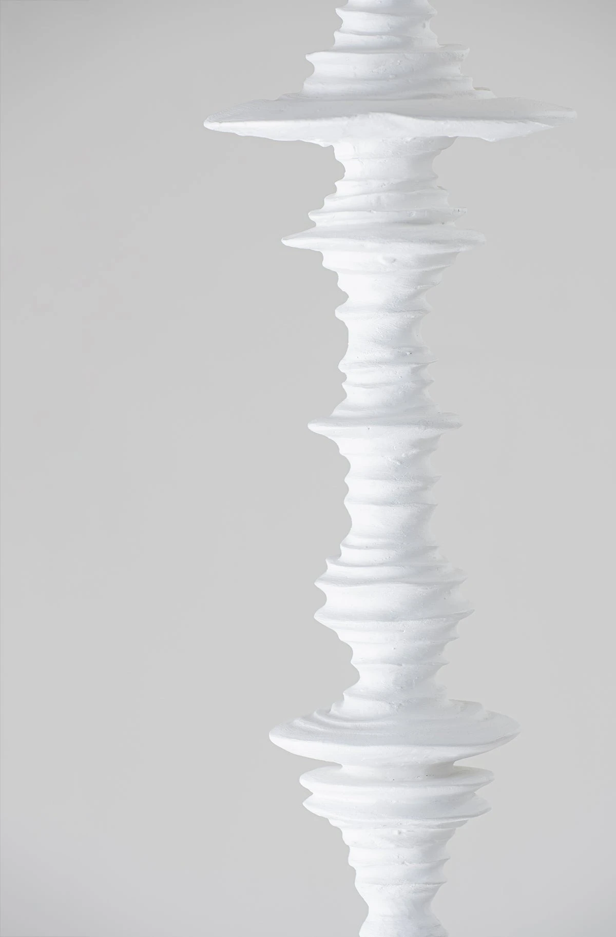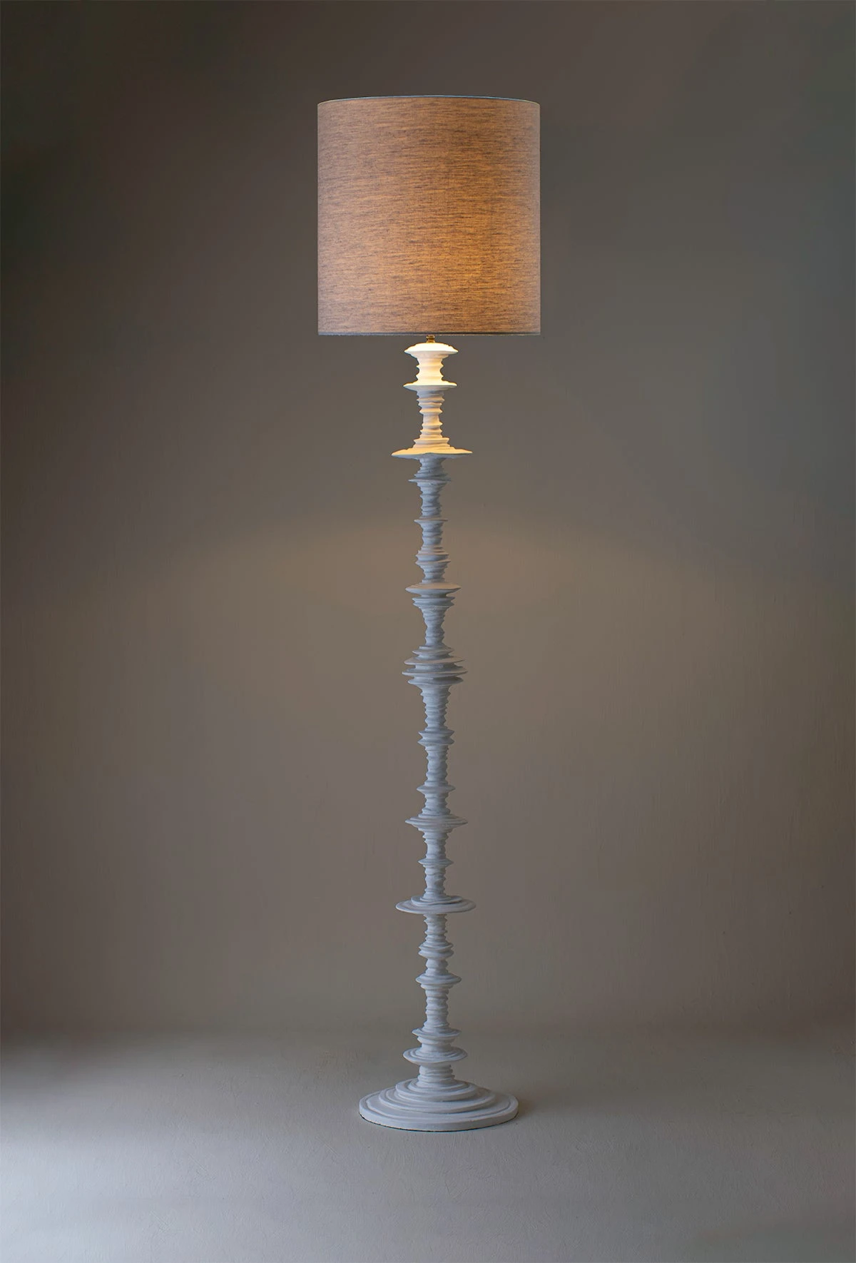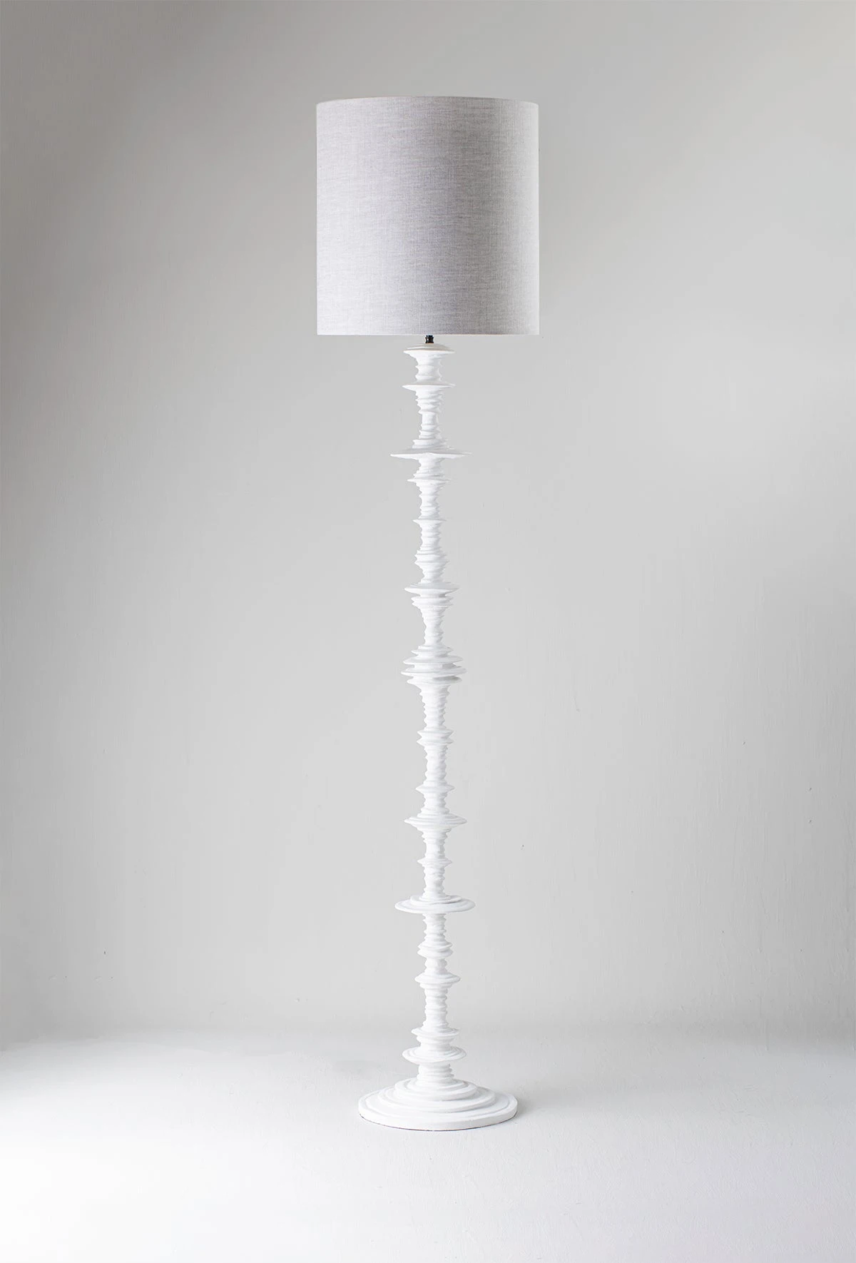 The Spin Floor Lamp is formed of a swirling circular column, reminiscent of spinning planetary rings. It has an uneven, hand-sculpted quality that resembles ceramic textures.