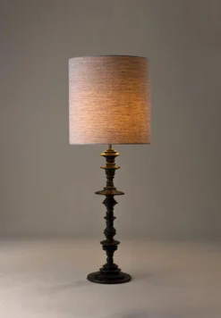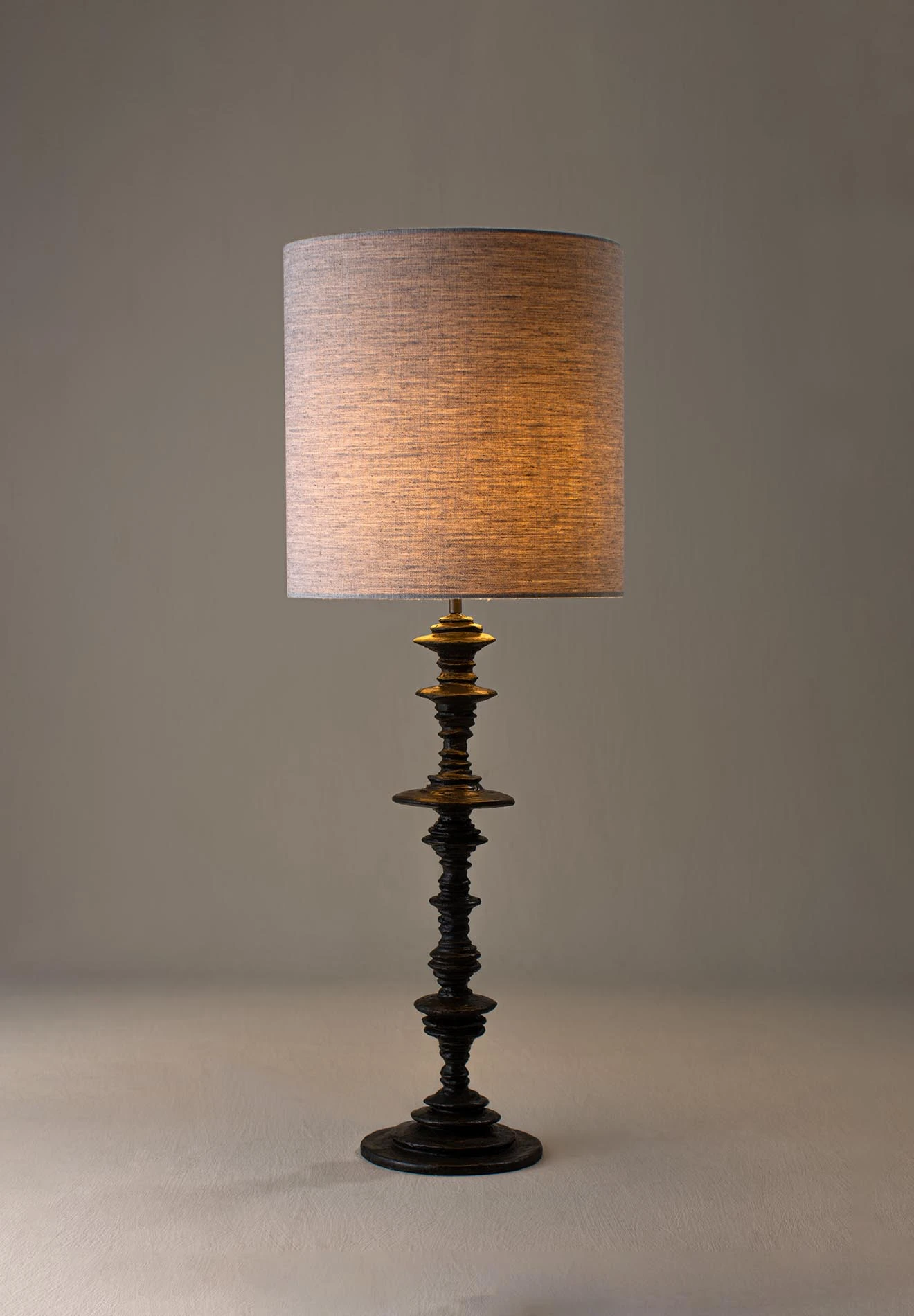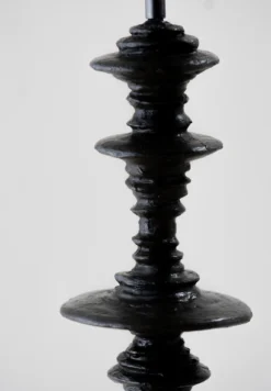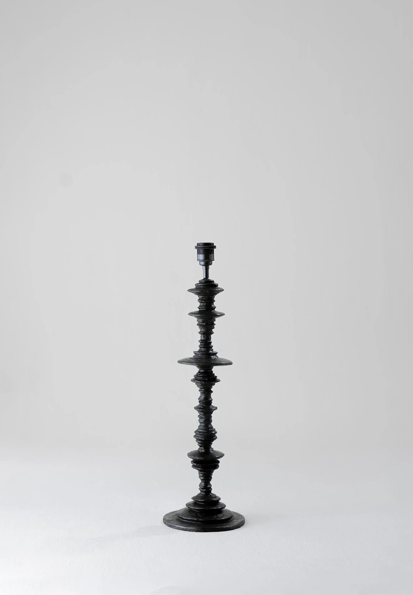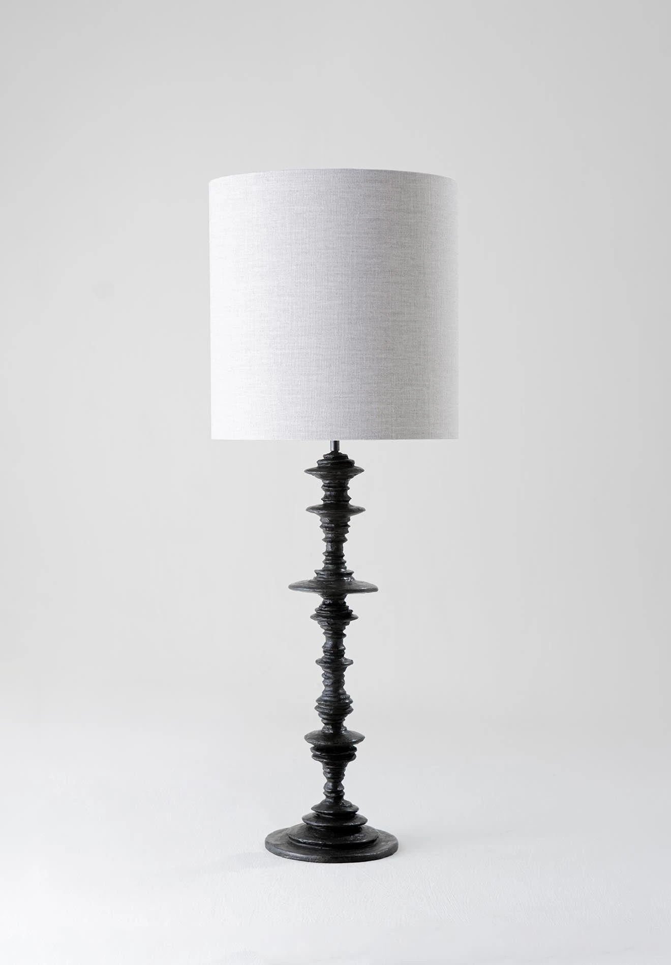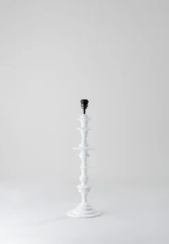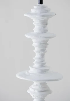 The Spin Lamp is formed of a swirling circular column, reminiscent of spinning planetary rings. It has an uneven, hand-sculpted quality that resembles ceramic textures.