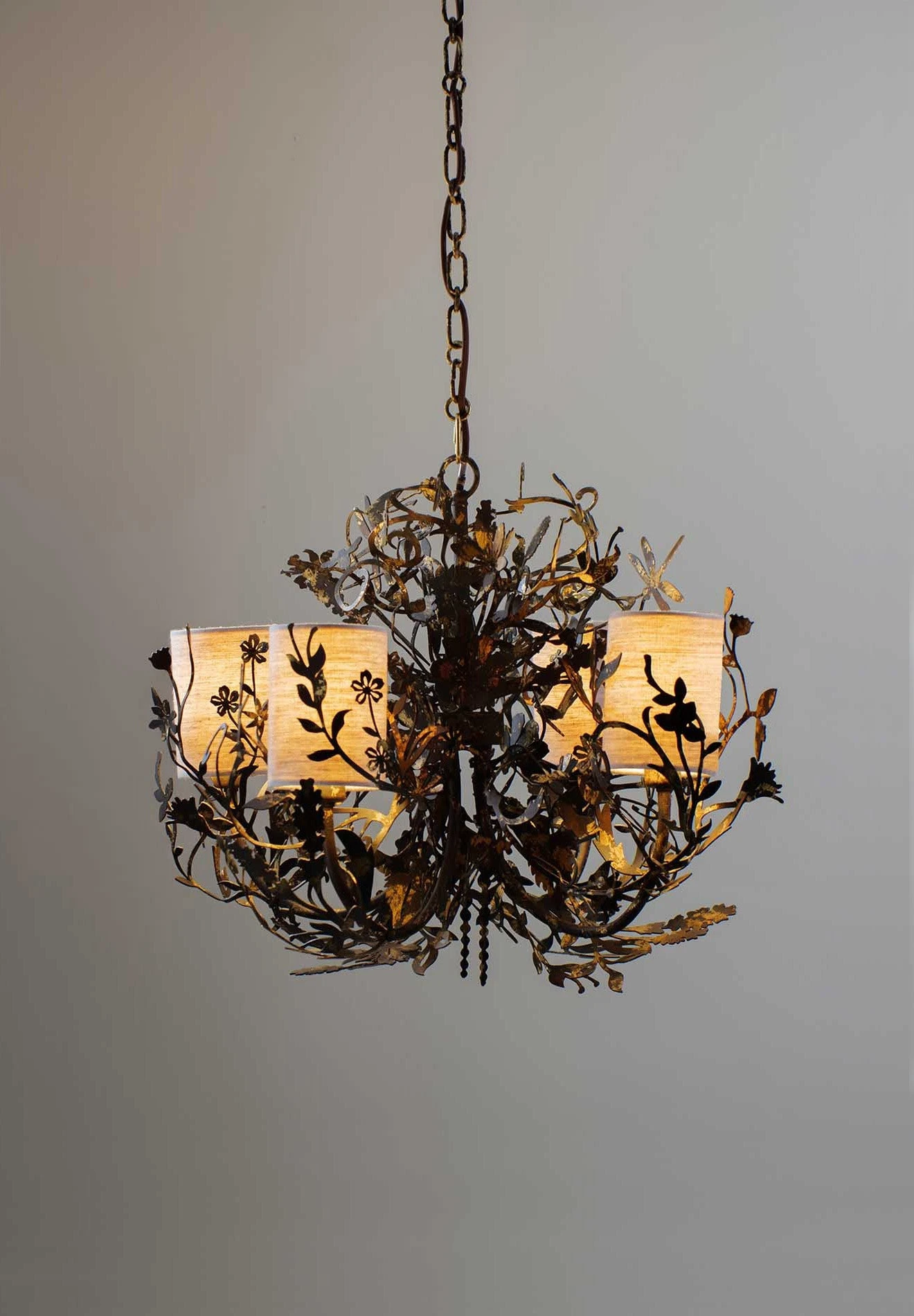The Small Spry Ceiling Light is formed of a metalwork of intricately cut dragonflies, bees and ants, wrapping its way around the frame.
