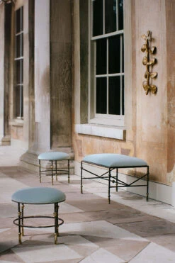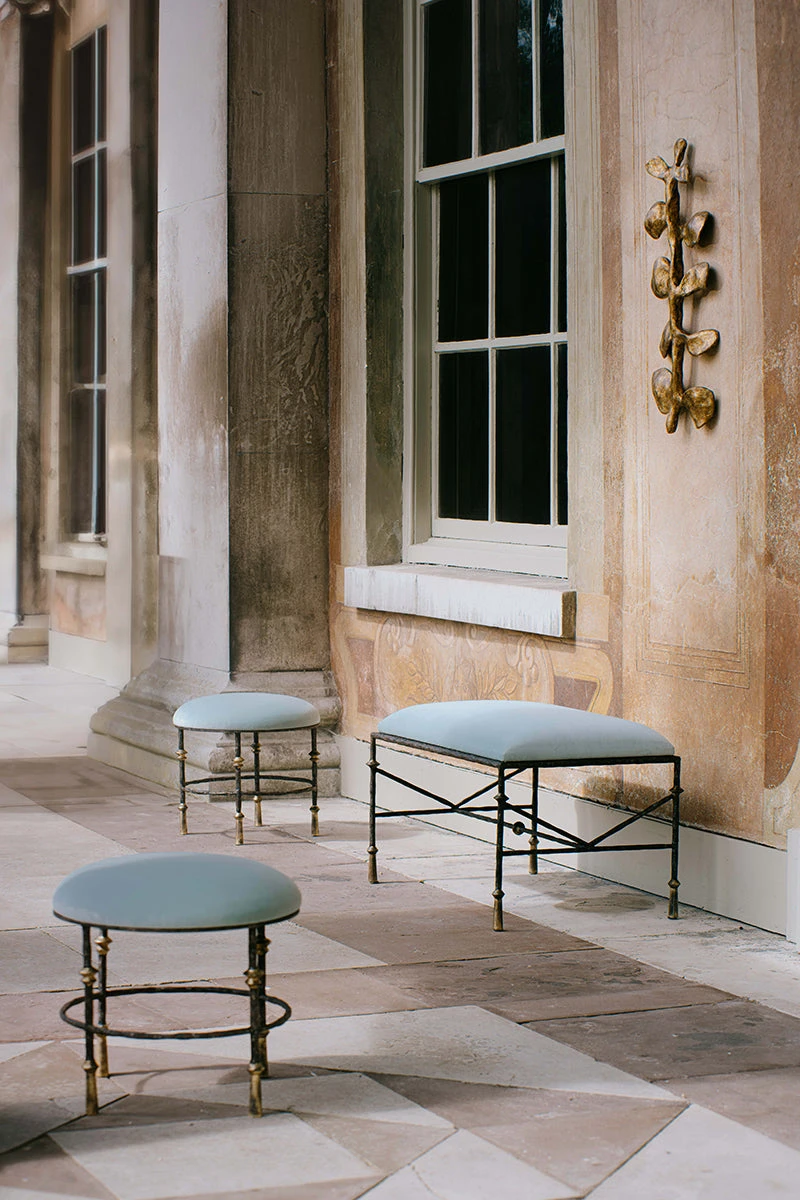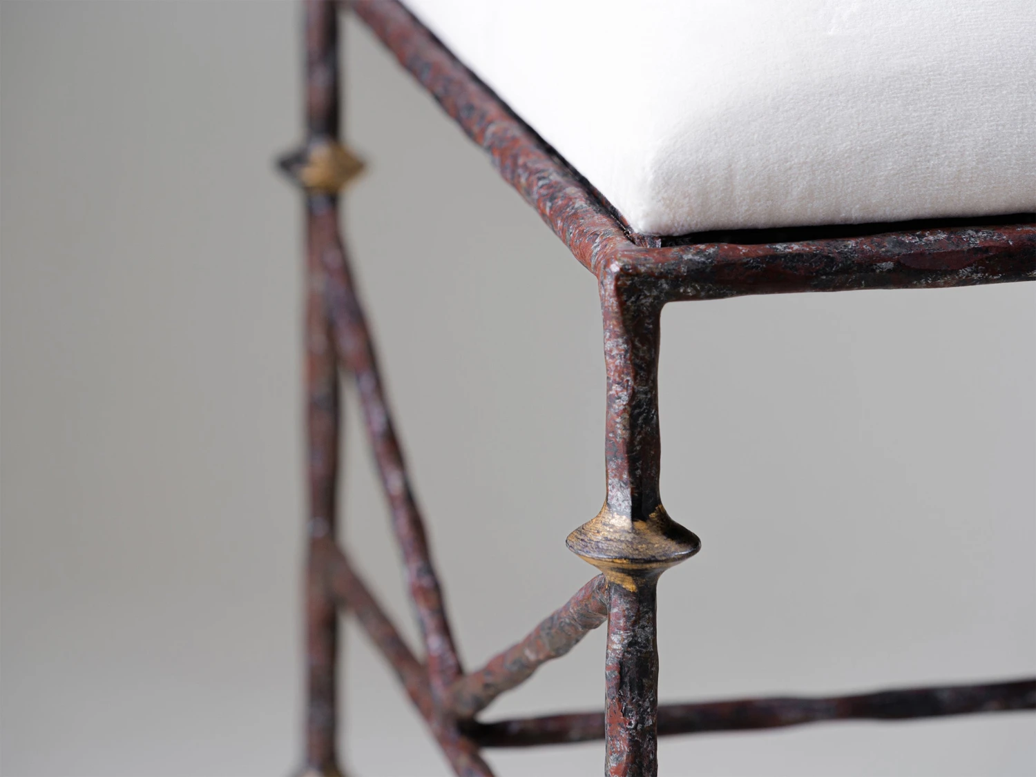 Characterised by a hand-beaten texture and distinctive conical-shaped feet, the Stanley dressing table bench is inspired by the furniture designs of Diego Giacometti and can be custom made in any size or painted finish of your choice. Shown here in Old Rust with Gold. Matching dressing table and mirror available. View the Stanley family here.