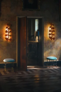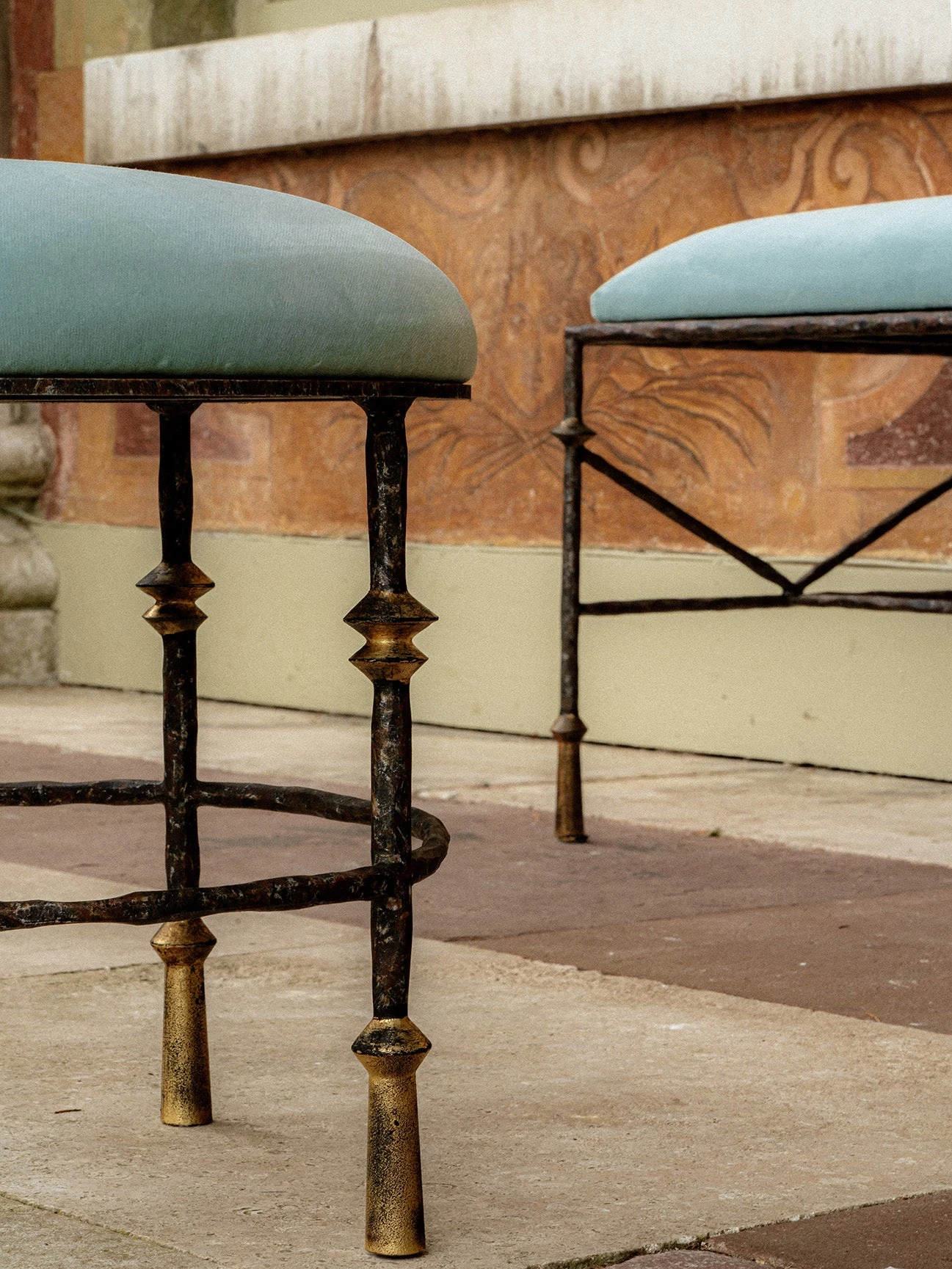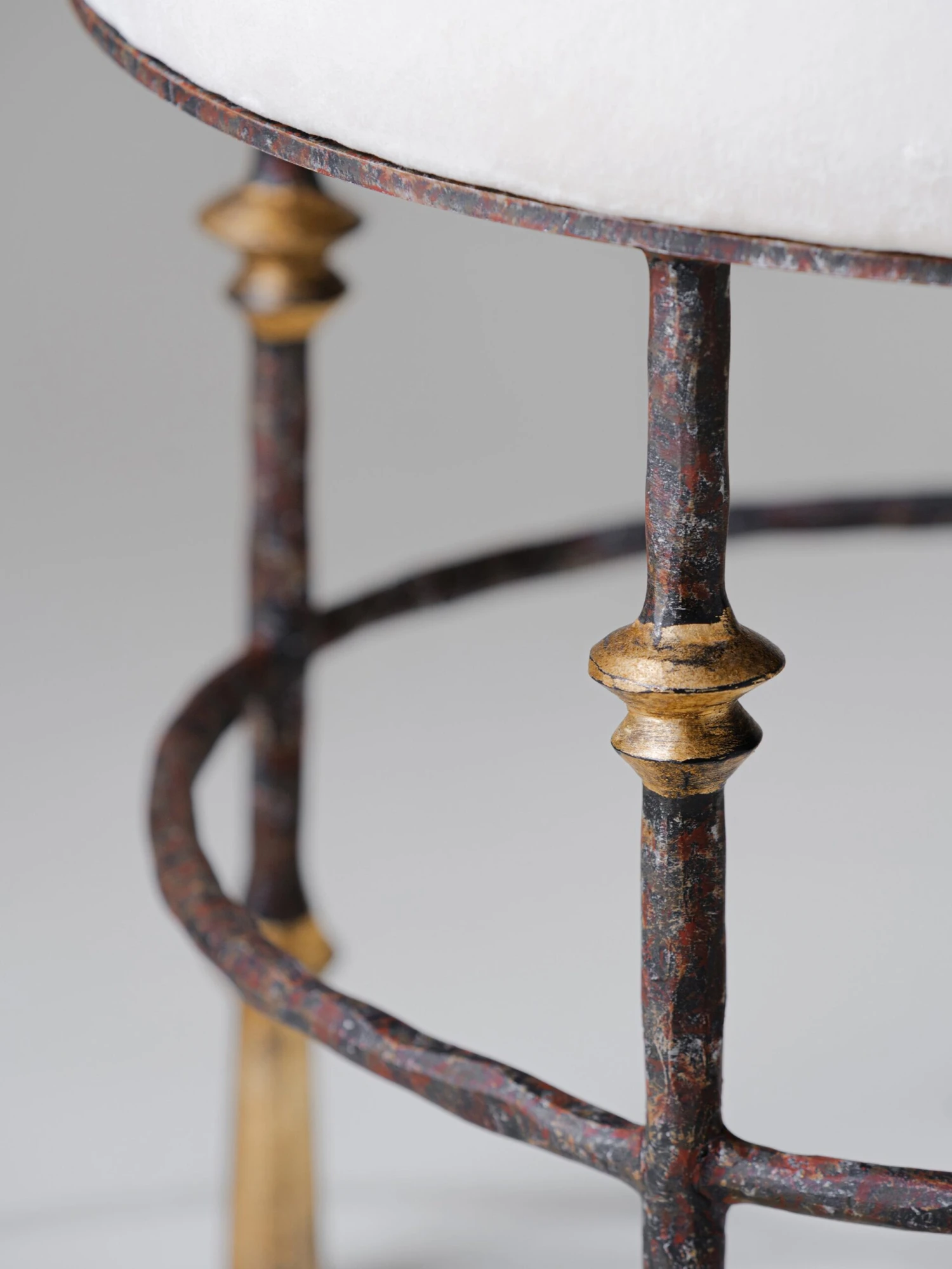 Characterised by a hand-beaten texture and distinctive conical-shaped feet, the Stanley round stool is inspired by the furniture designs of Diego Giacometti and can be custom made in any size or painted finish of your choice. Shown here in Old Rust with Gold. View the Stanley family here.