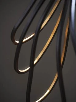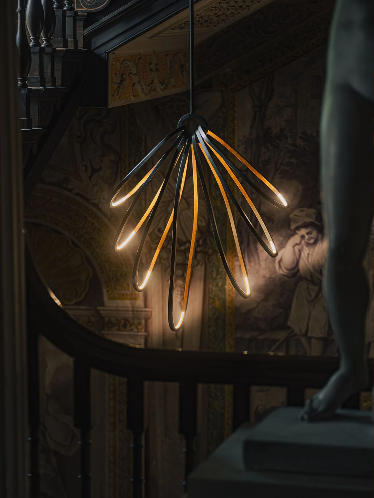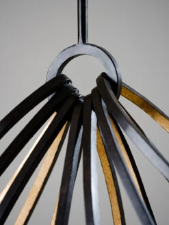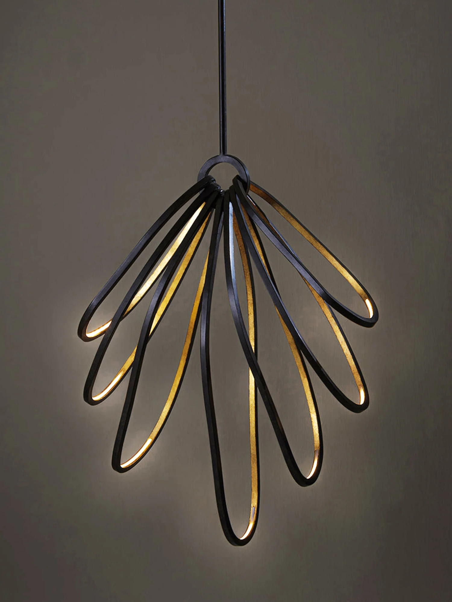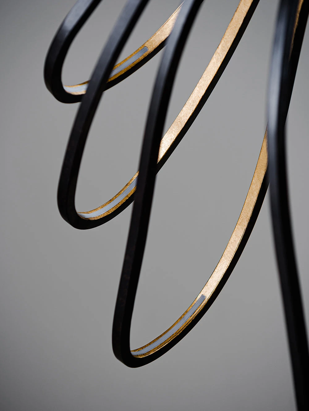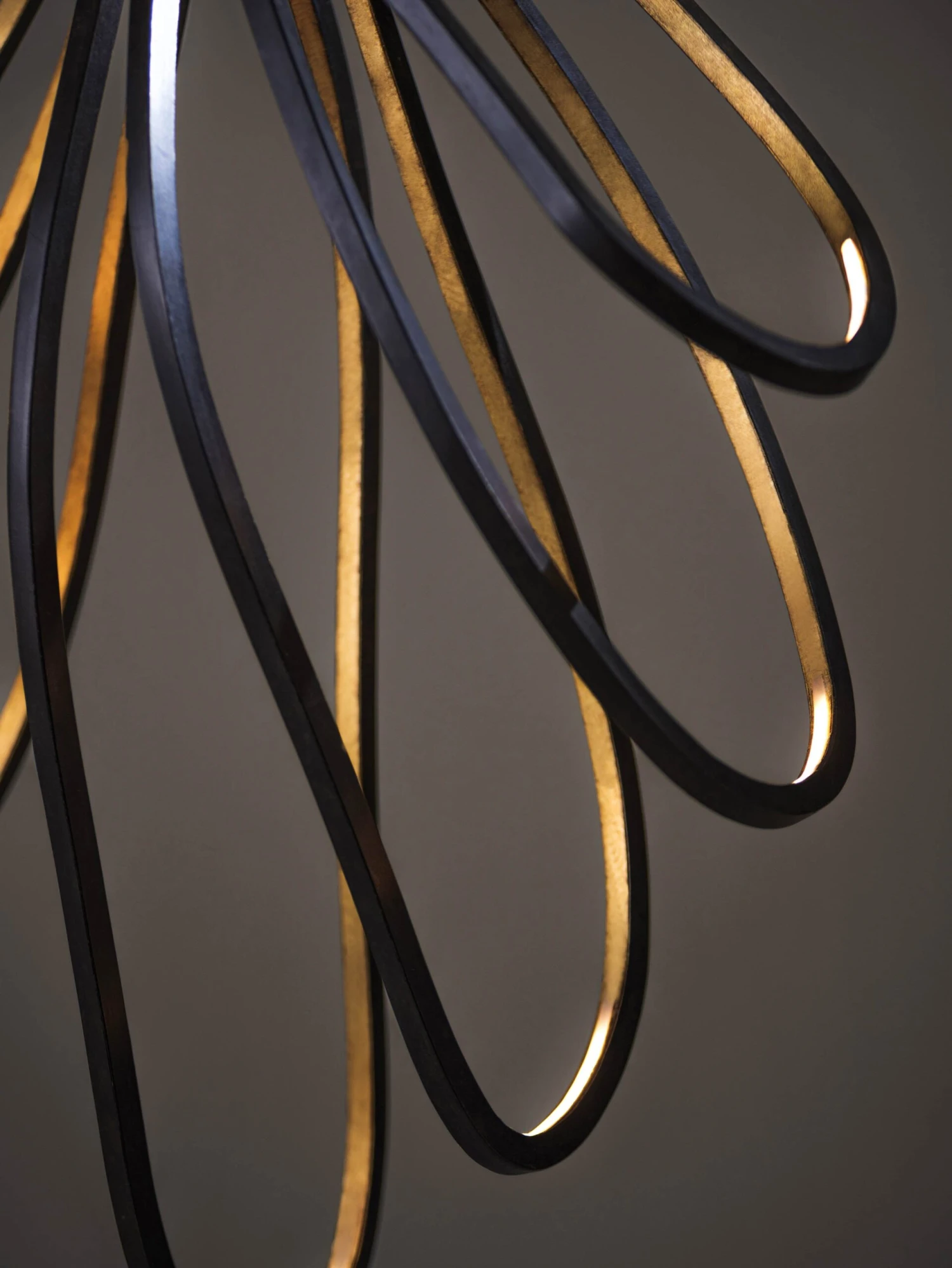A stunningly sculptural and technically challenging design, the Sully ceiling light is engineered from hand-formed, square profile steel. A recess is created in the bottom radius to create an uplight and hand-painted with Bright Gold to reflect the light. A Bronzed painted finish is then applied to the outside to provide further contrast. Also available in any painted finish of your choice.