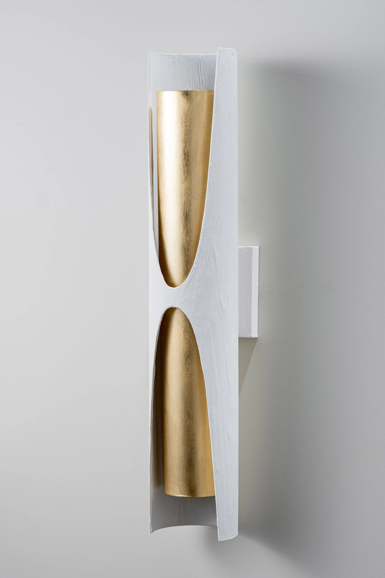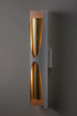 The Thera wall light large, new for Spring 24. Inspired by iconic 20th century sculptural forms, the Thera designed by Gareth Devonald Smith creates a soft light and striking silhouette. Also available as a chandelier and small wall light.