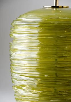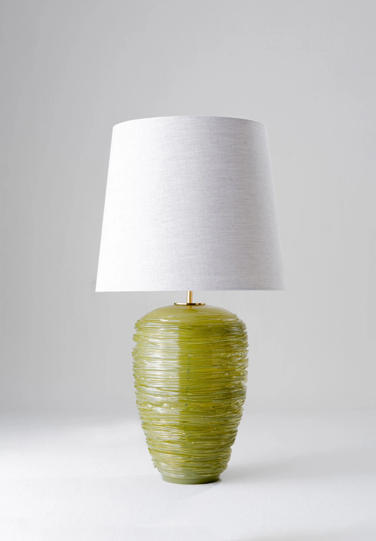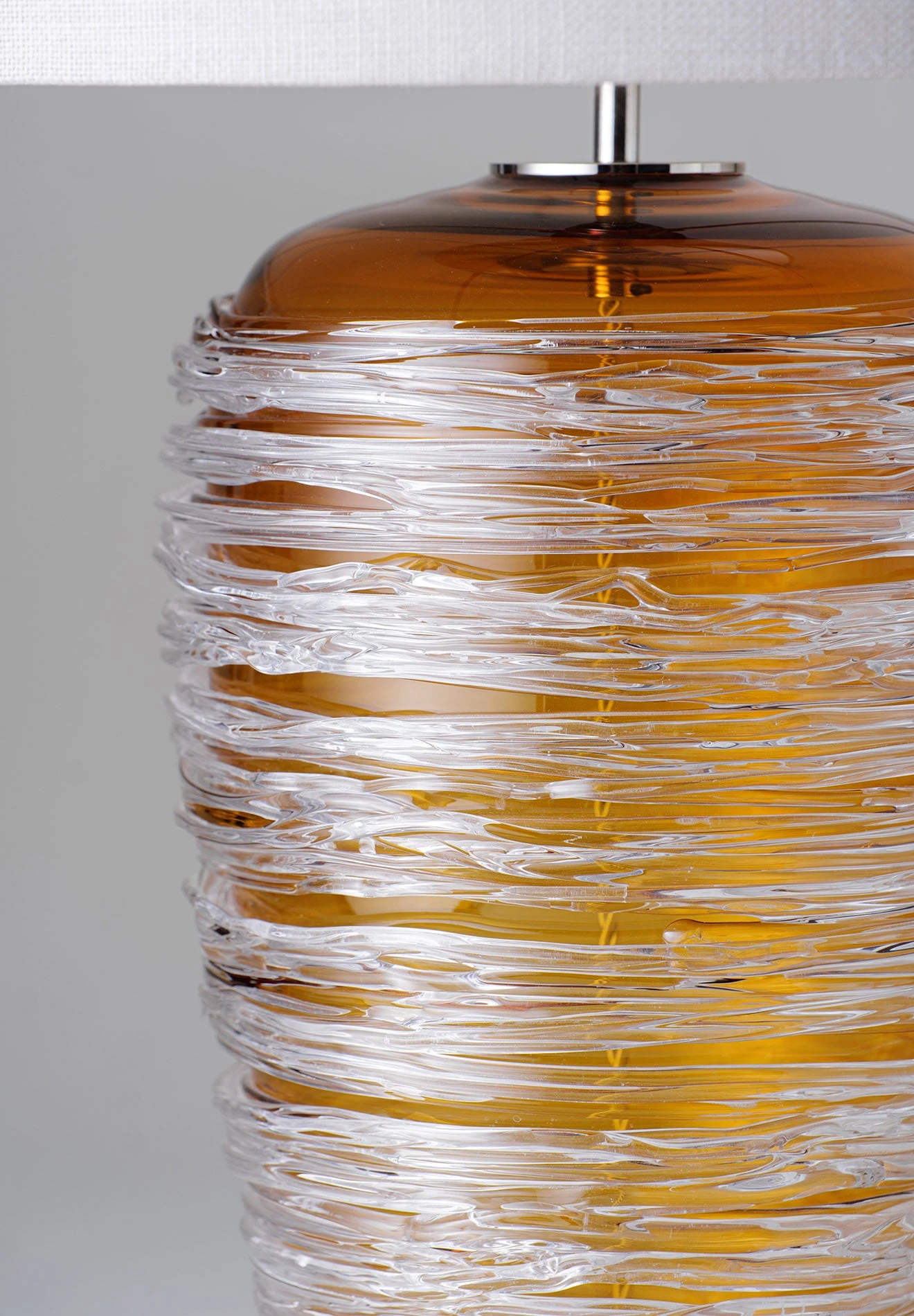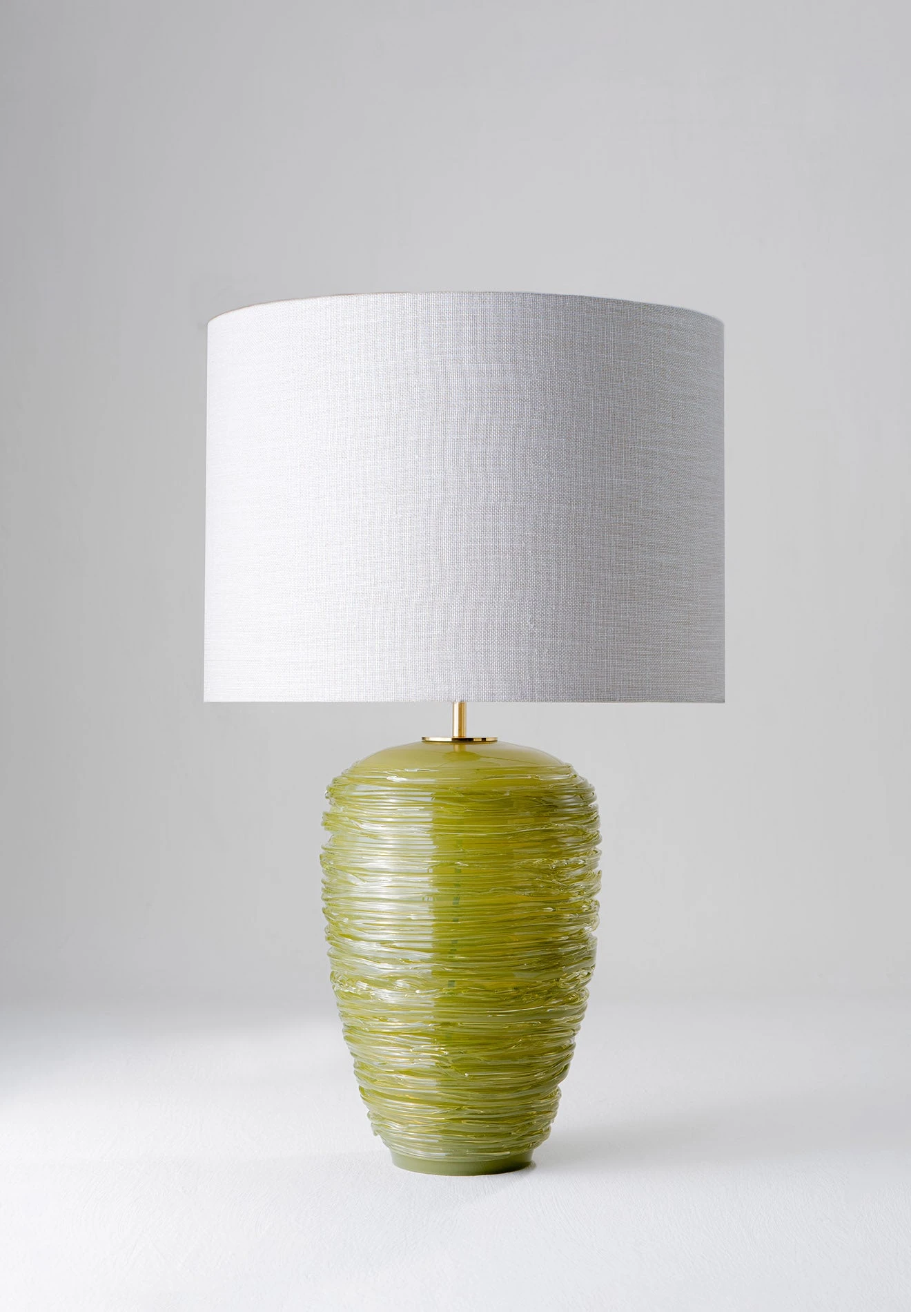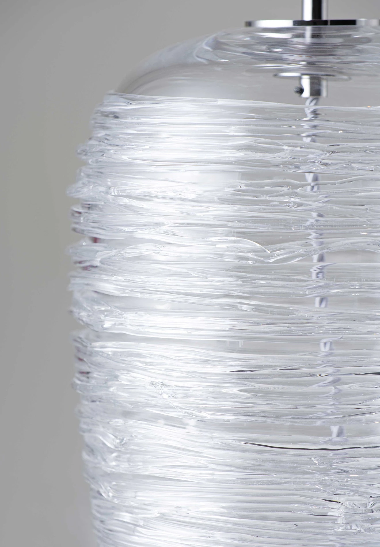 The Thread Lamp is an over-scaled hand-blown glass piece. Due to the glass-blowing technique, each piece’s threading is unique, and wraps around the entire glass body catching the light from above.