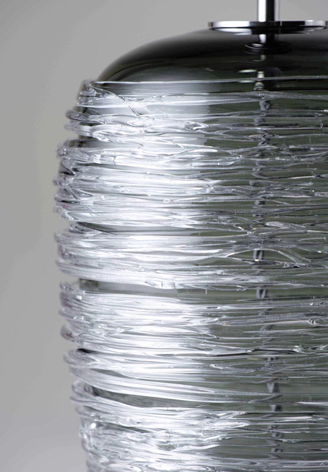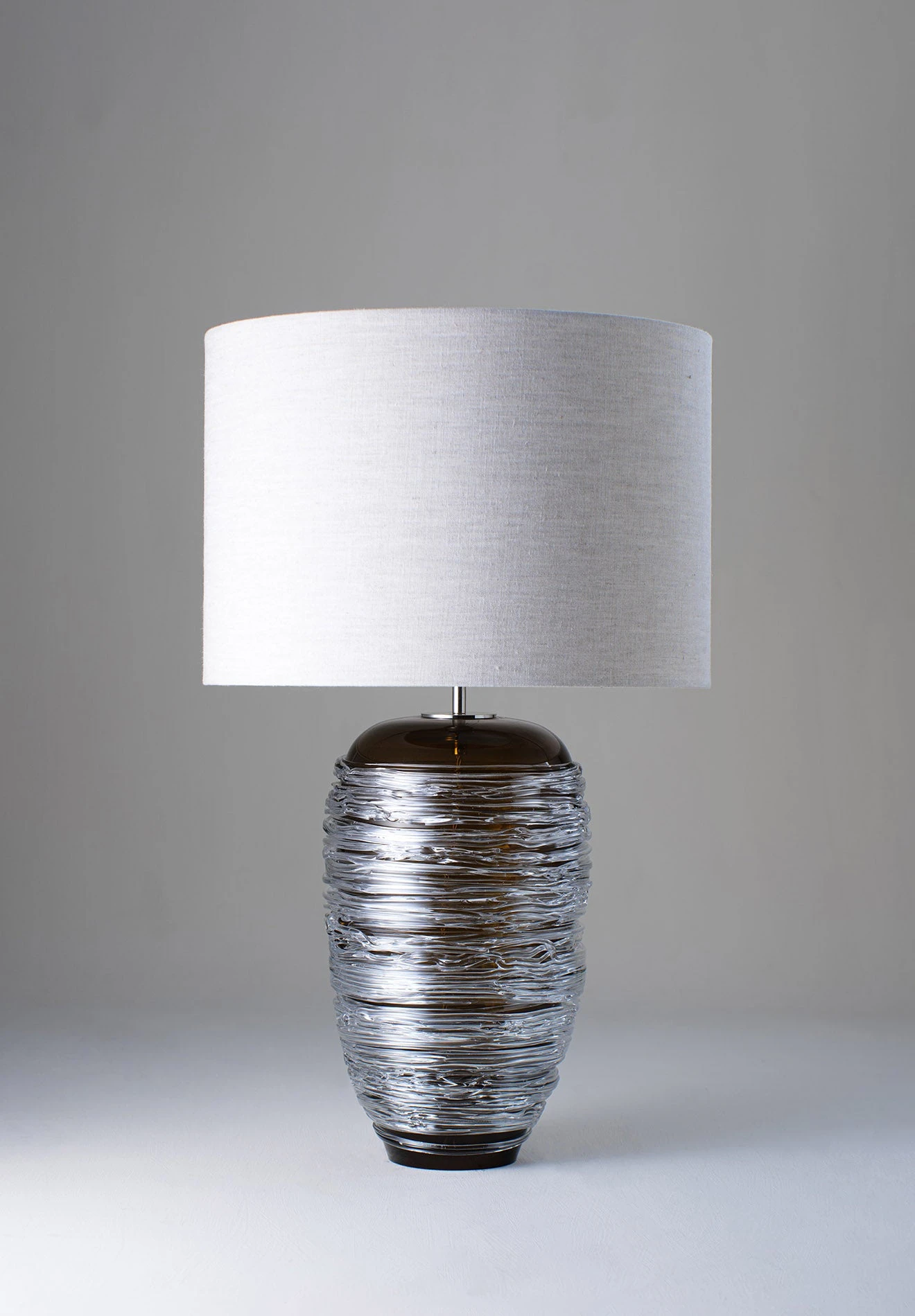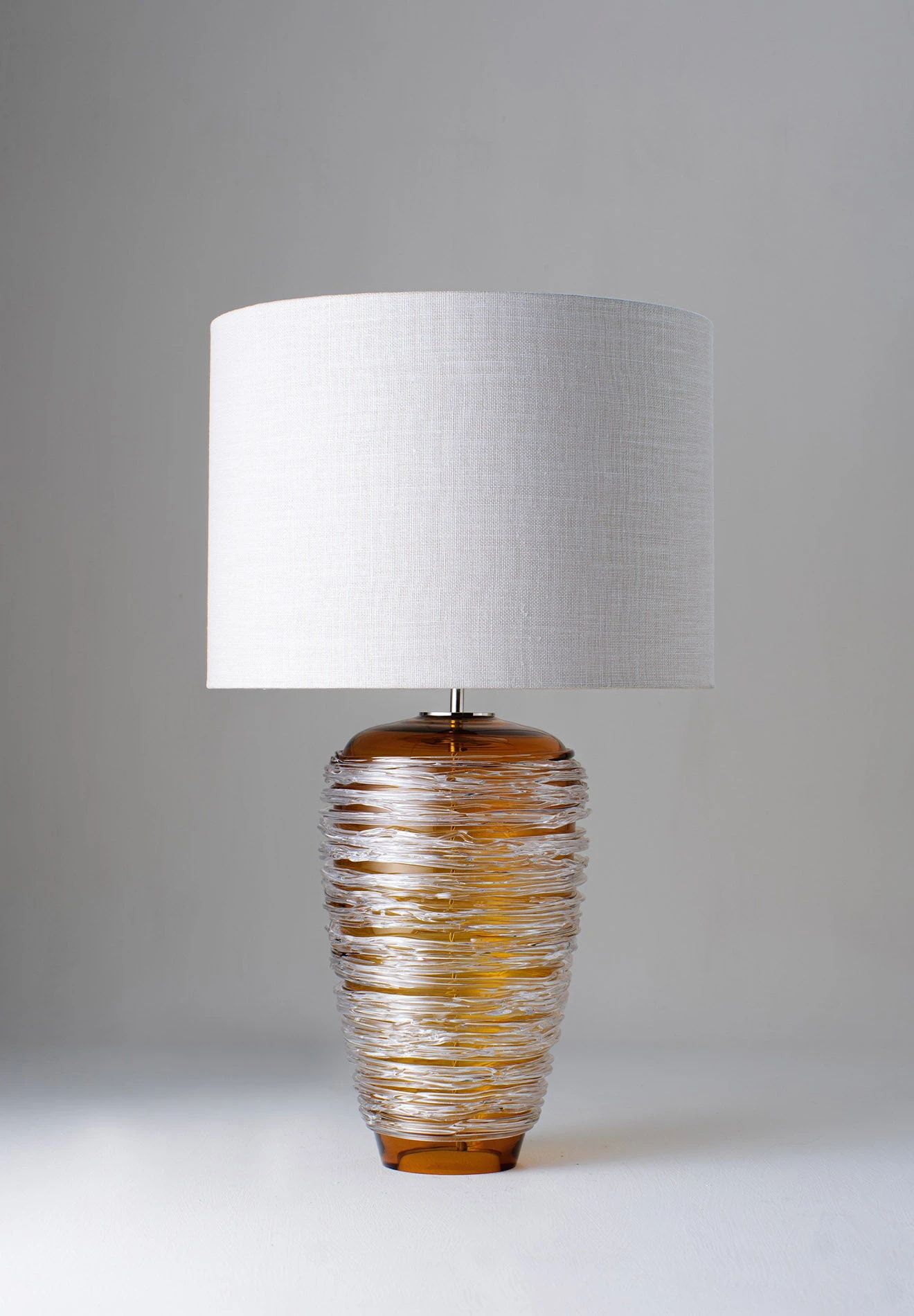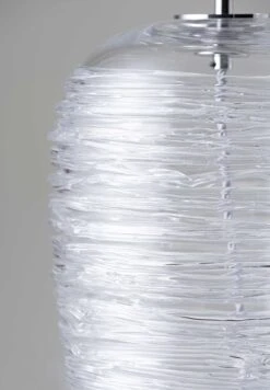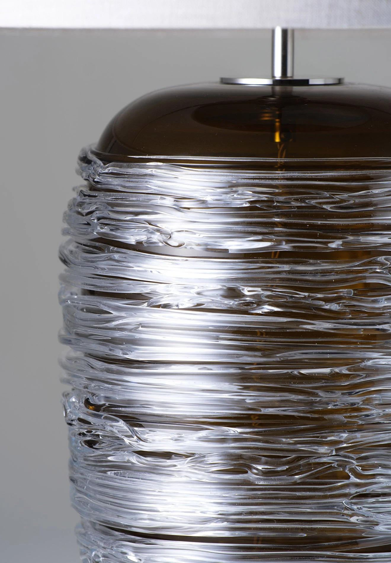 The Thread Lamp is an over-scaled hand-blown glass piece. Due to the glass-blowing technique, each piece’s threading is unique, and wraps around the entire glass body catching the light from above.