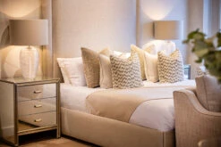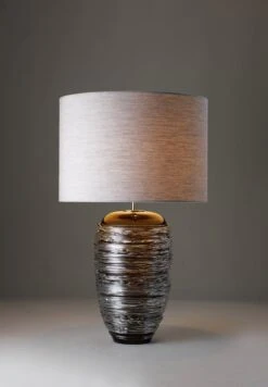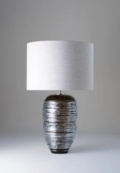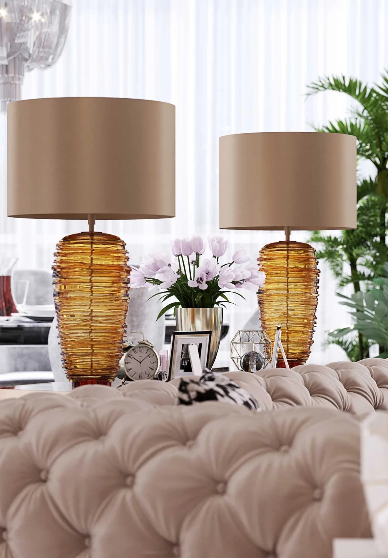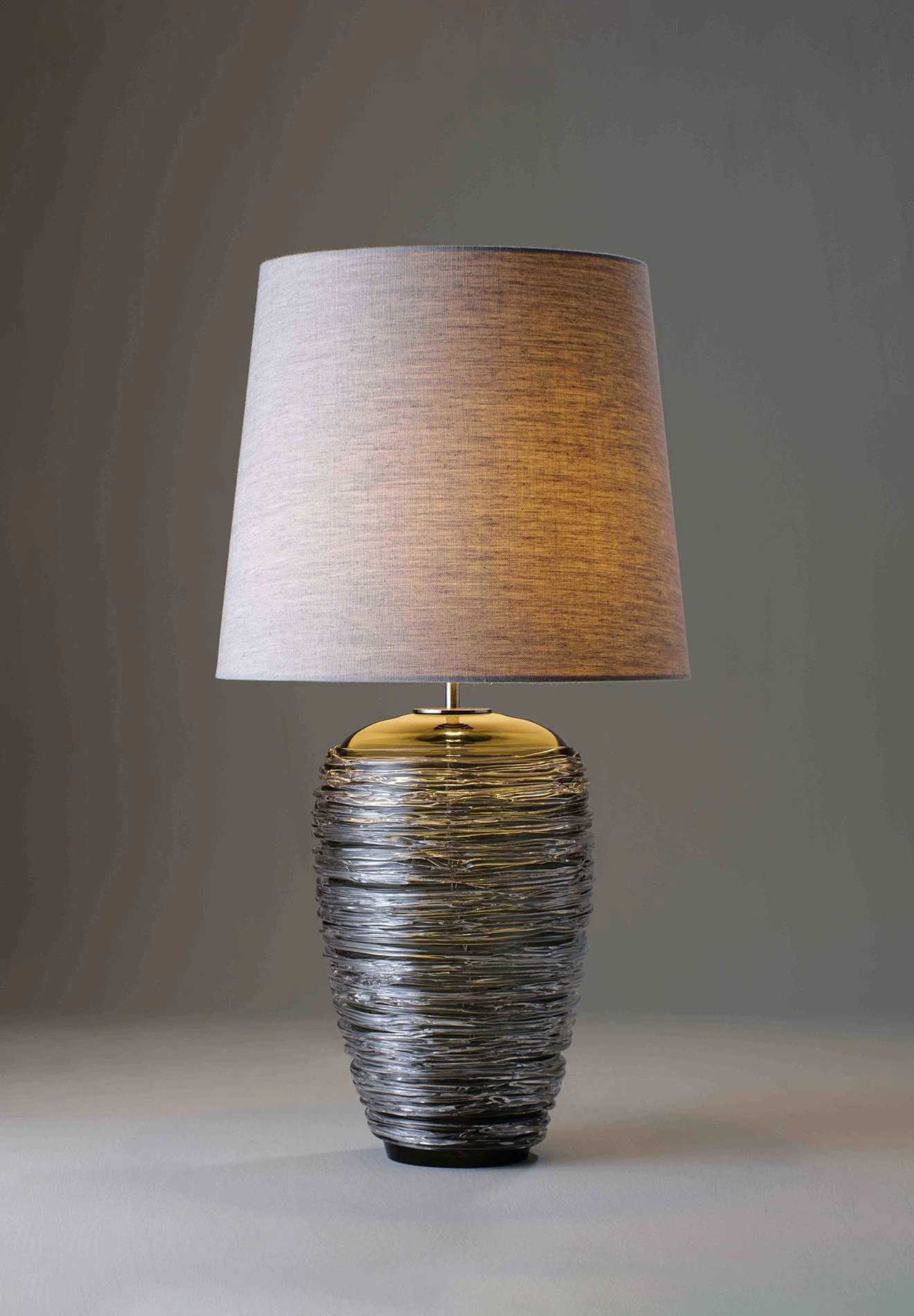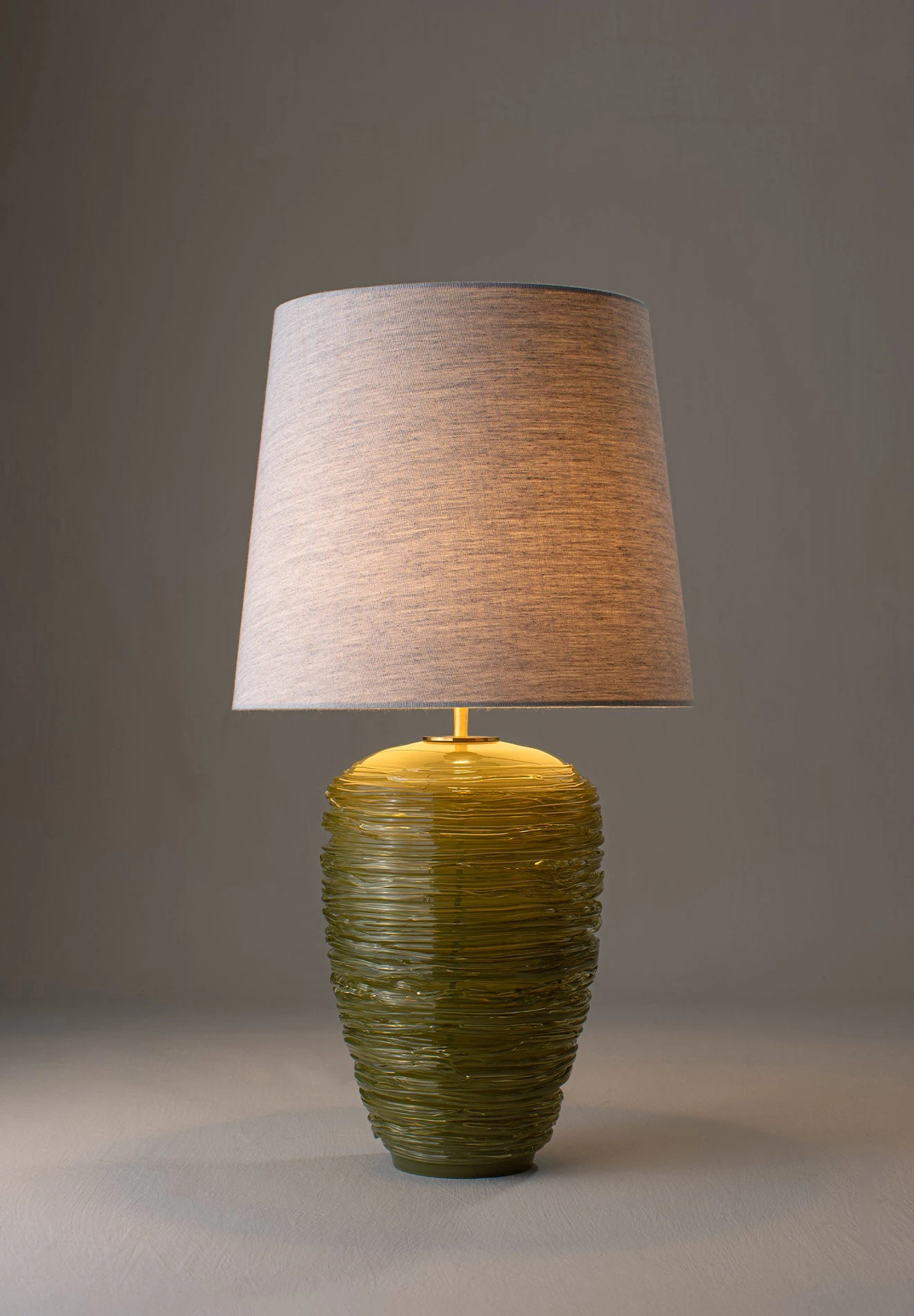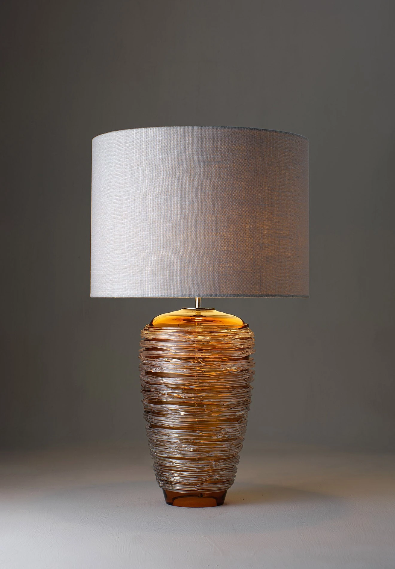 The Thread Lamp is an over-scaled hand-blown glass piece. Due to the glass-blowing technique, each piece’s threading is unique, and wraps around the entire glass body catching the light from above.
